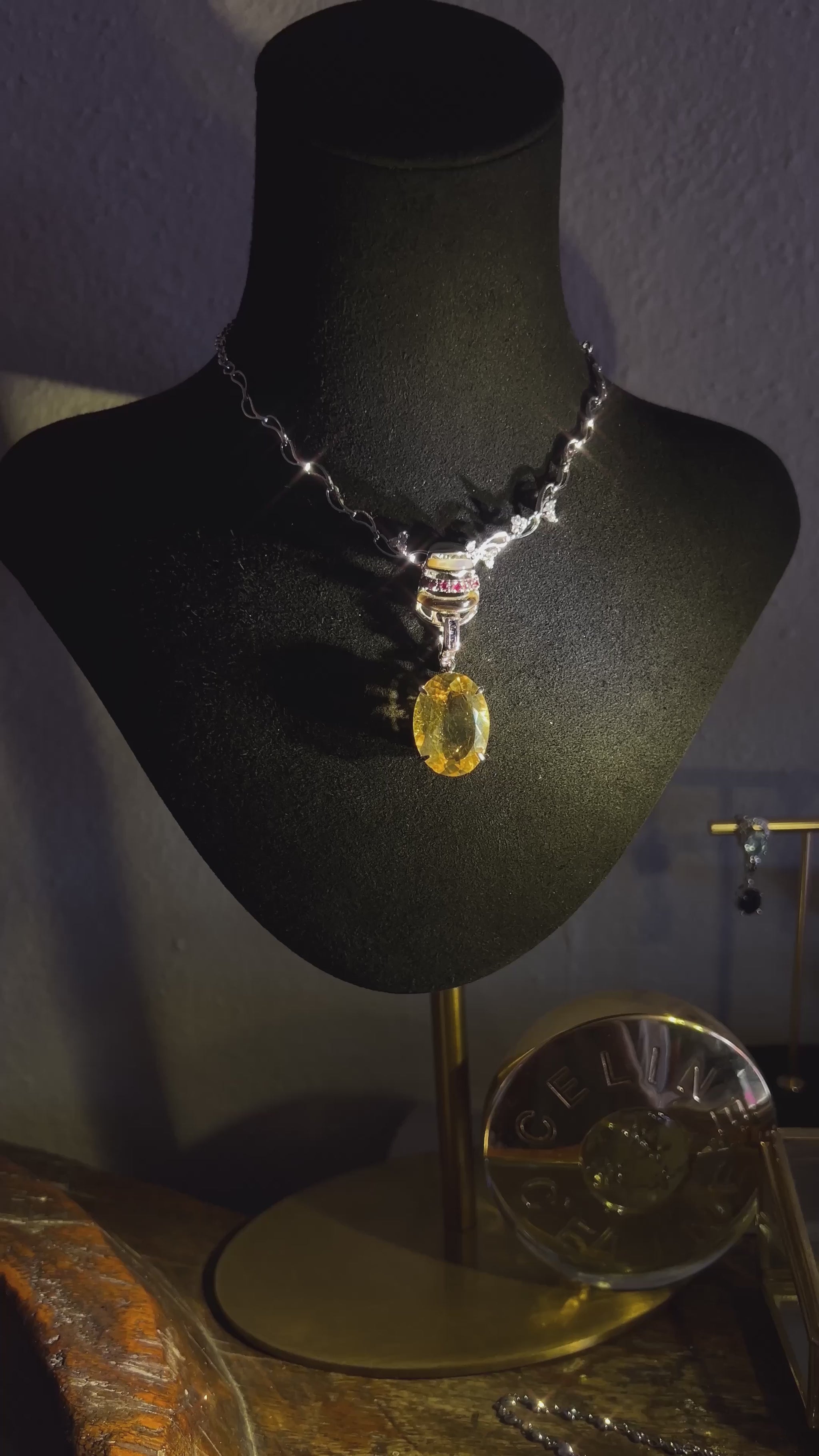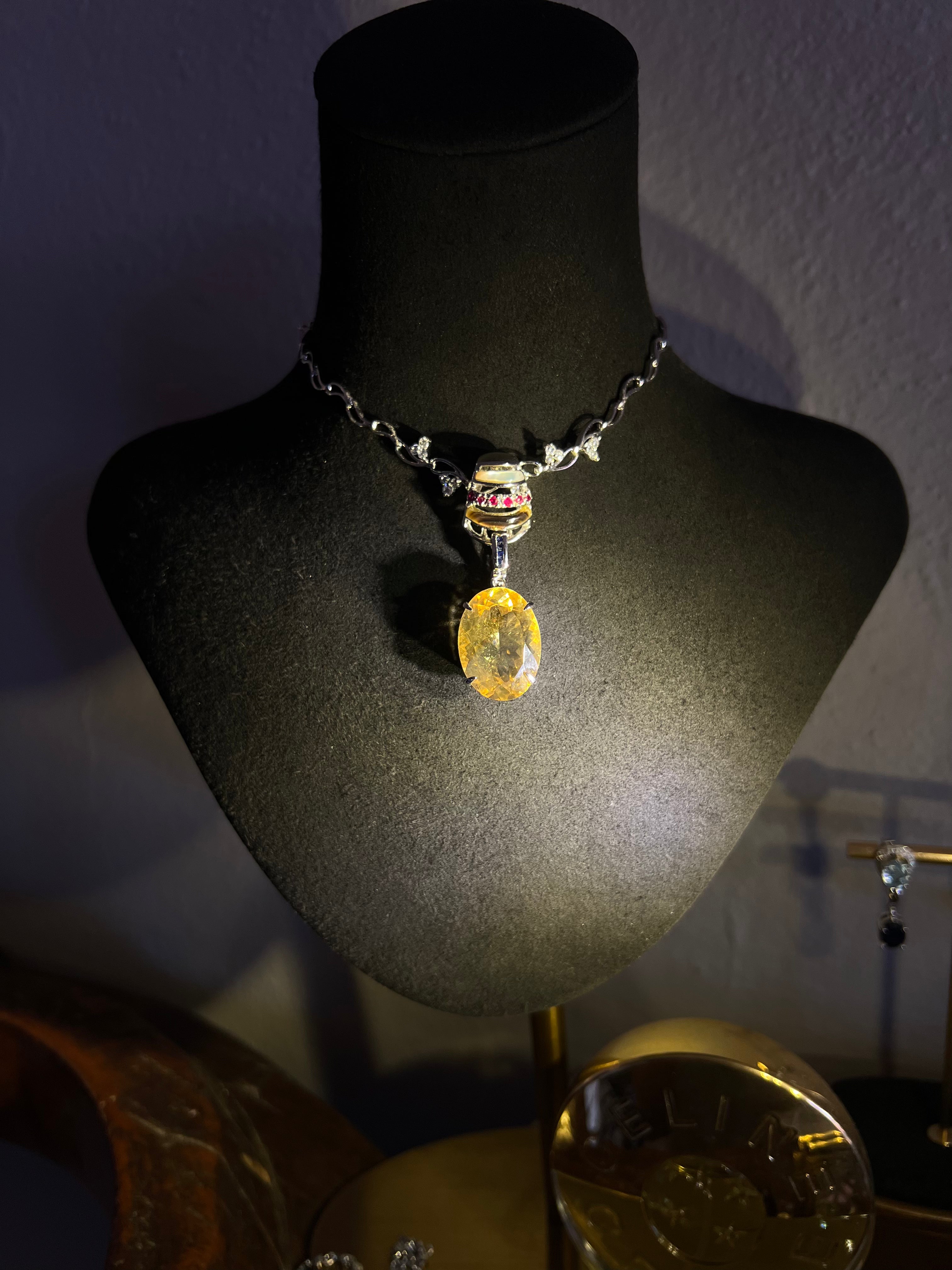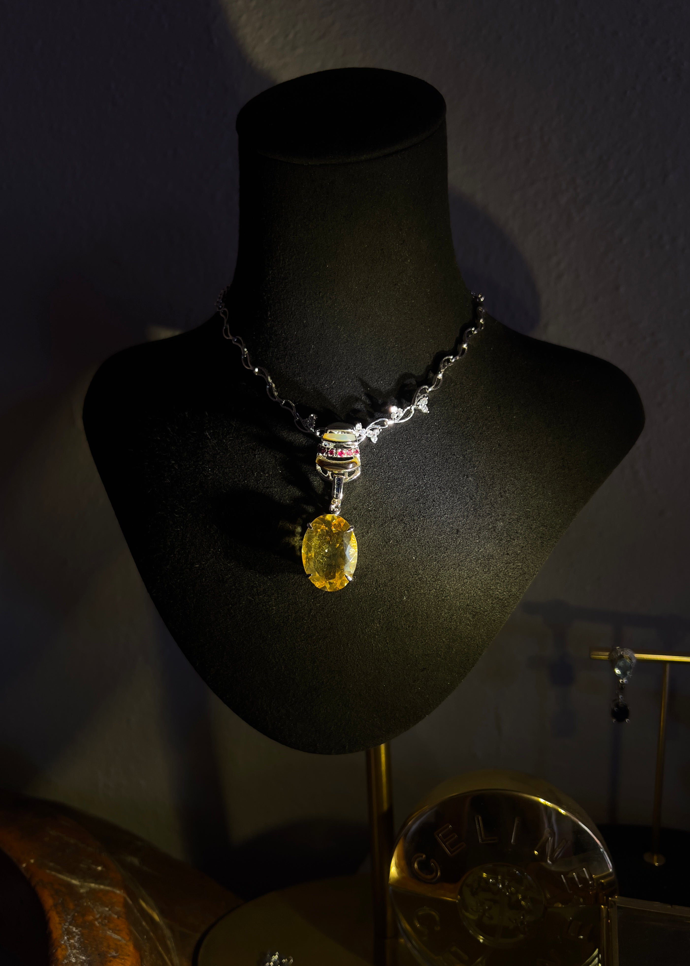 Imagine the golden hour, that fleeting moment when the sun dips low and bathes the world in a warm, golden glow. This natural citrine statement necklace was inspired by that magical time of day. The centerpiece is a radiant citrine gemstone, its vibrant yellow hue reminiscent of sunlight reflecting off a quiet lake, warm and luminous.