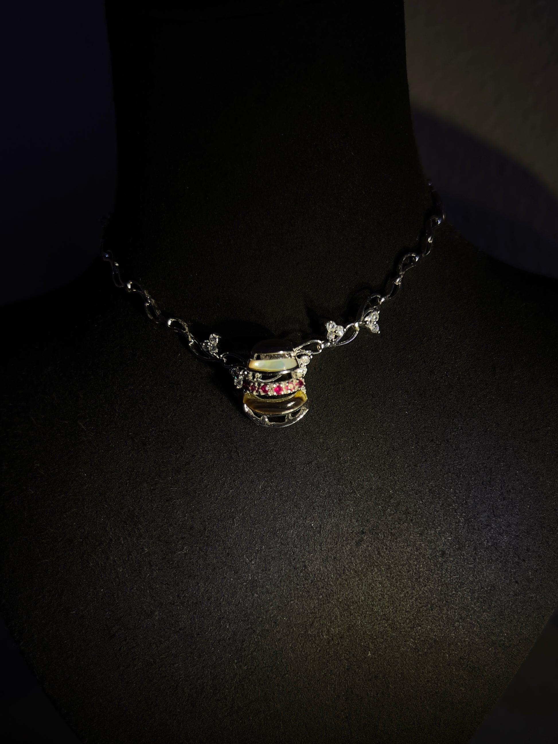 The ruby accents add a touch of fiery passion, just like the final burst of color in the sky before twilight. Suspended on a unique chain that evokes the gentle play of shadows and light, this necklace is a celebration of nature’s most breathtaking moments.