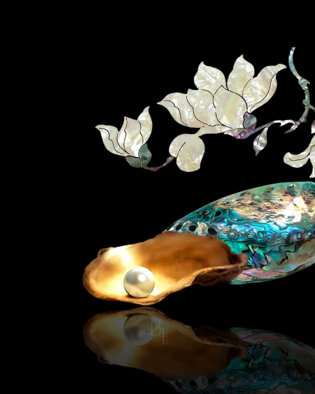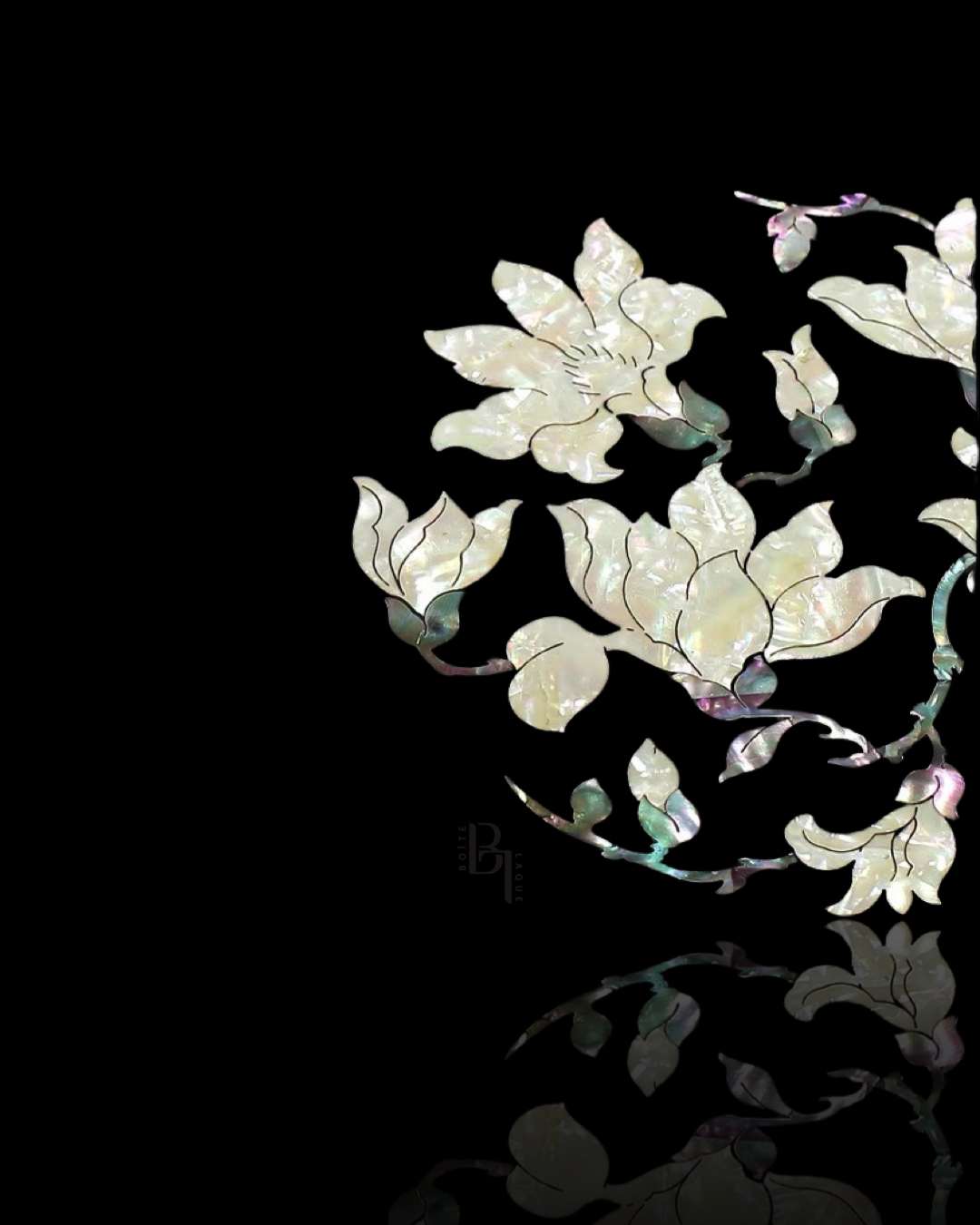 - Mother of pearl from New Zealand and Wood & Black Lacquer