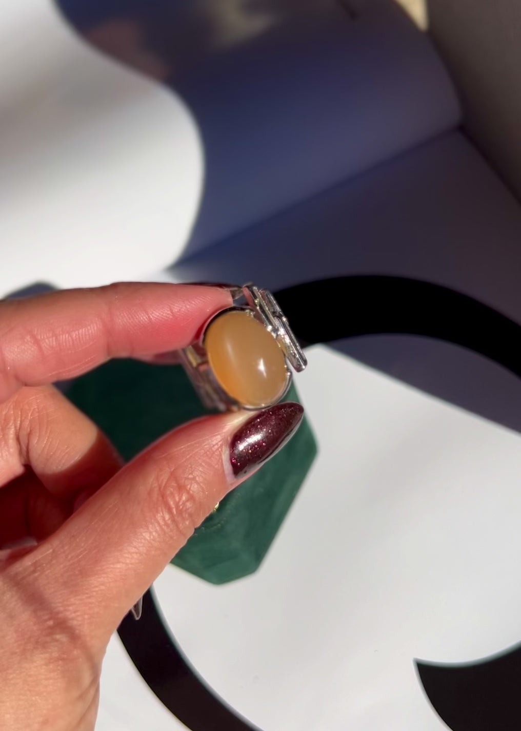 Experience the mesmerizing beauty of this 12 carat Pomelo Cat's Eye Moonstone Cabochon Cocktail Ring. Its lustrous butterscotch hue and unique cat's-eye effect exude sophistication and exclusivity, making it the perfect addition to any modern design. As it glimmers and glows, it adds a radiant touch to your look.
