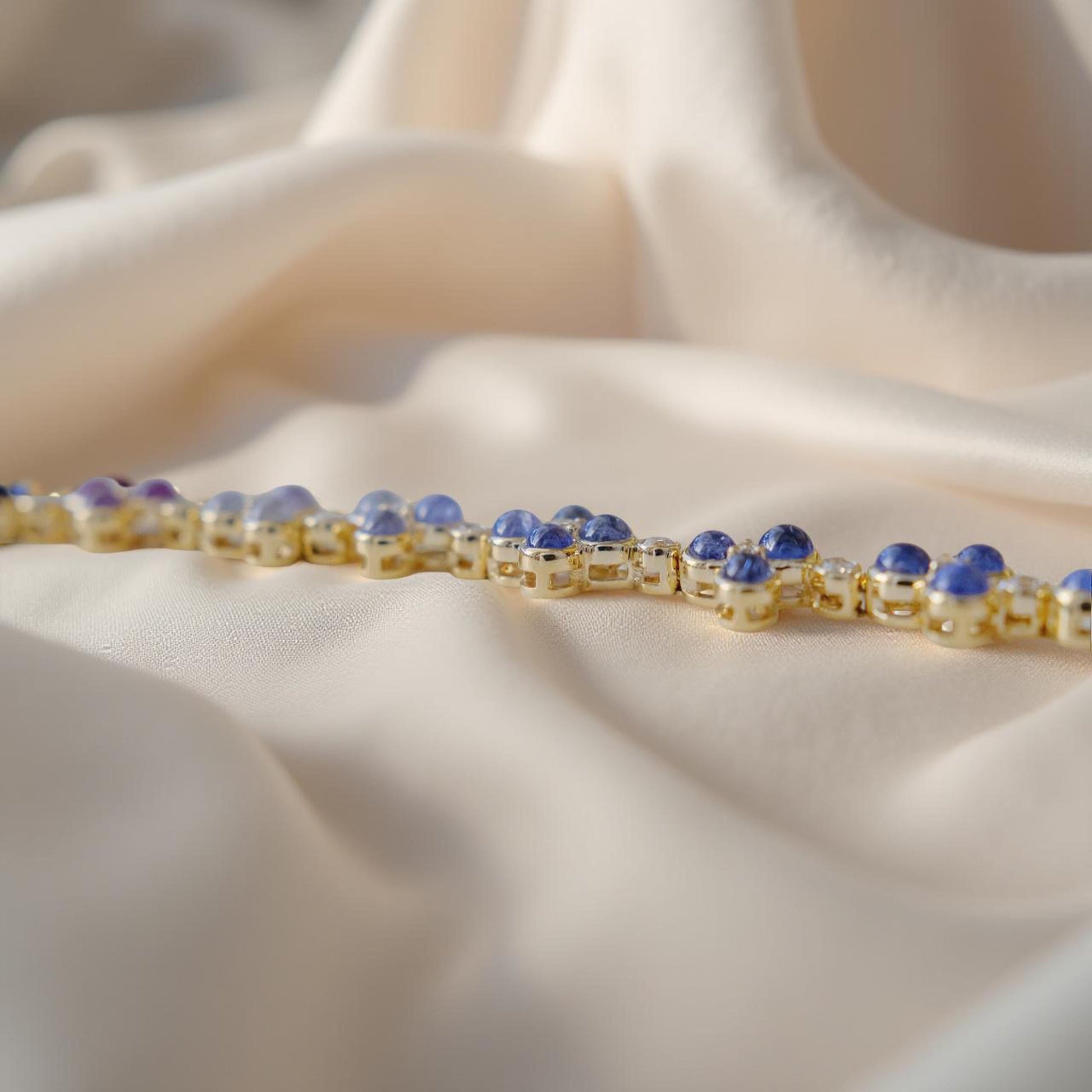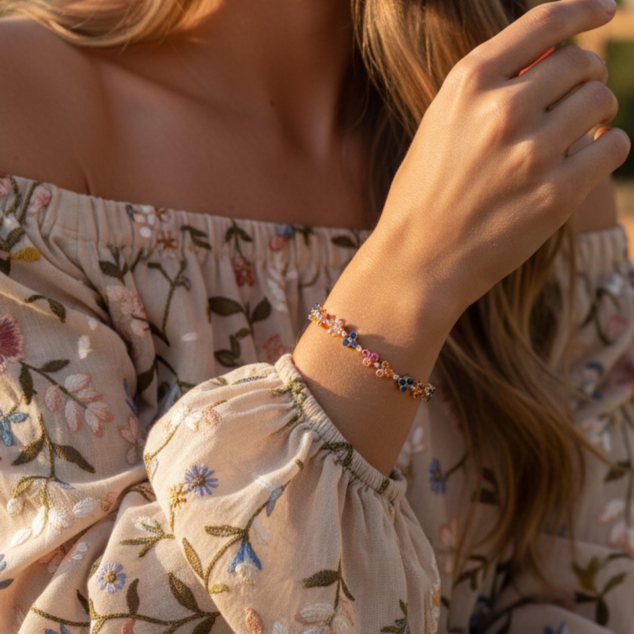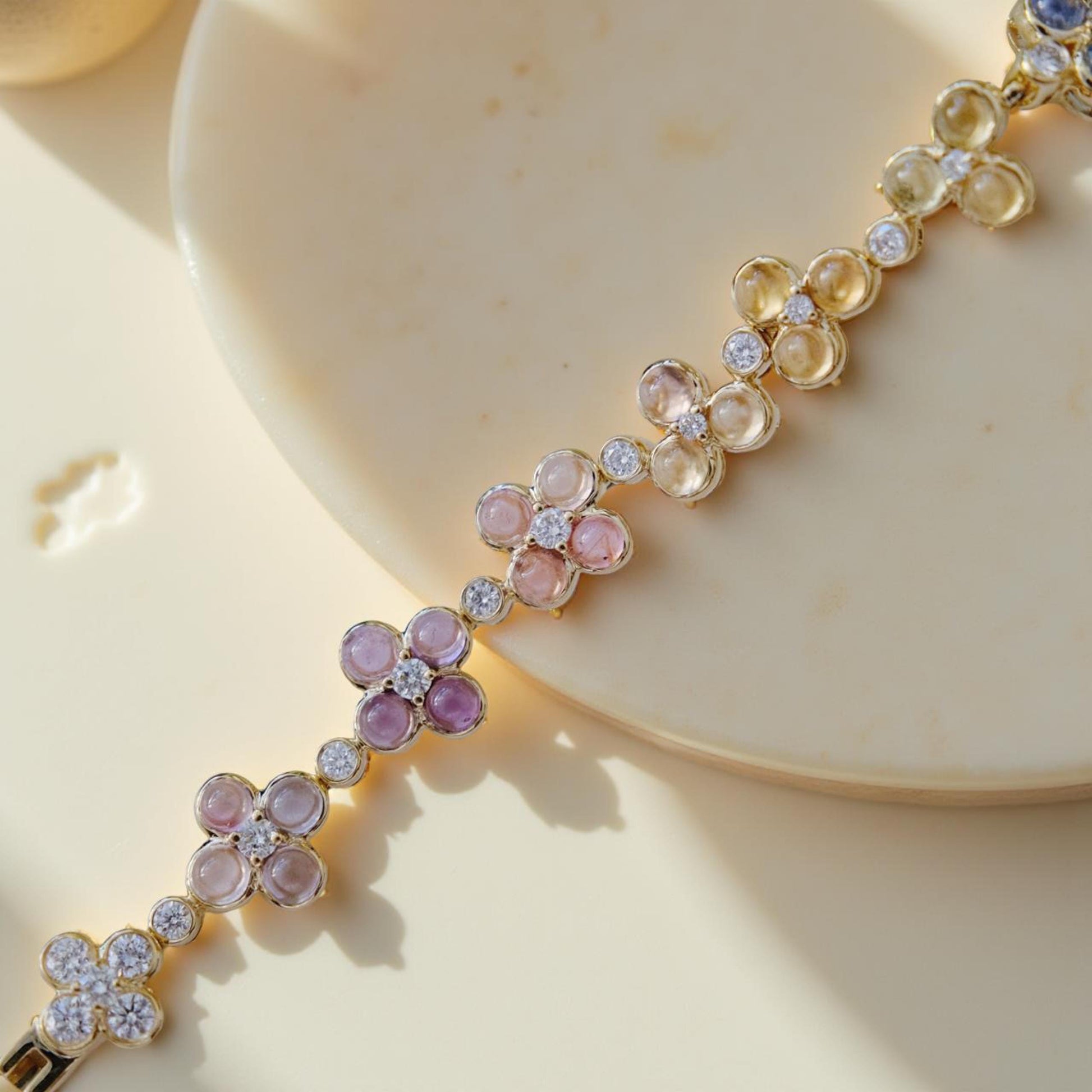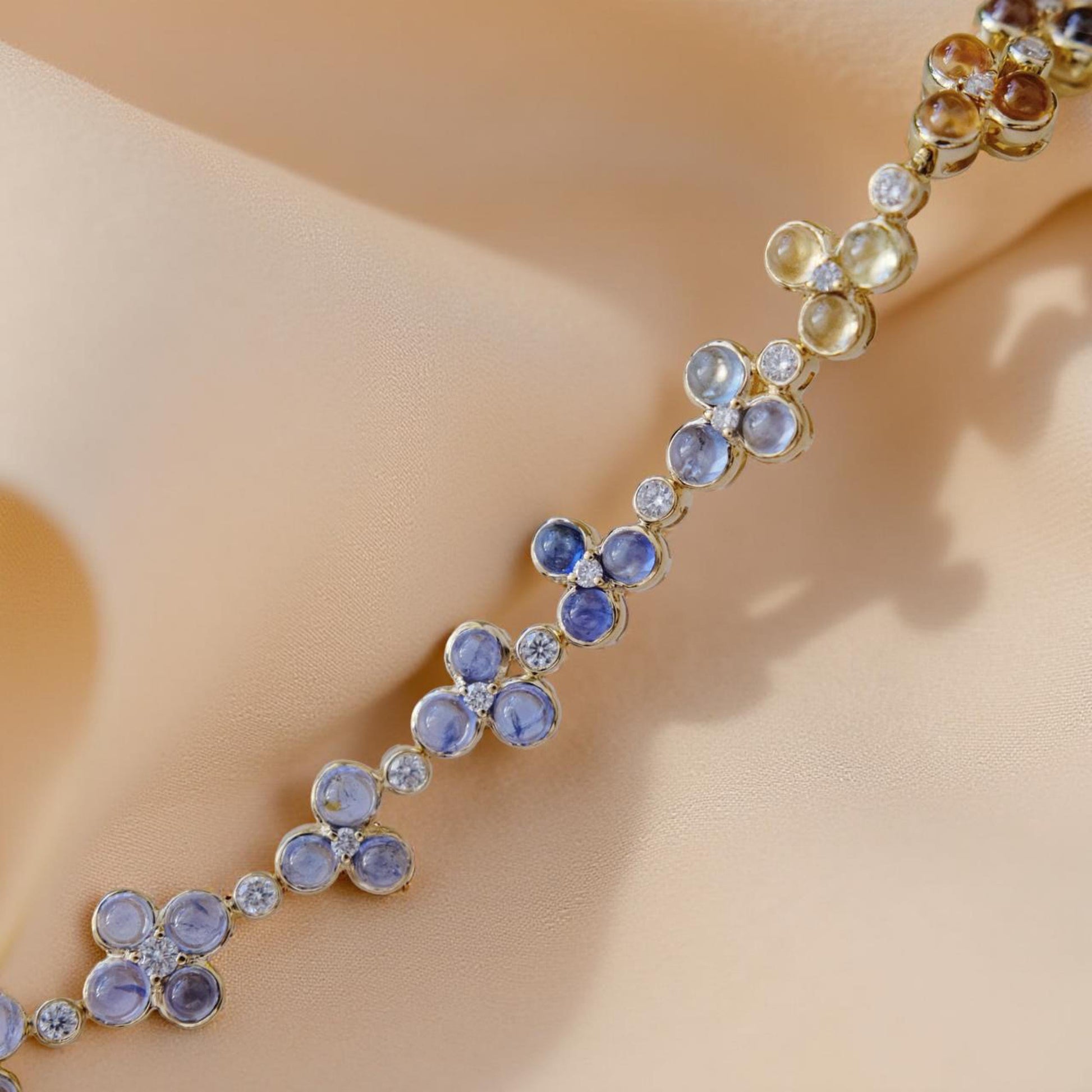 Handcrafted in 14k solid gold, this bracelet blooms with 6.72 carats of natural multi-color sapphires arranged in delicate floral clusters, each one symbolizing joy, freedom, and the beauty of nature. To enhance the brilliance, 0.65 carats of natural diamonds are set in between, creating a seamless flow of sparkle and color.