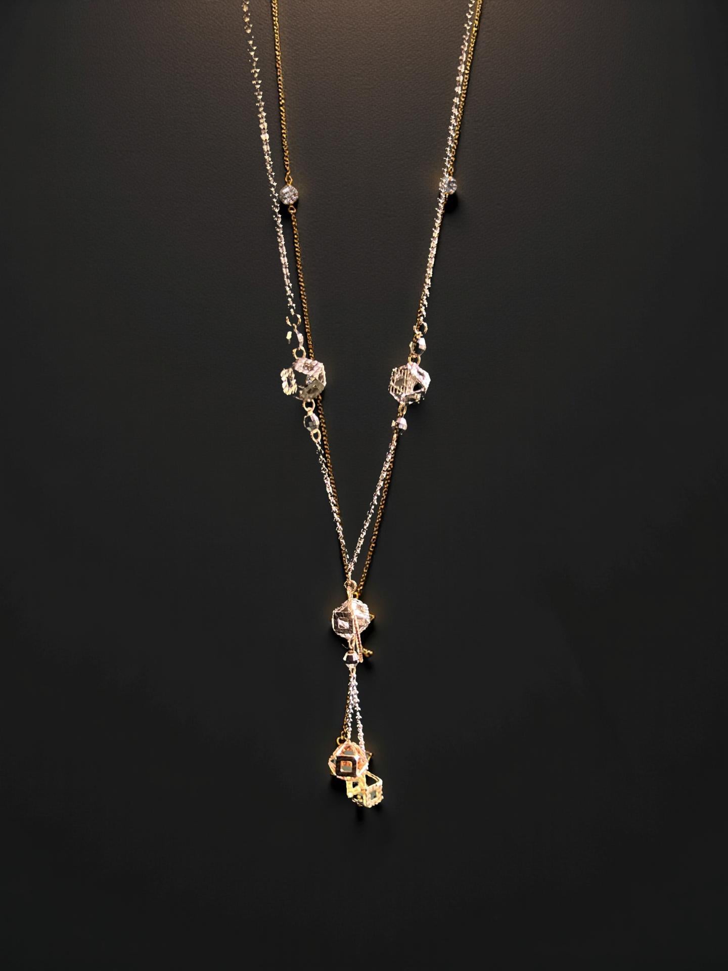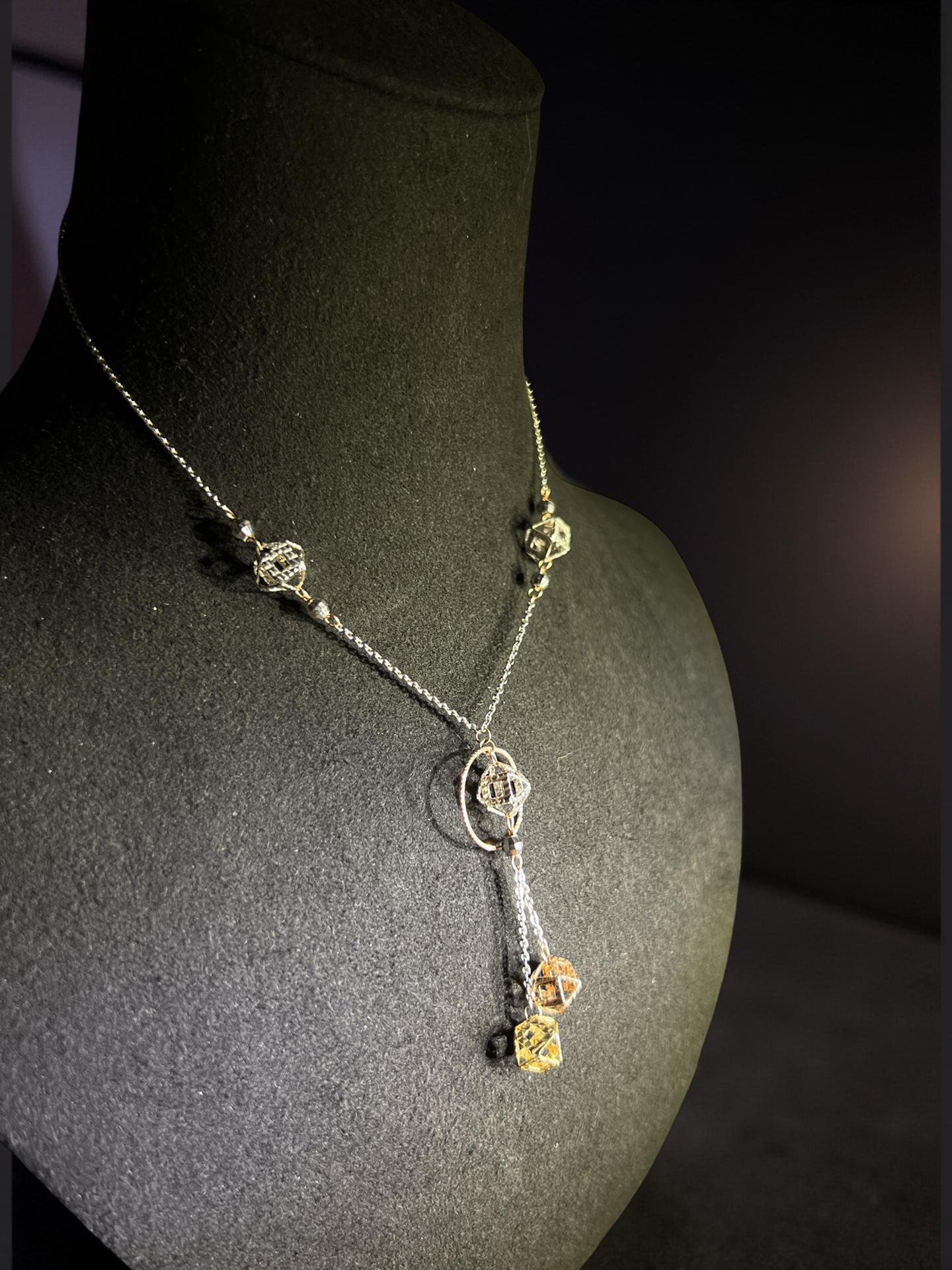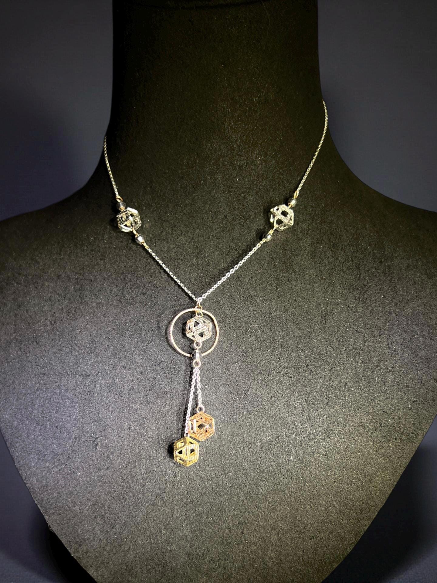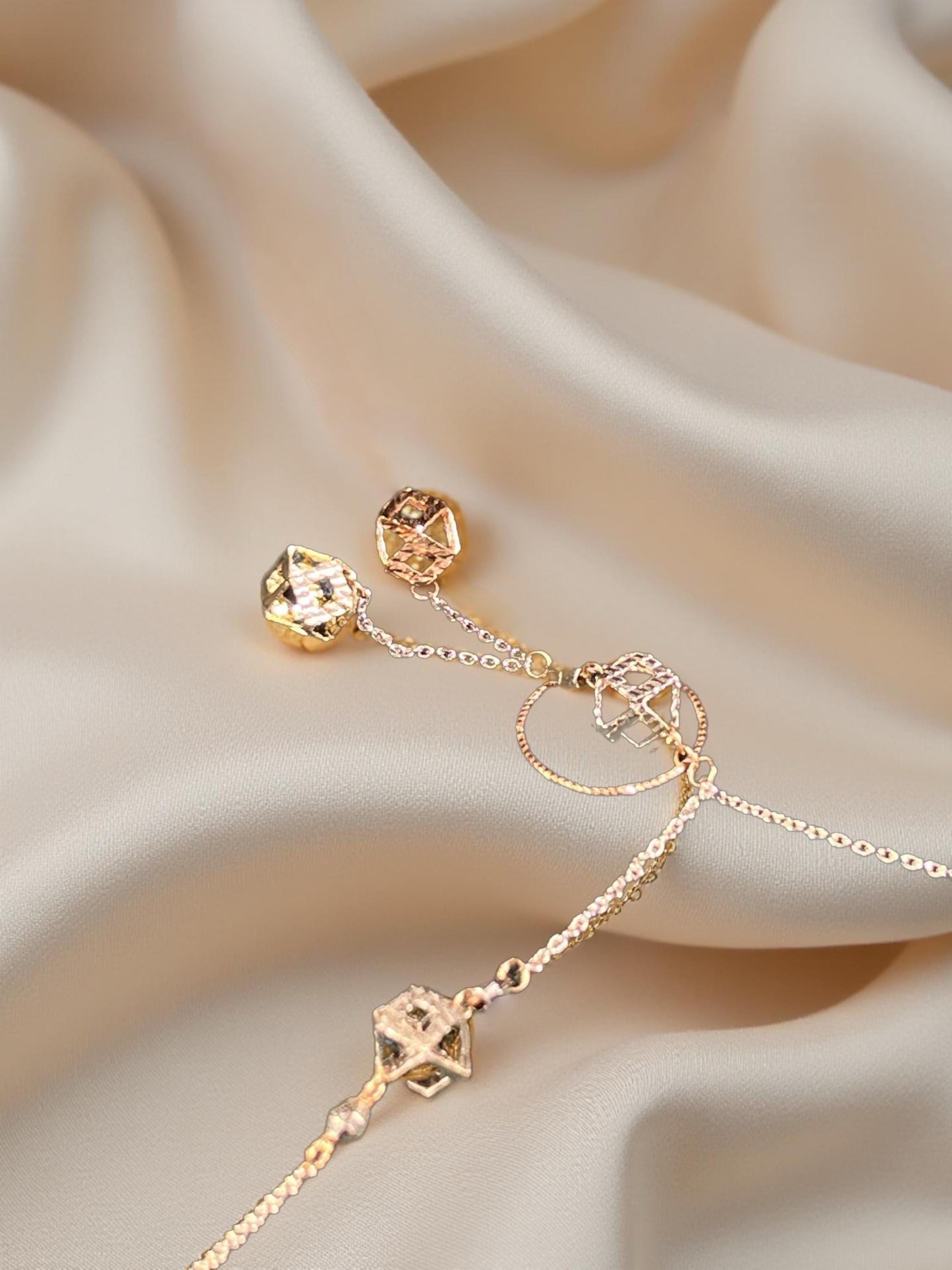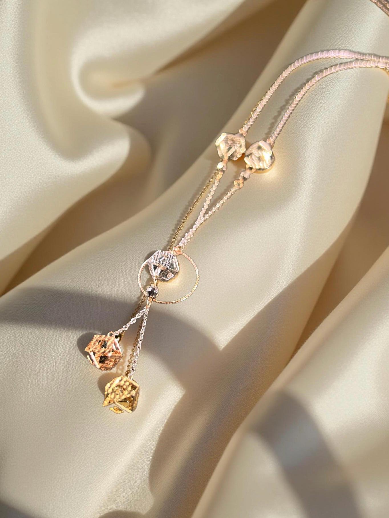 This elegant tri-color solid gold necklace blends timeless beauty with a modern twist—featuring white, rose, and yellow gold in perfect harmony. The geometric drop pendants catch the light from every angle, offering a soft shimmer that complements any skin tone.