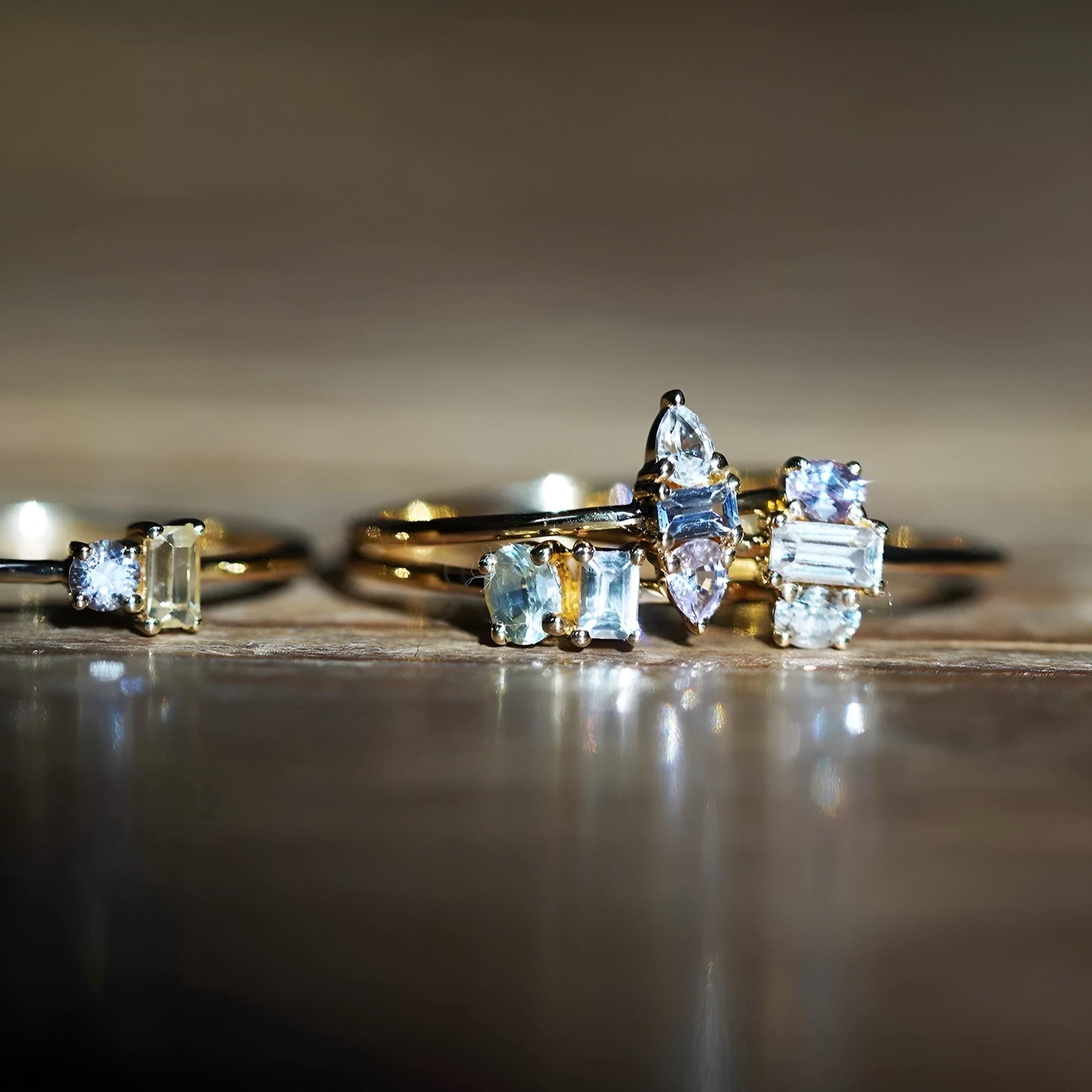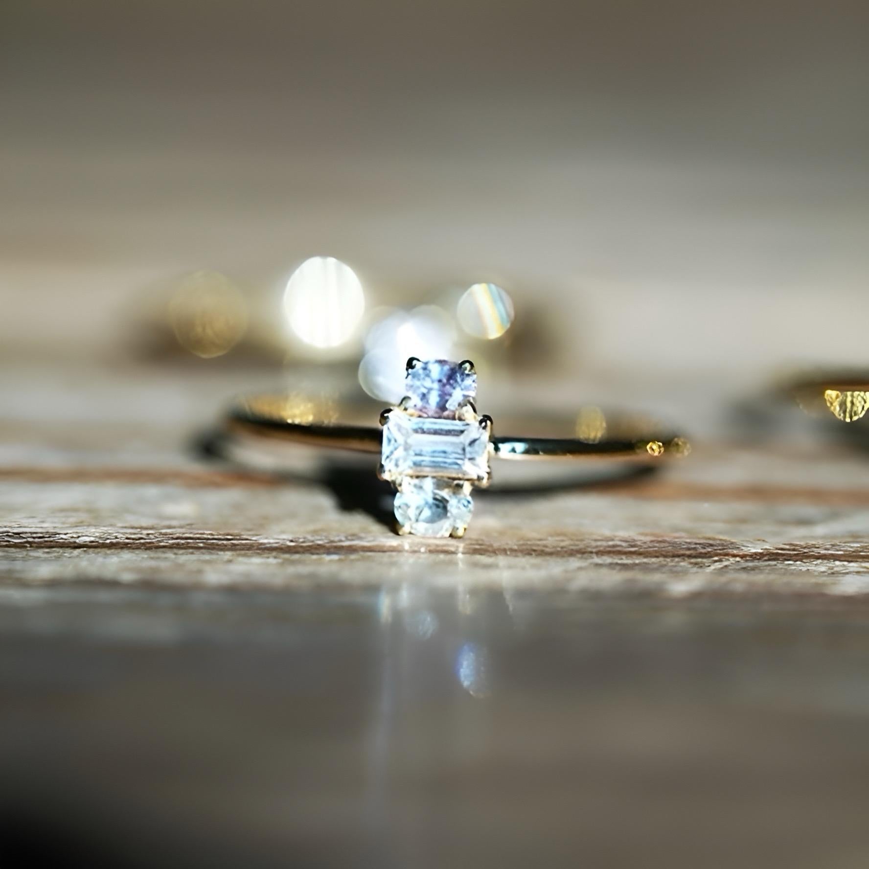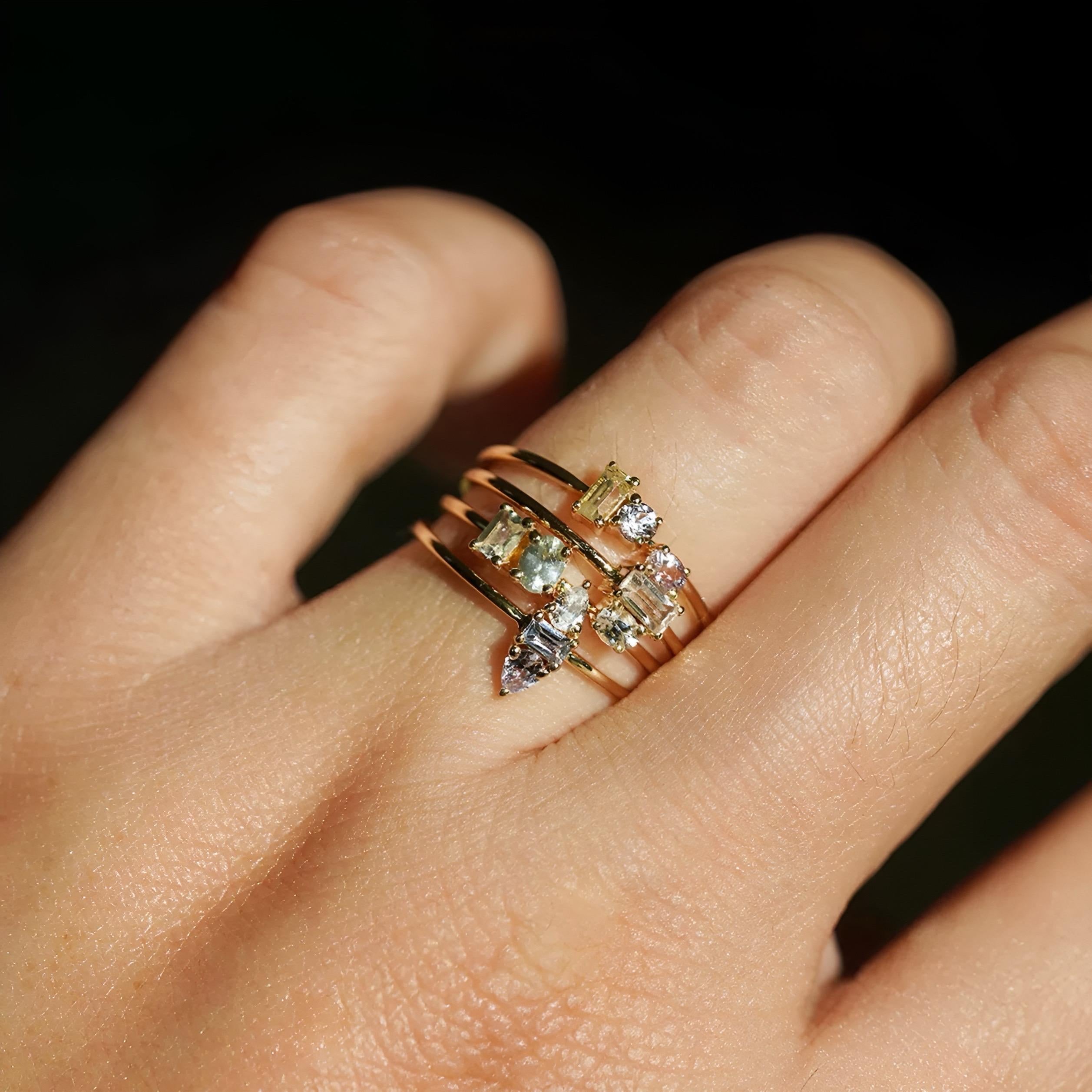 Each sapphire is carefully selected for its unique hue and clarity, ranging from clear to whispers of pastel pink, yellow, or blue undertones. These subtle shades feel like fleeting moments of dawn’s first light—a beauty that’s understated yet unforgettable. Handcrafted with 14K solid gold and adorned with precision-cut, natural sapphires from Sri Lanka, every ring is a unique treasure.