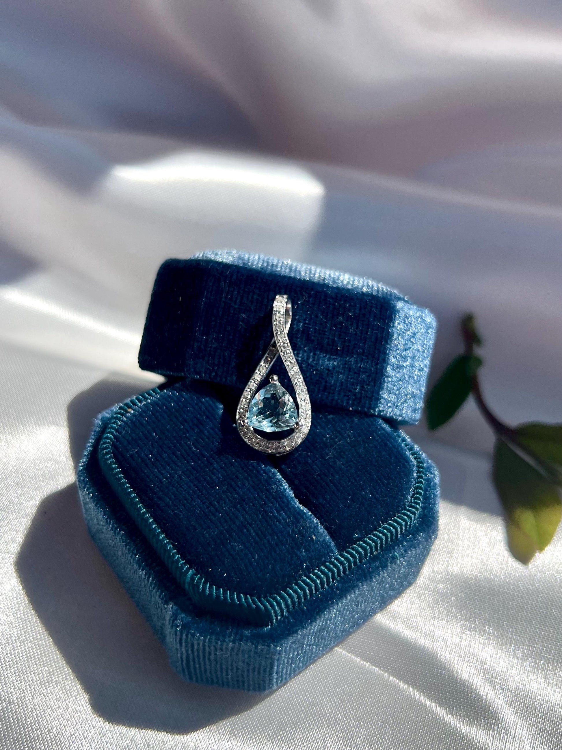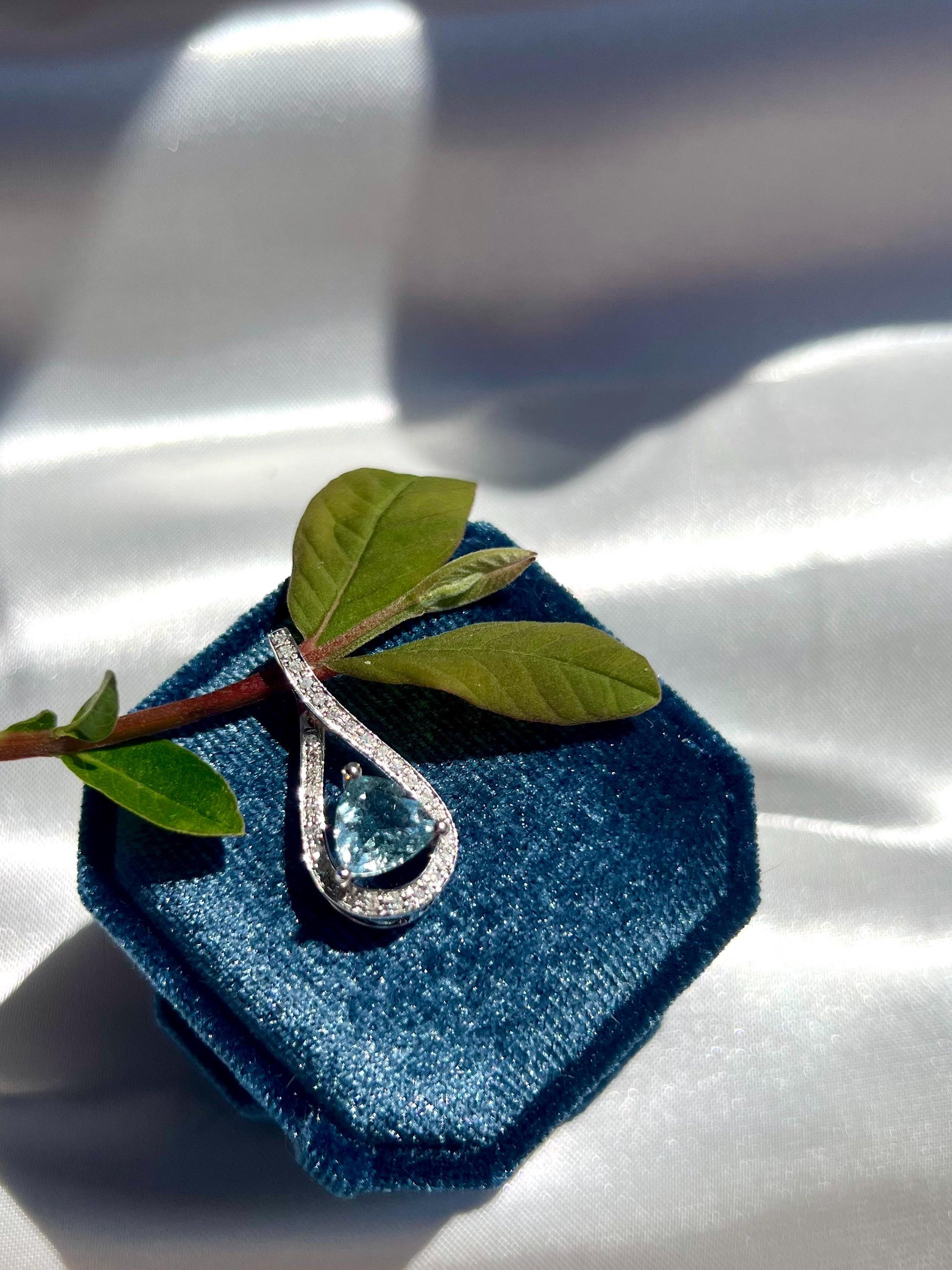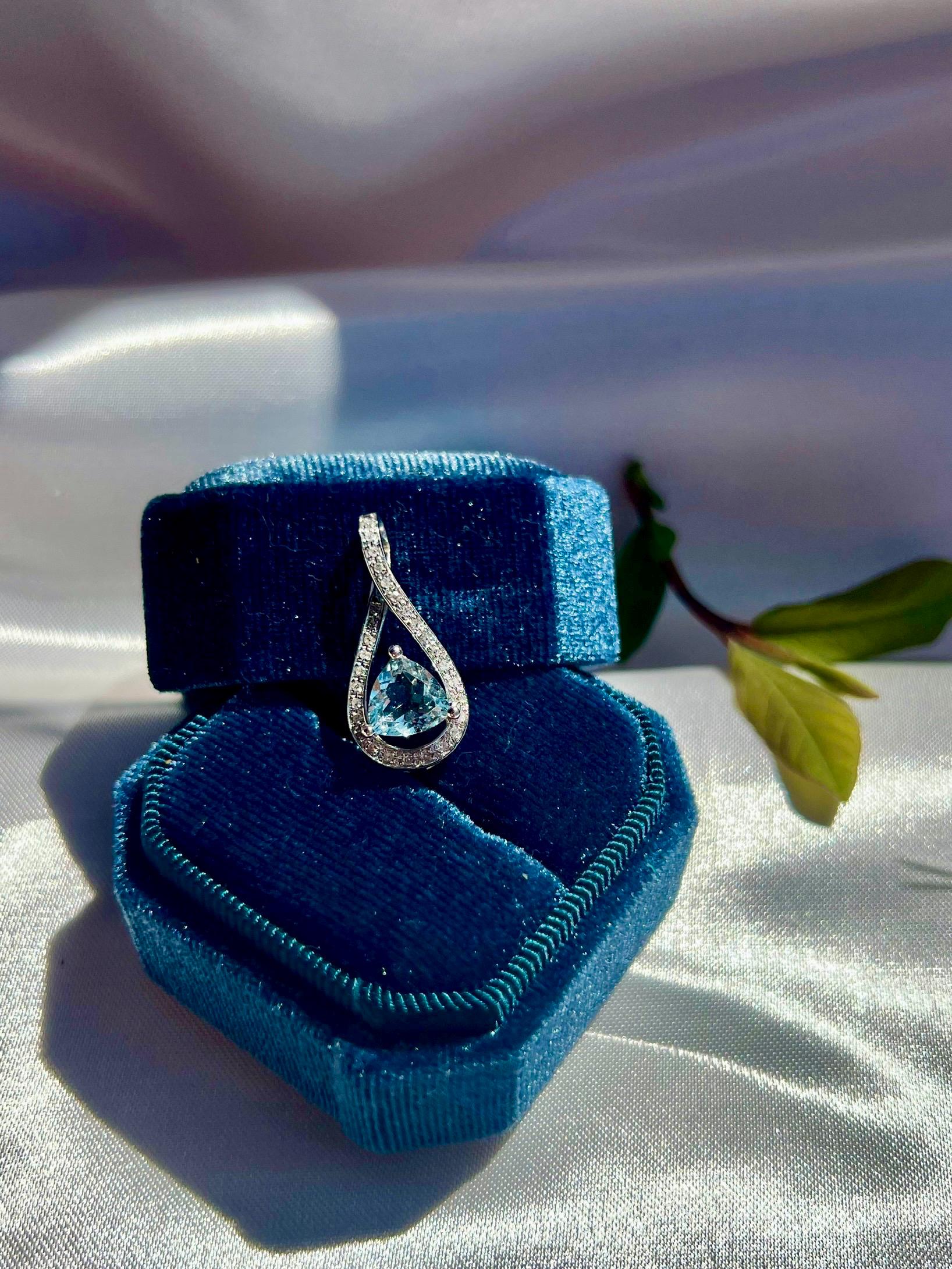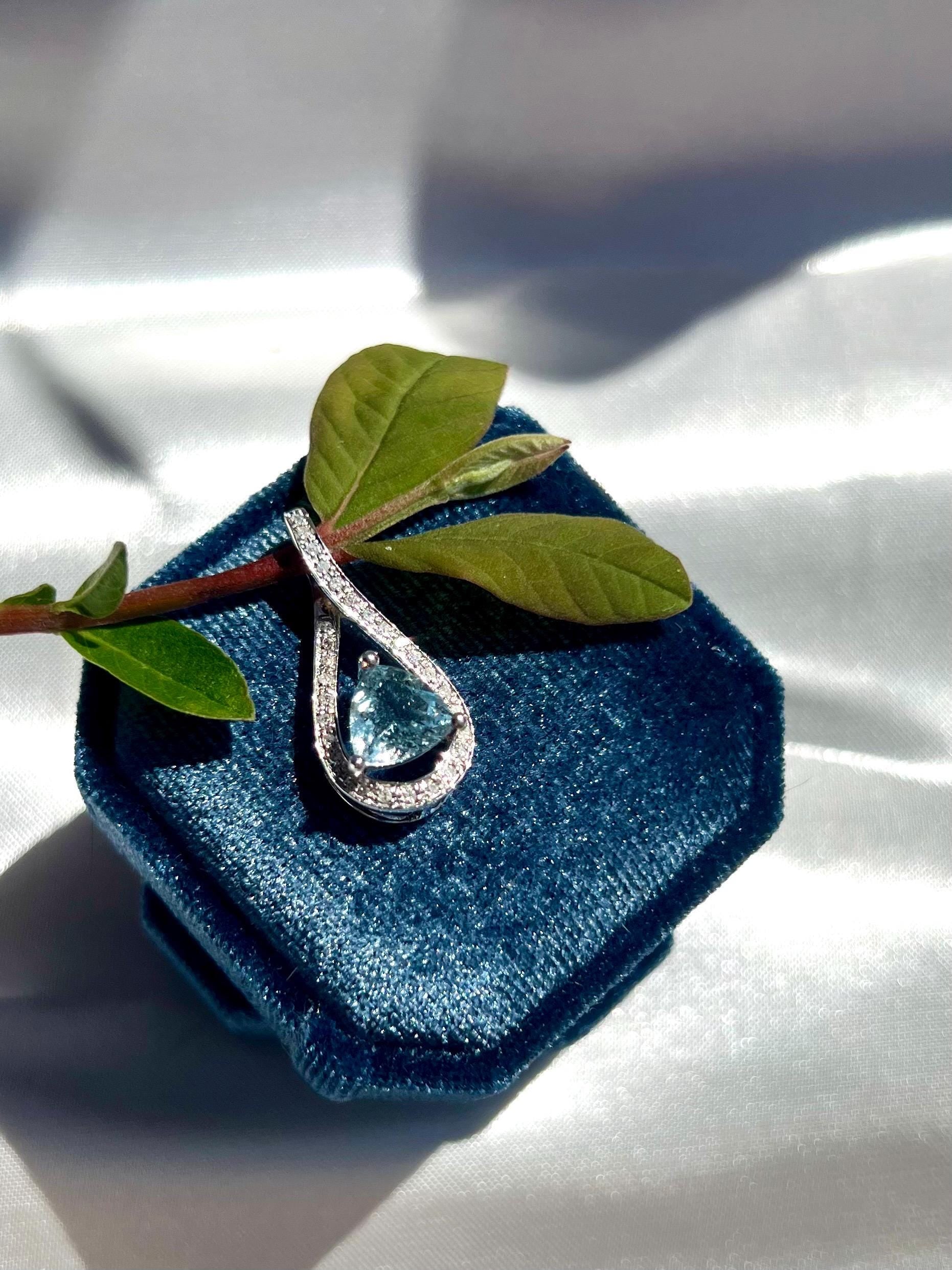 A luminous teardrop of sky-blue aquamarine glows at the heart of this elegant pendant, framed by a swirl of pavé-set natural diamonds that symbolize flowing water and serenity. Handcrafted in 14K solid white gold, the design celebrates clarity and grace — a reminder of calm strength in motion.