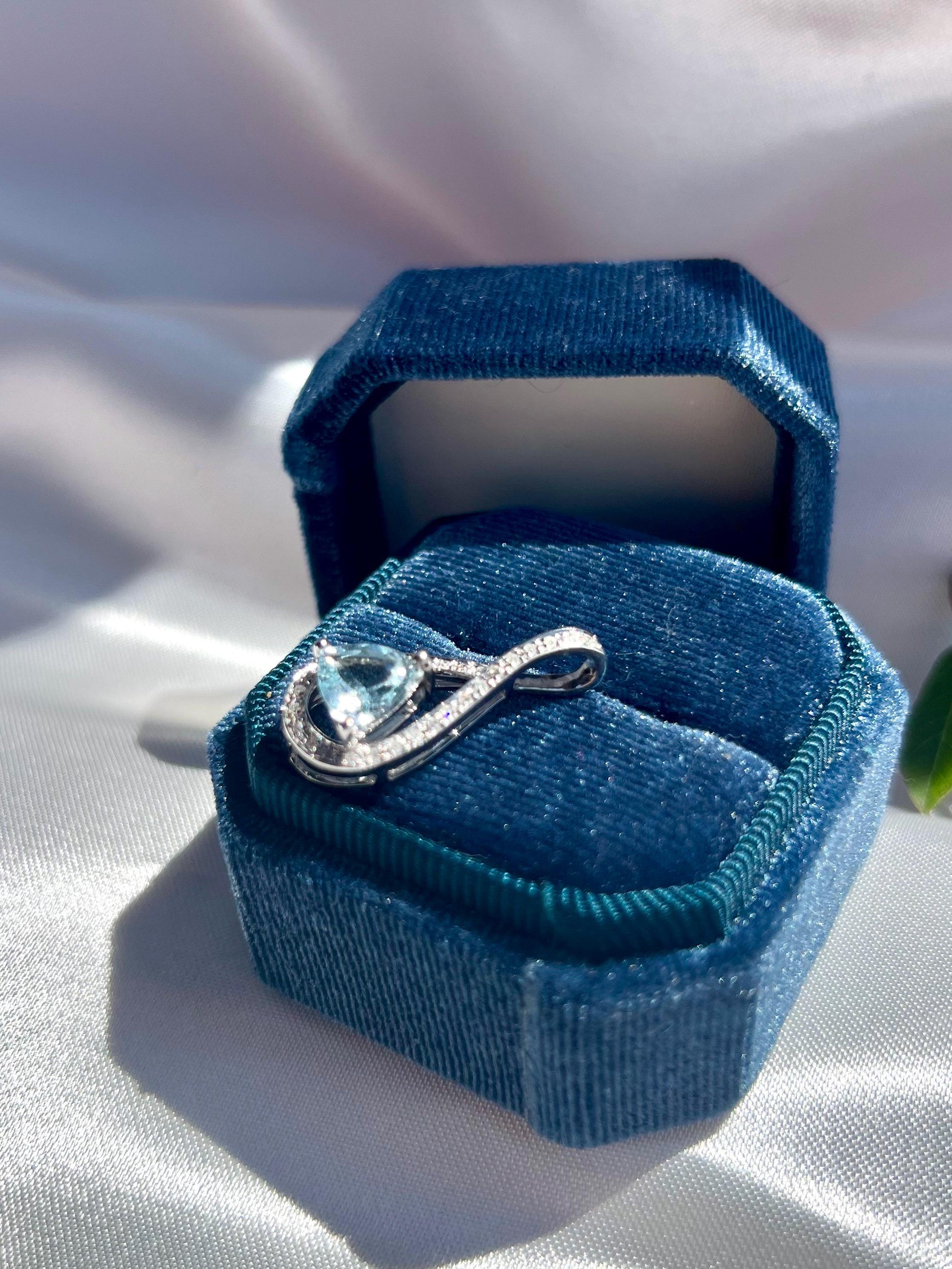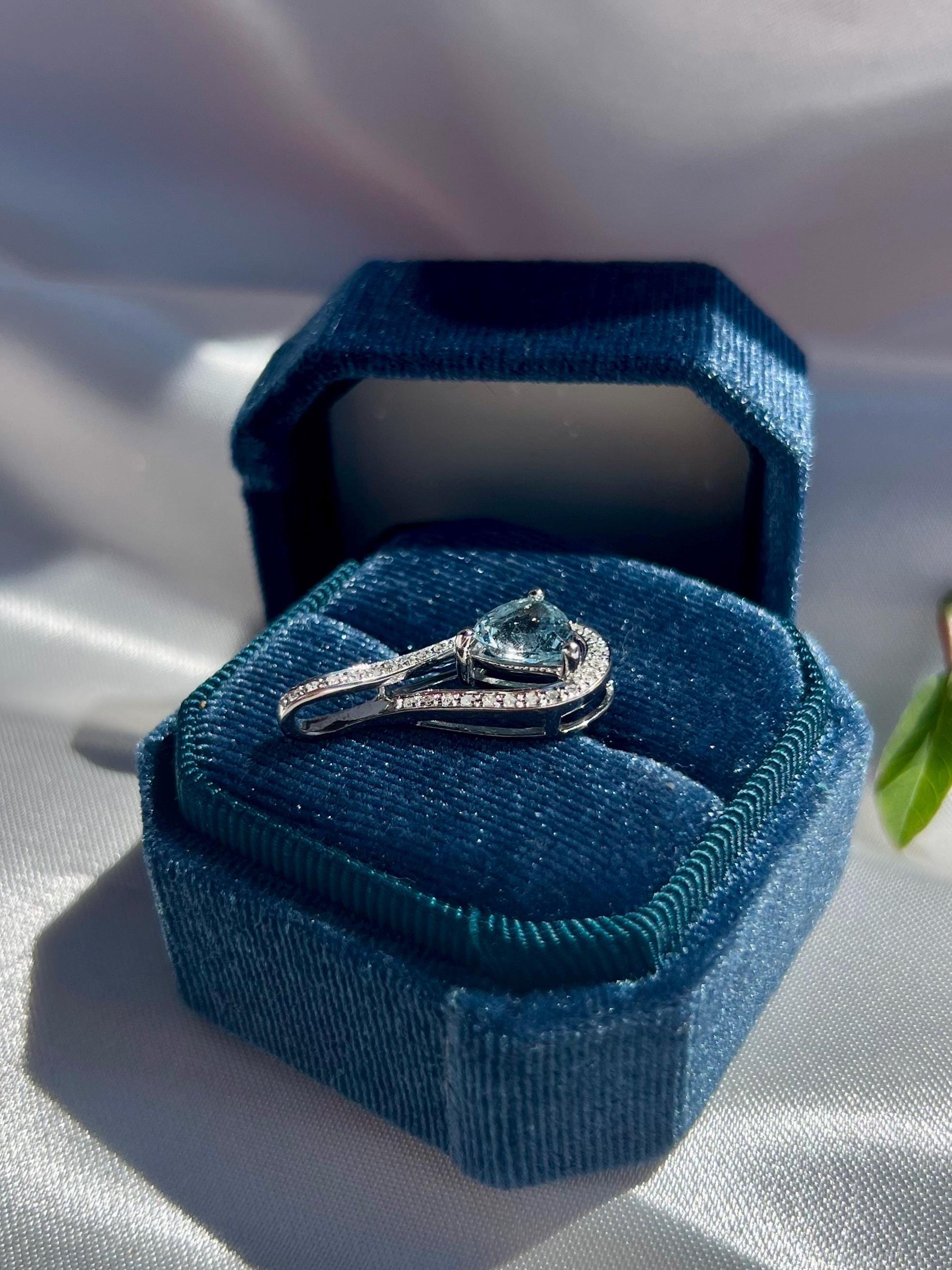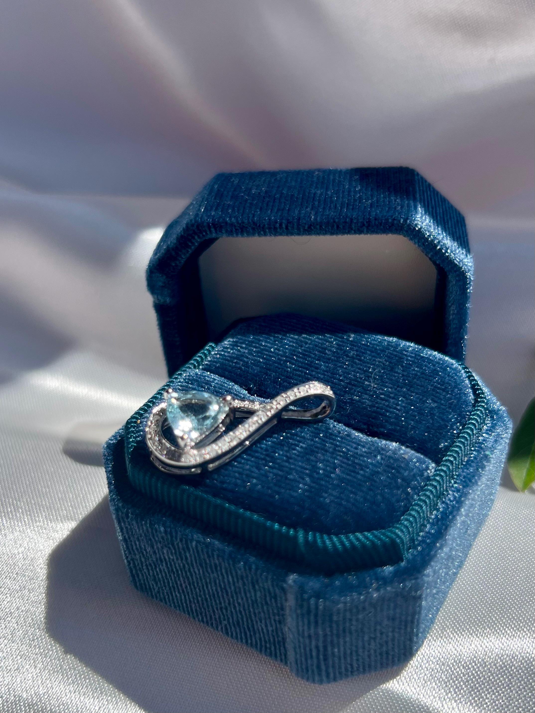 The trillion-cut aquamarine, weighing approximately 2 carats, radiates a gentle brilliance that shifts beautifully under light. Surrounding it are 0.22 carats of natural Earth-mined diamonds, delicately hand-set along a ribbon-like curve that intertwines at the top — a symbol of unity and eternal flow.