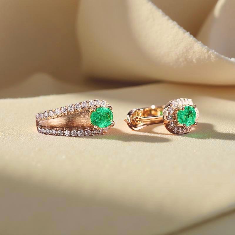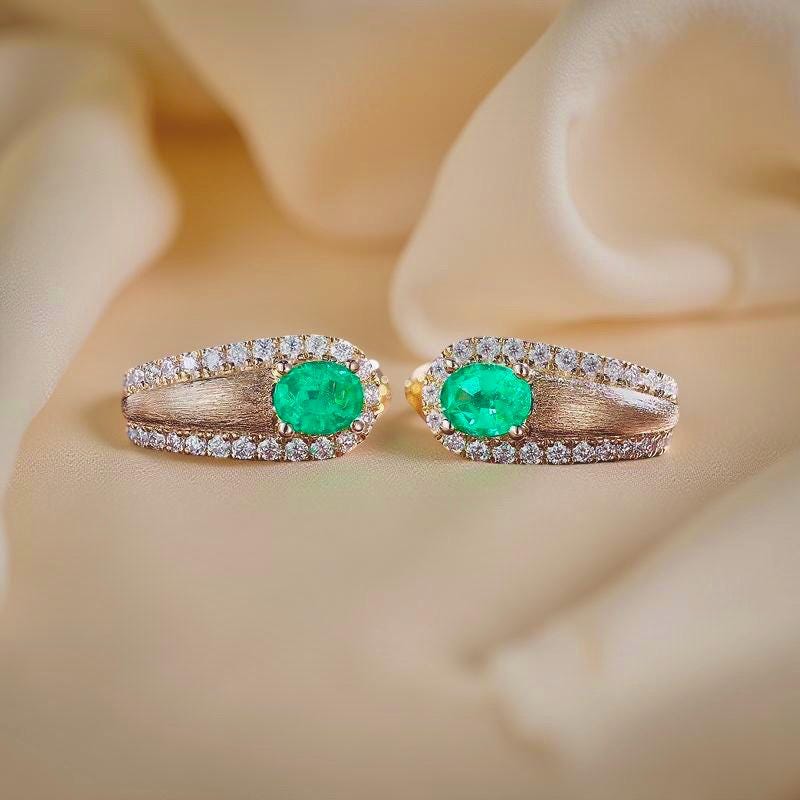 Graceful huggie silhouette, each earring features a vivid green emerald centerpiece, perfectly framed by sparkling diamond accents. The textured satin gold finish adds a touch of understated sophistication, making them equally perfect for a black-tie event or a touch of everyday glamour.