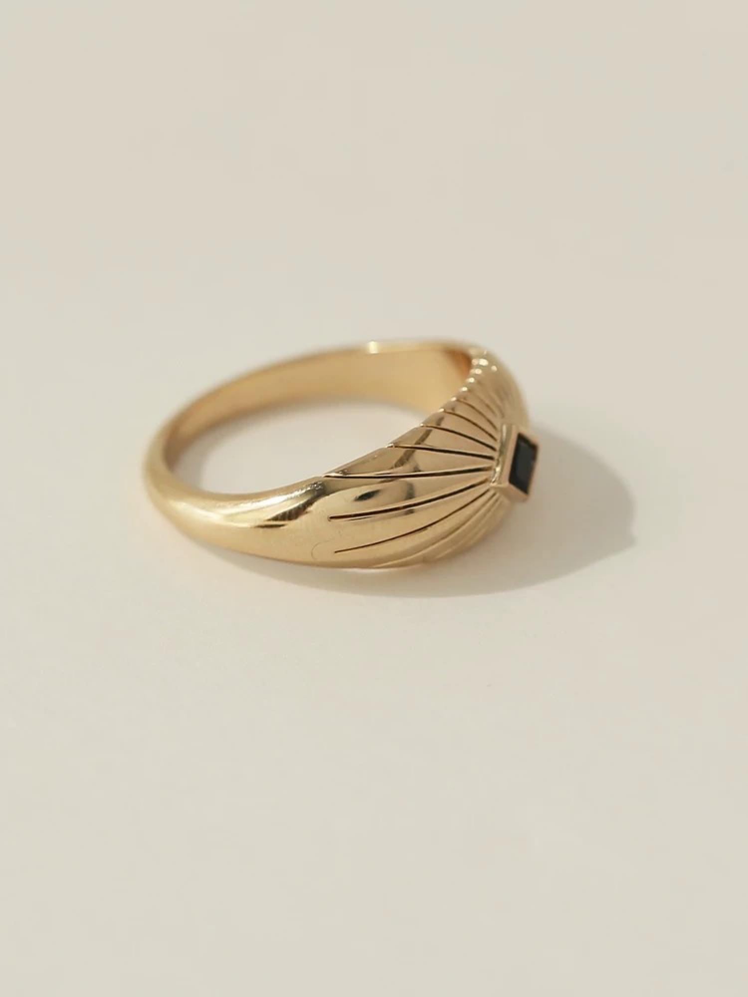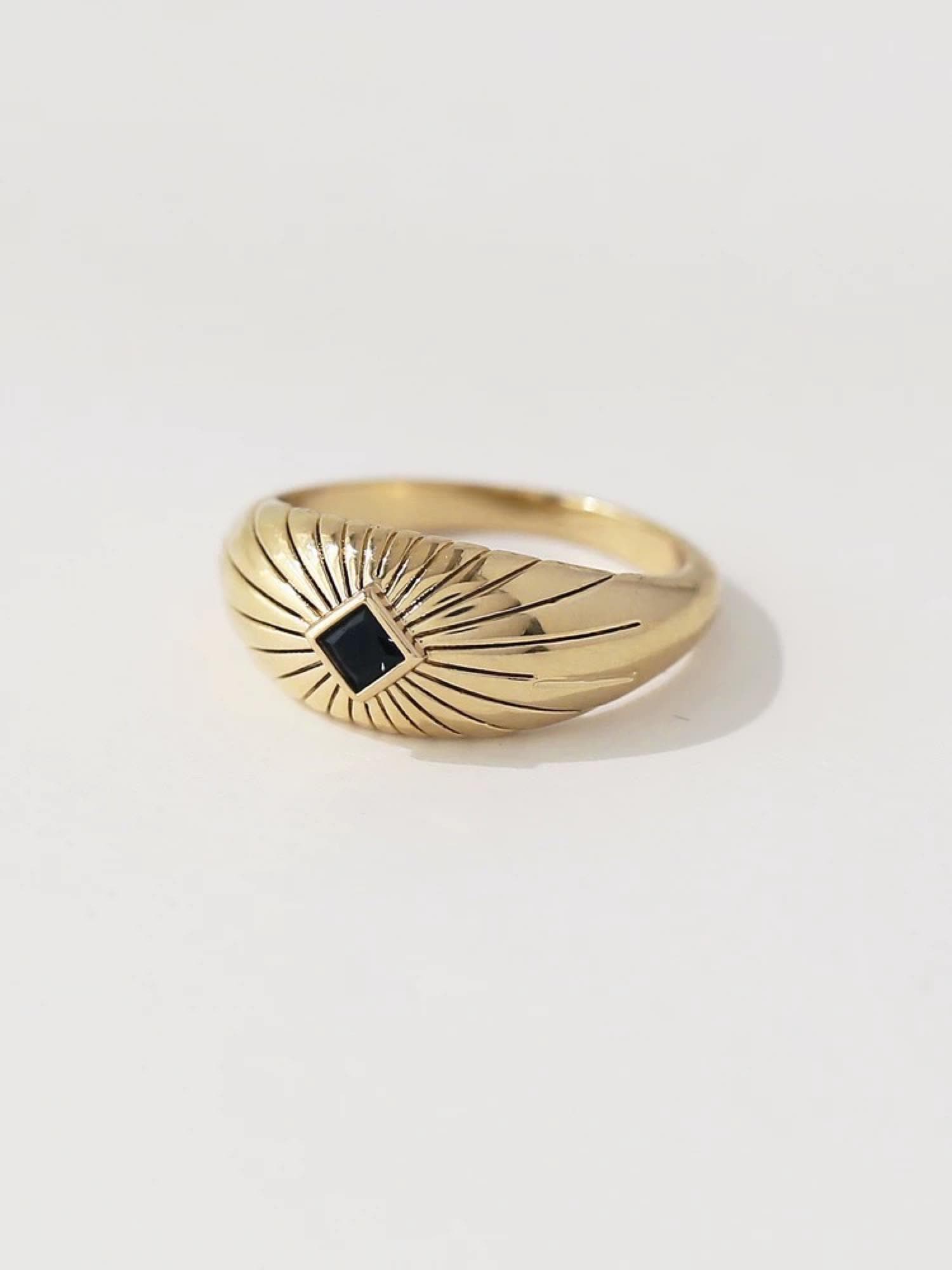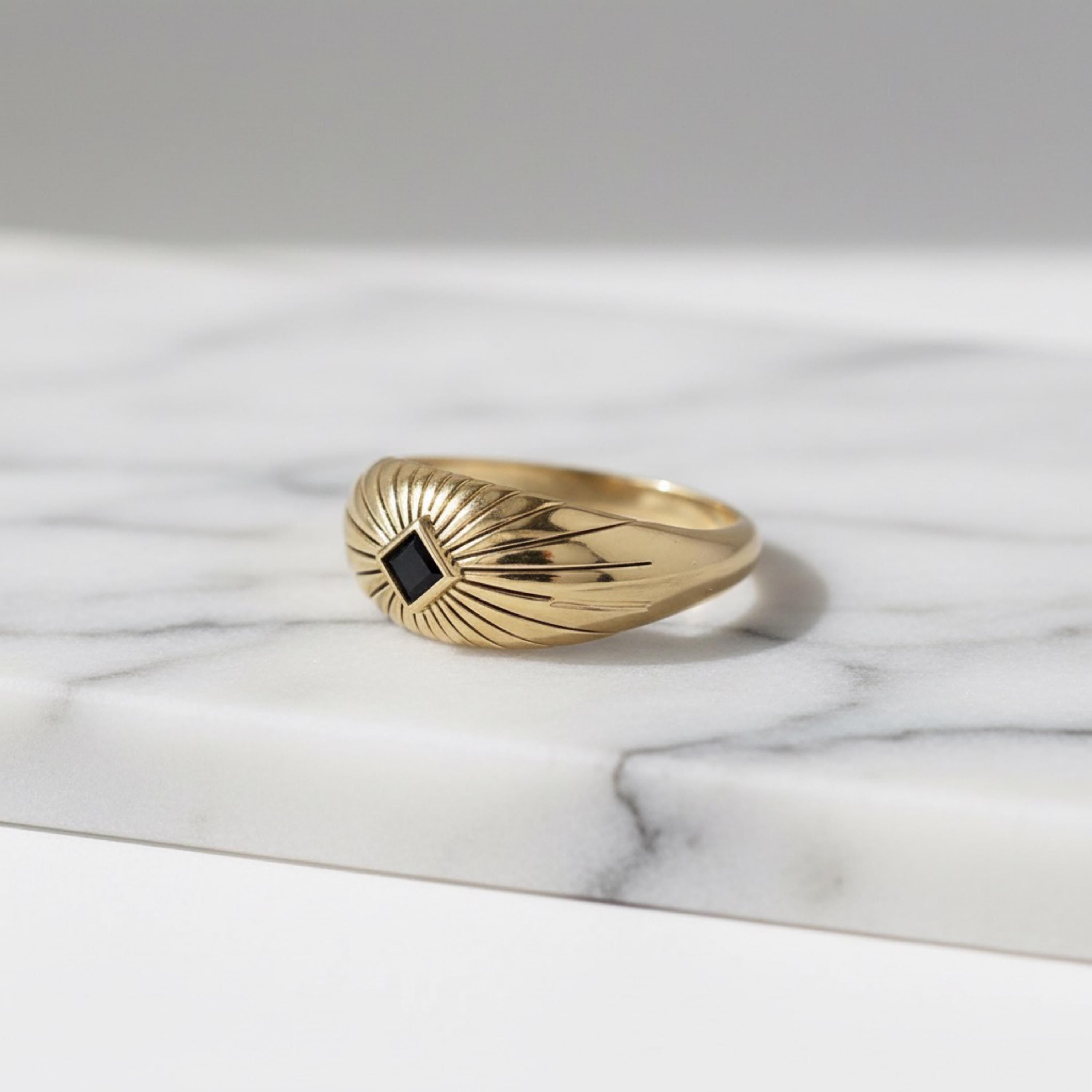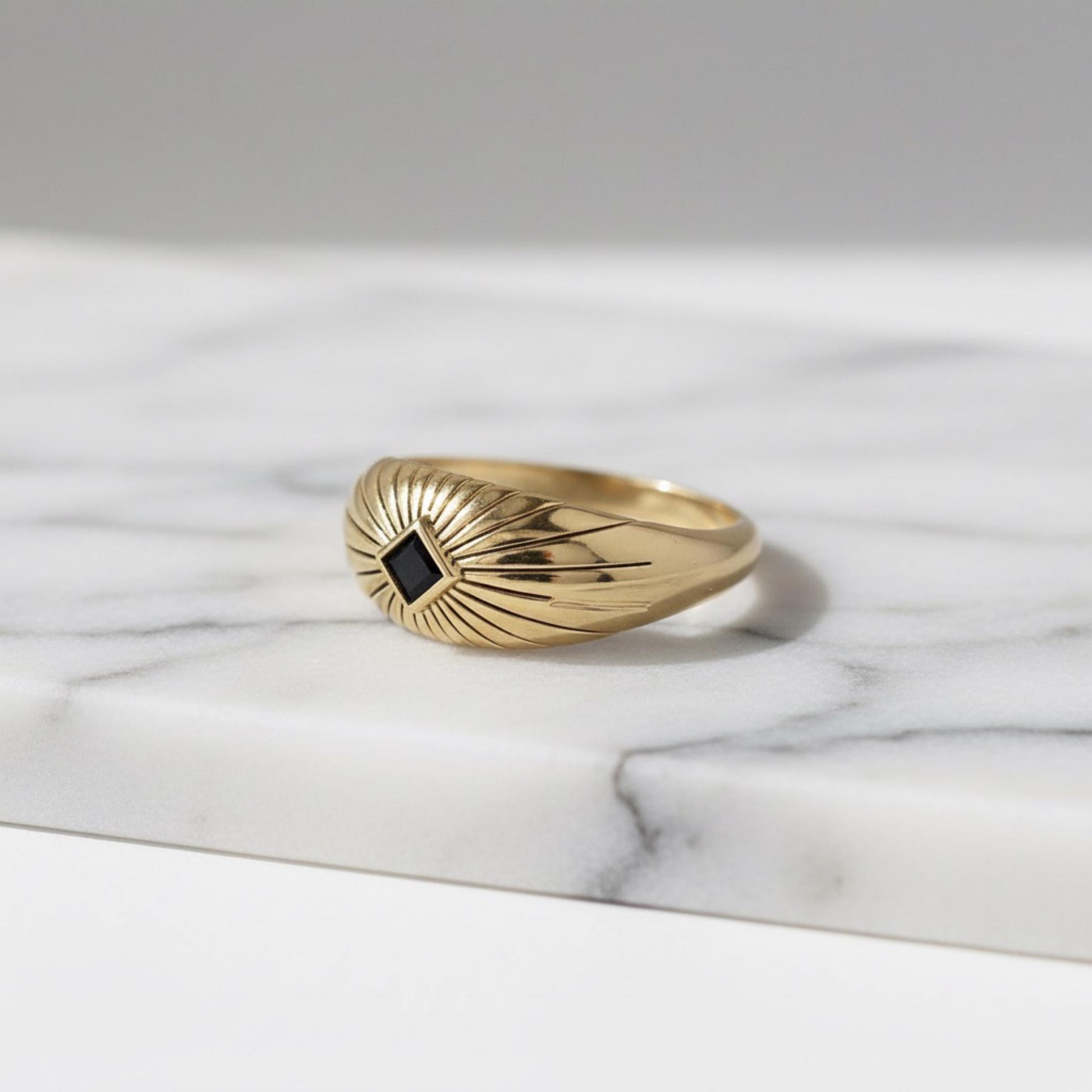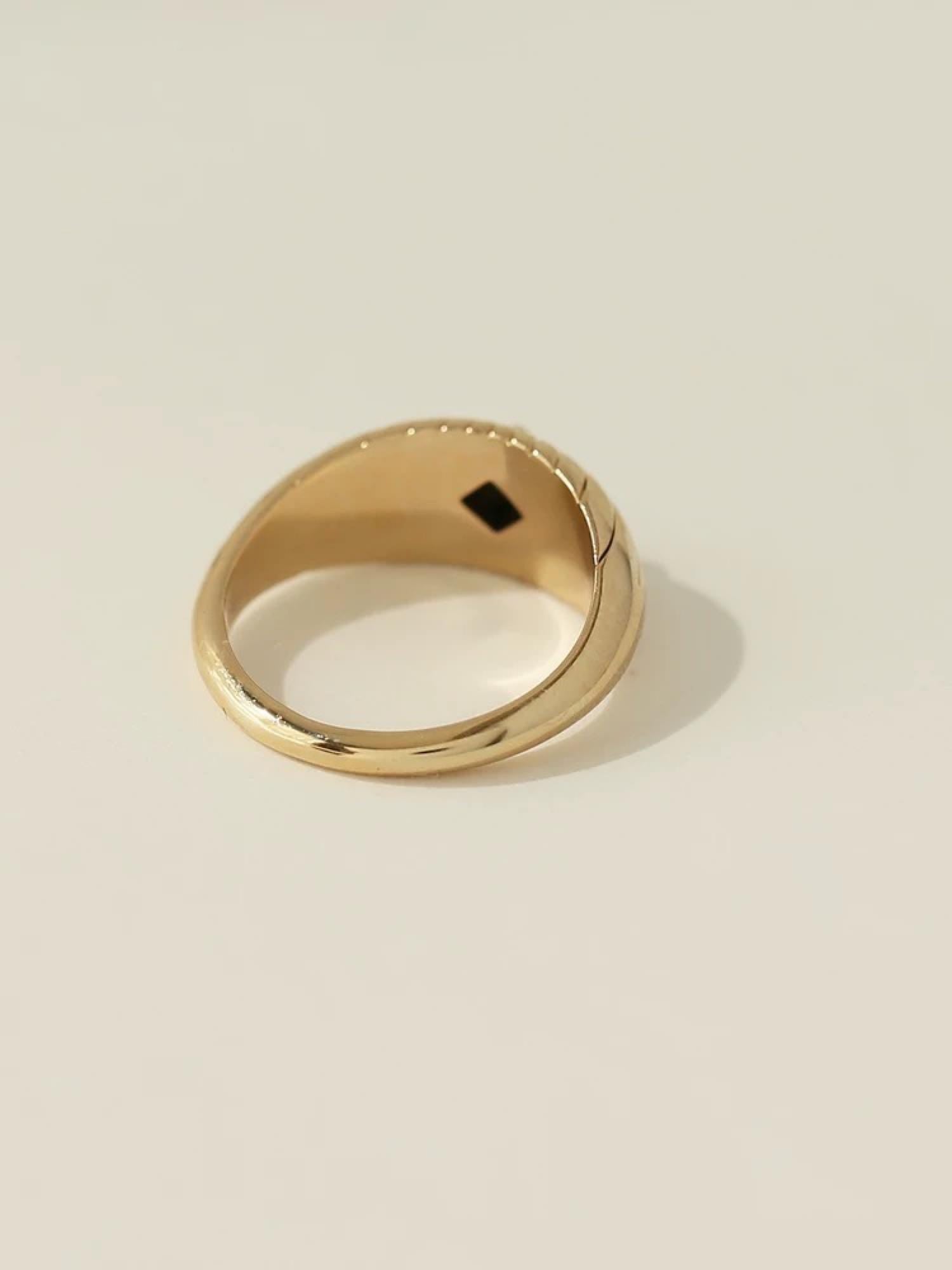This 18K gold-filled onyx signet ring brings together clean Art Deco lines with a soft, luxurious glow—perfect for women who love understated elegance with a hint of mystery.