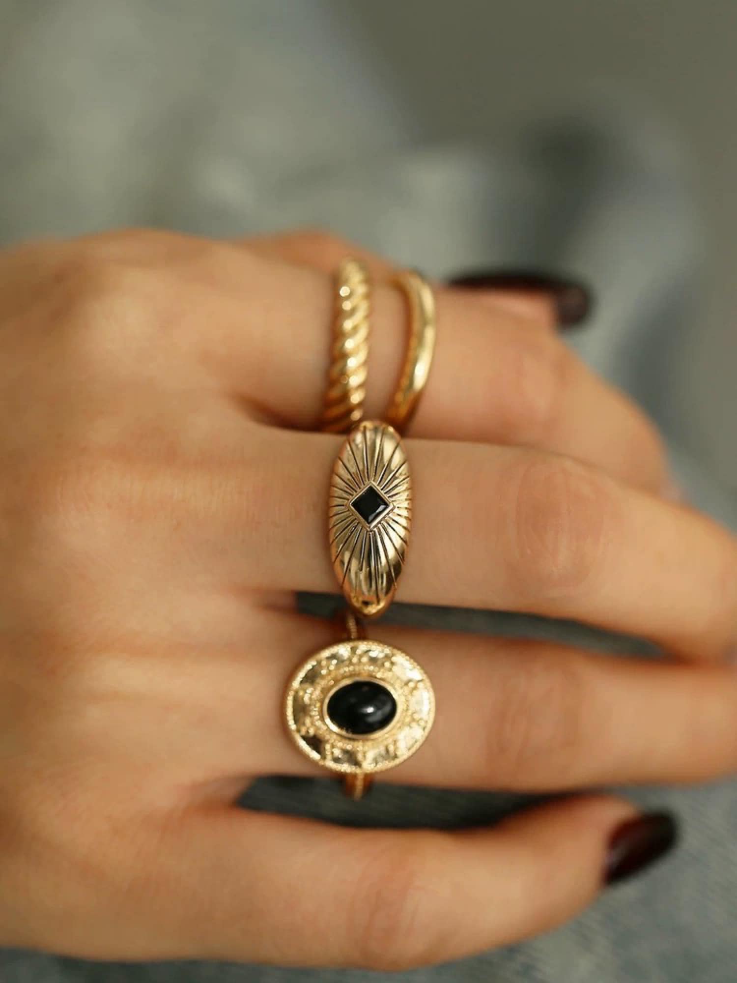 The center stone is a polished black onyx cut into a subtle square silhouette, framed by hand-carved rays that catch the light with every move. It’s bold without being loud… elegant without trying hard. Exactly the kind of quiet luxury that defines BOÎTE LAQUE.