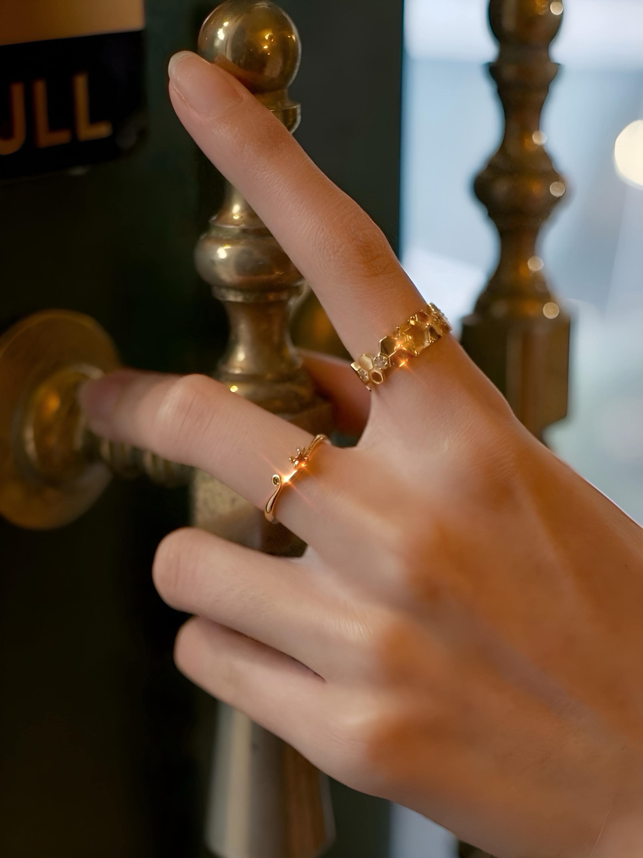 This piece is available in 18K solid gold with/without natural diamonds or gold vermeil. The gold vermeil version comes with a default adjustable band. If you prefer a enclosed back for the gold vermeil option, please message us—we’ll send you an add-on link for $25 to resize it to an enclosed back.