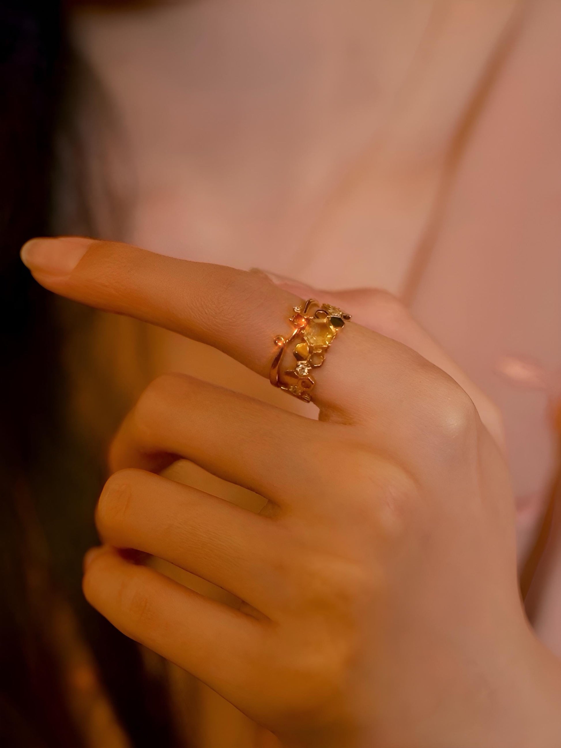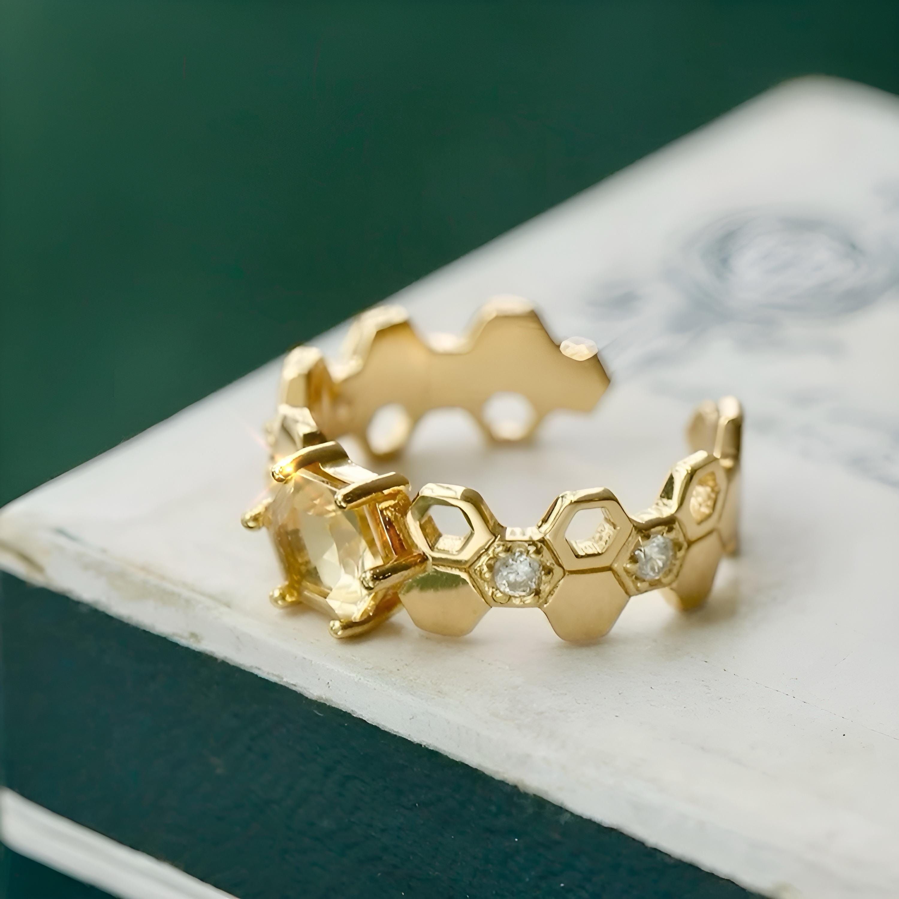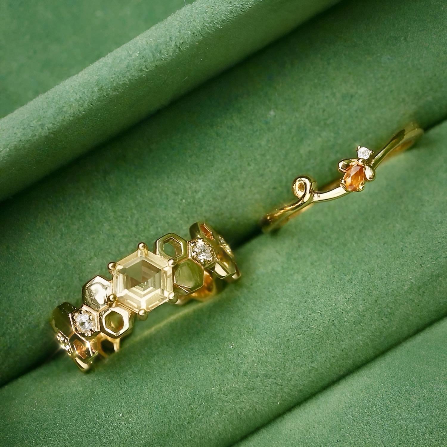 Celebrate the beauty of nature with this stunning 18K gold honeycomb ring, featuring vibrant natural citrine and orange garnet stones. Inspired by the intricate structure of honeycombs and the charm of bees, this ring is perfect for making a statement or enjoying everyday elegance.