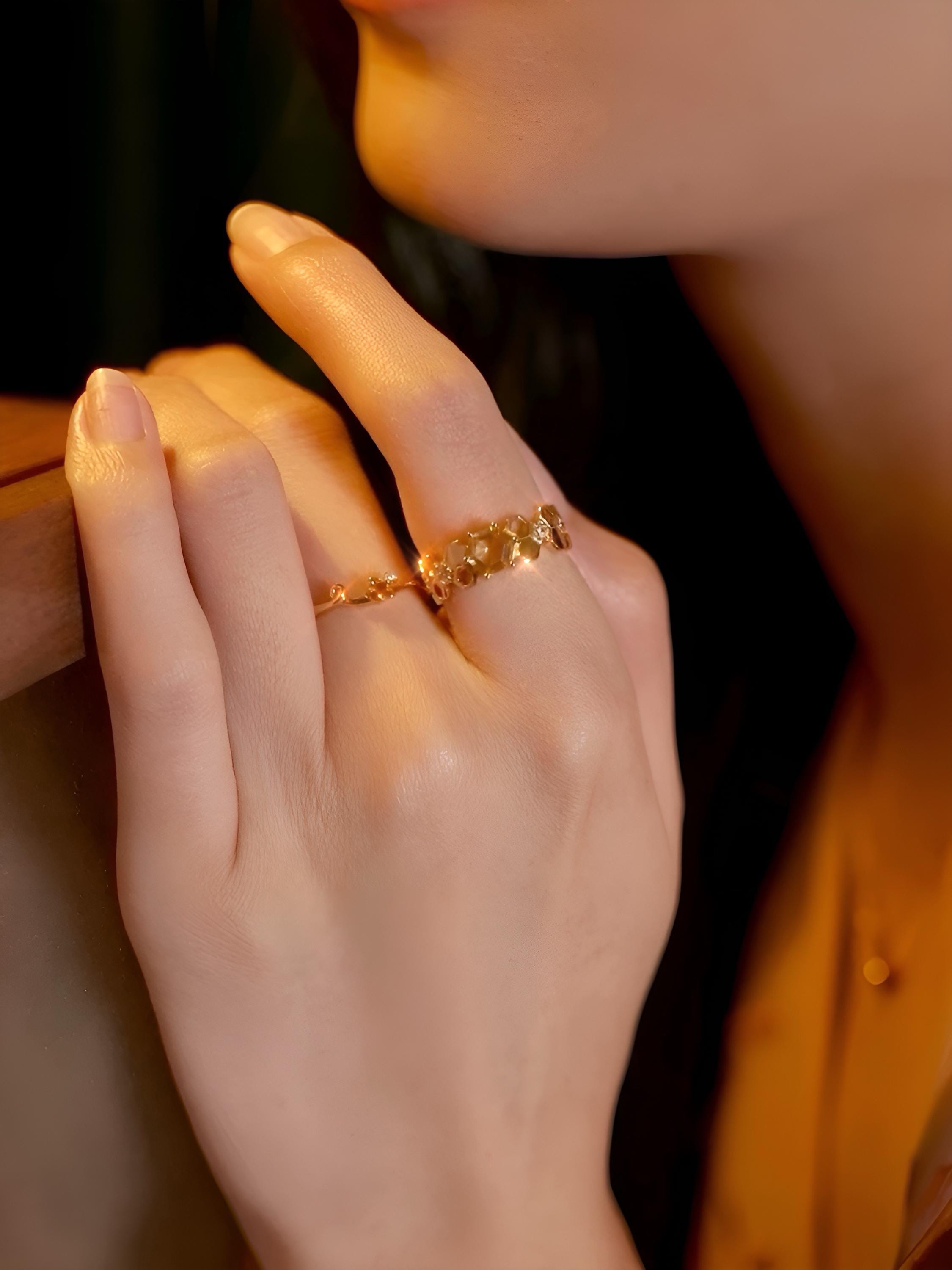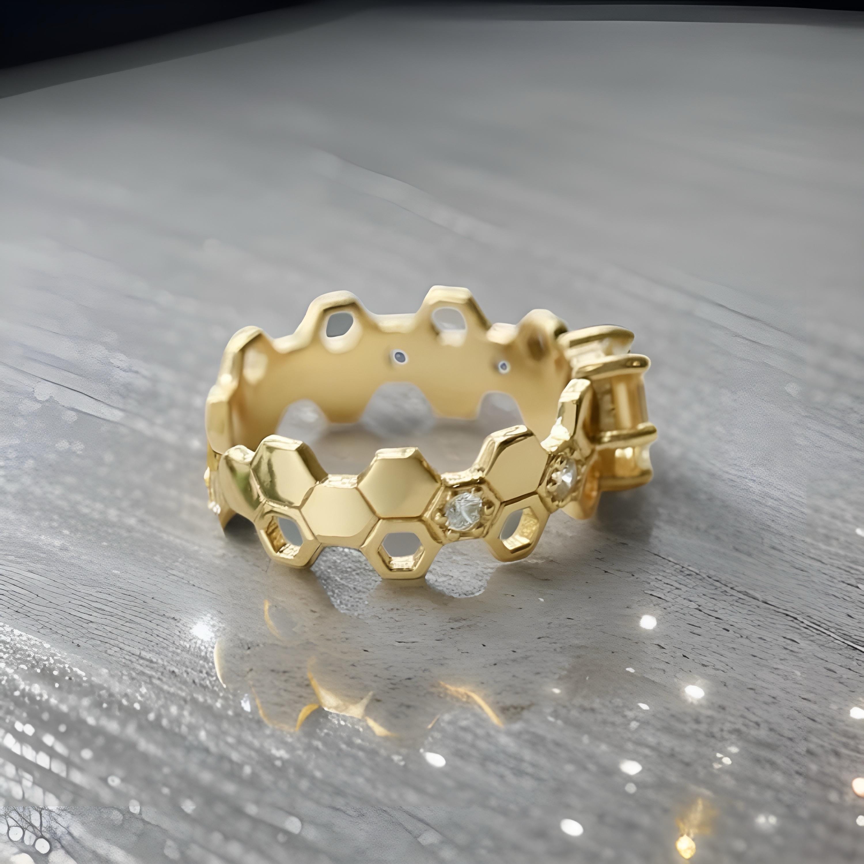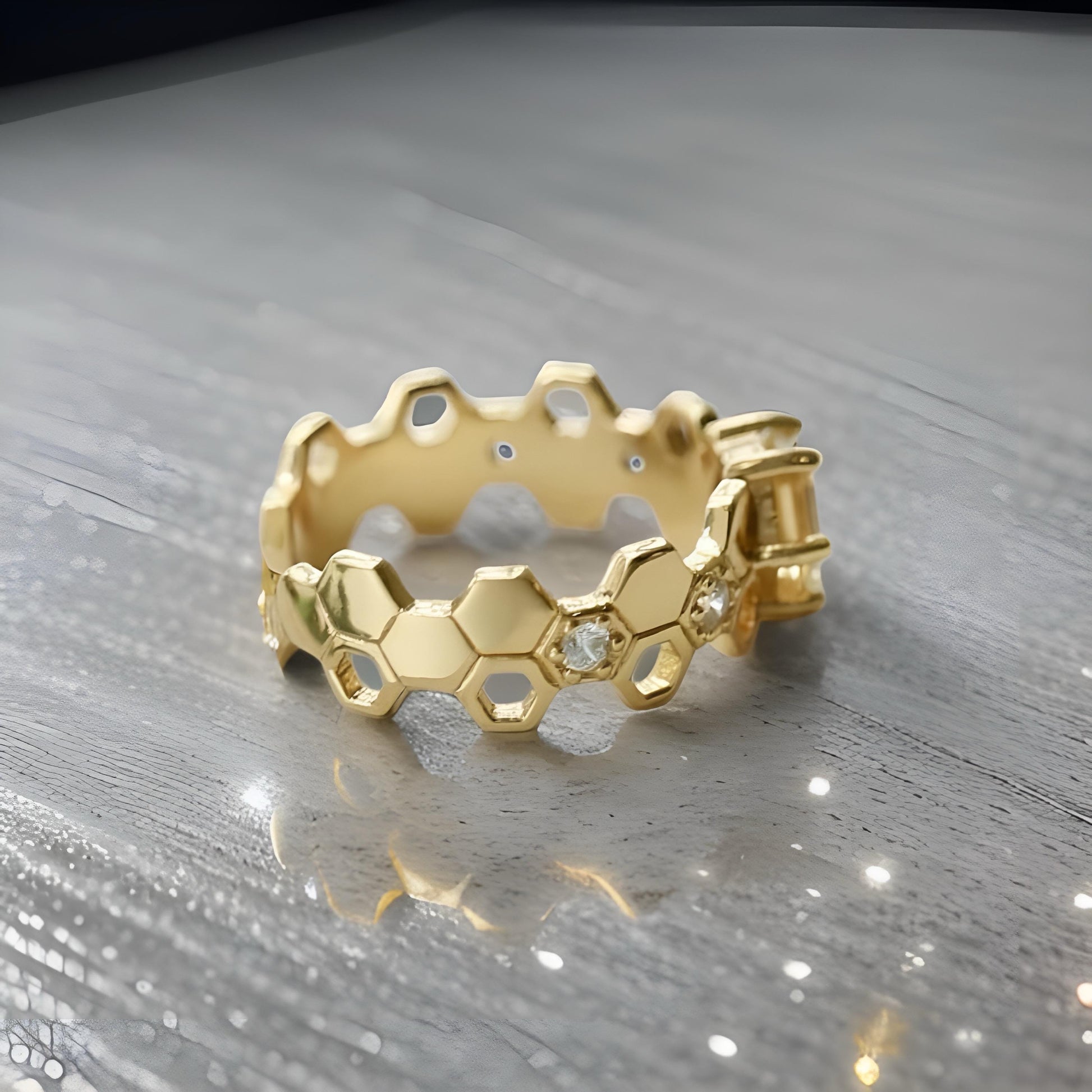 Celebrate the beauty of nature with this stunning 18K gold honeycomb ring, featuring vibrant natural citrine and orange garnet stones. Inspired by the intricate structure of honeycombs and the charm of bees, this ring is perfect for making a statement or enjoying everyday elegance.