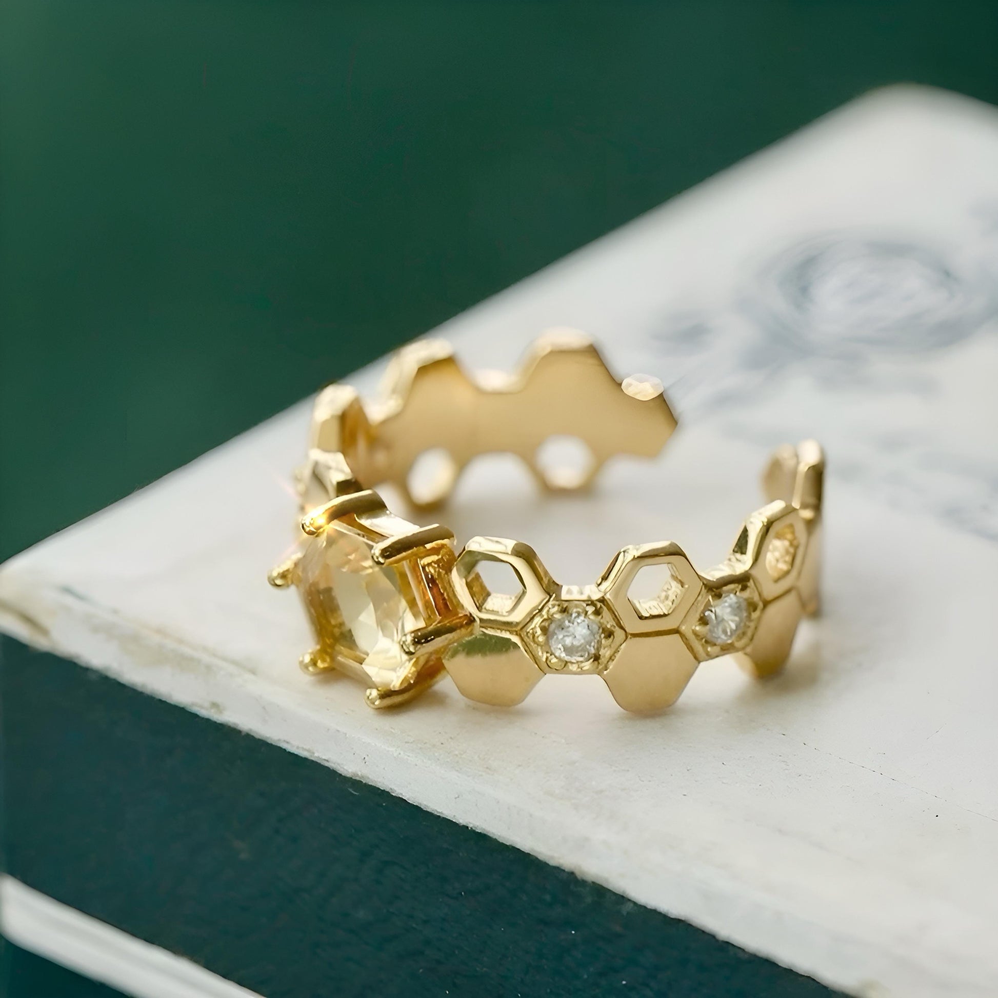 18K Gold Honeycomb Ring | Honey Bee Inspired Ring with Natural Citrine and Orange Garnet | Customizable with Solid Gold & Diamonds