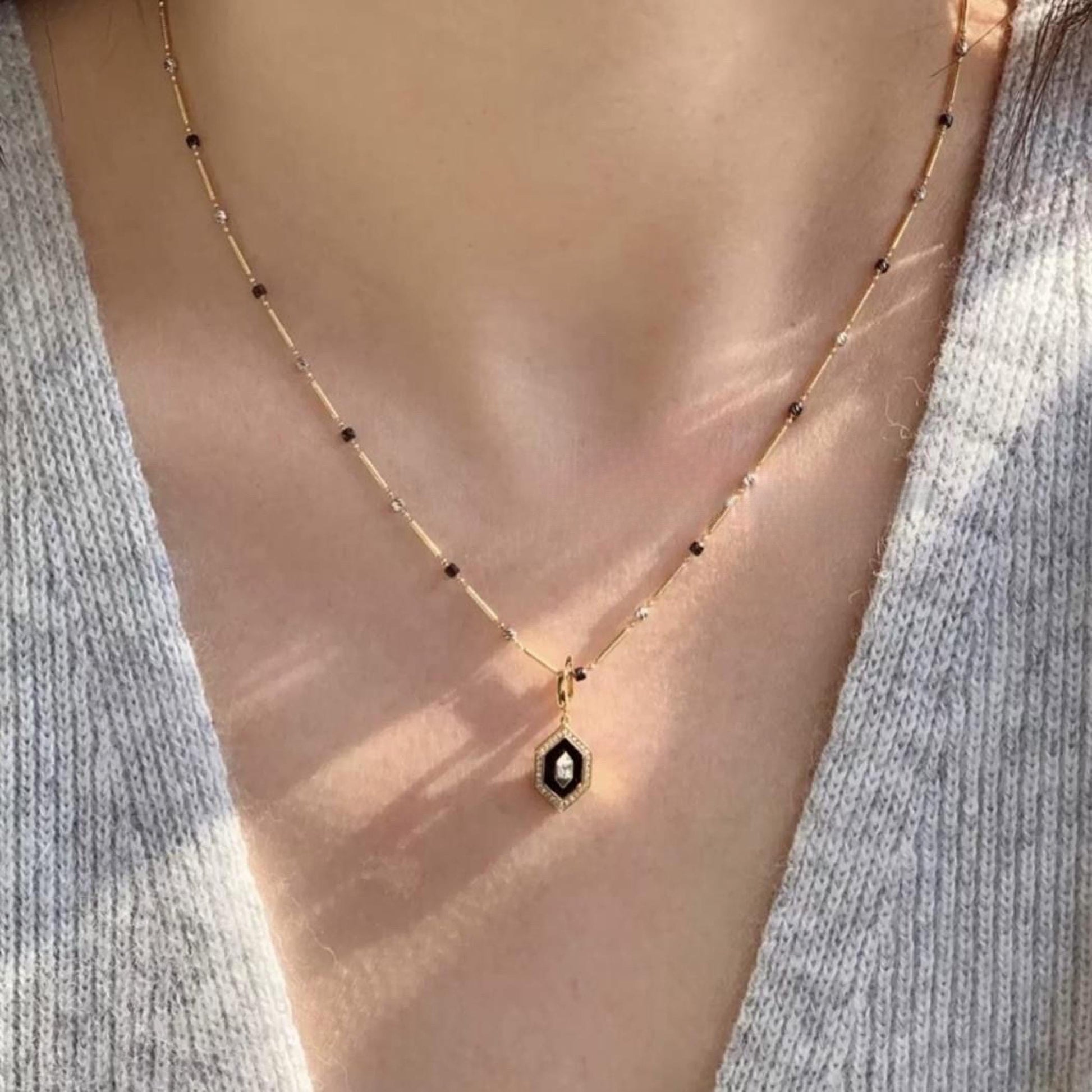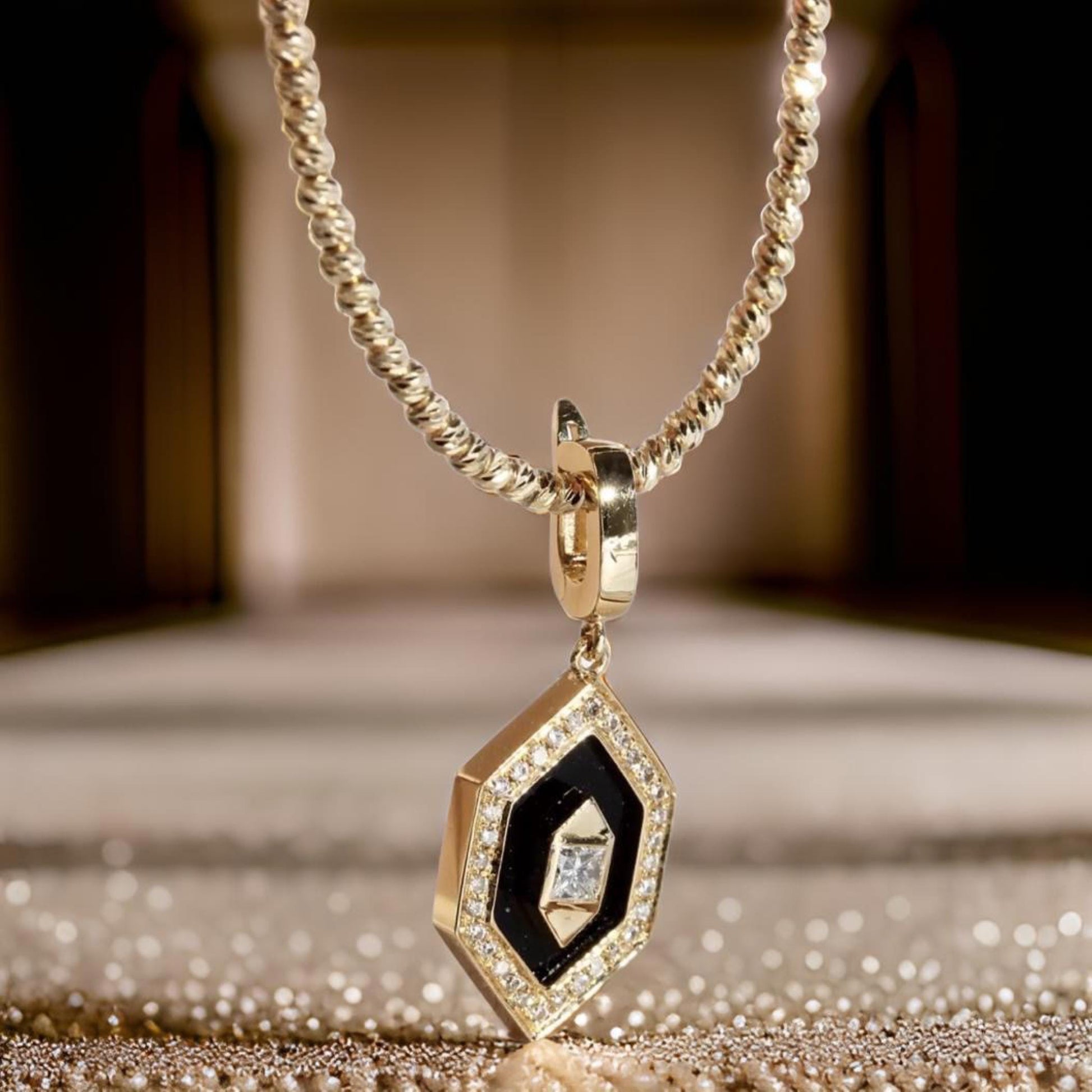 This pendant feels like a treasure from a glamorous past, yet it’s so easy to wear every day. Inspired by Art Deco design, this 18K solid gold pendant features a striking natural diamond centerpiece, framed by sleek black onyx and surrounded by delicate pave diamonds. The geometric details give it a bold yet refined aesthetic.