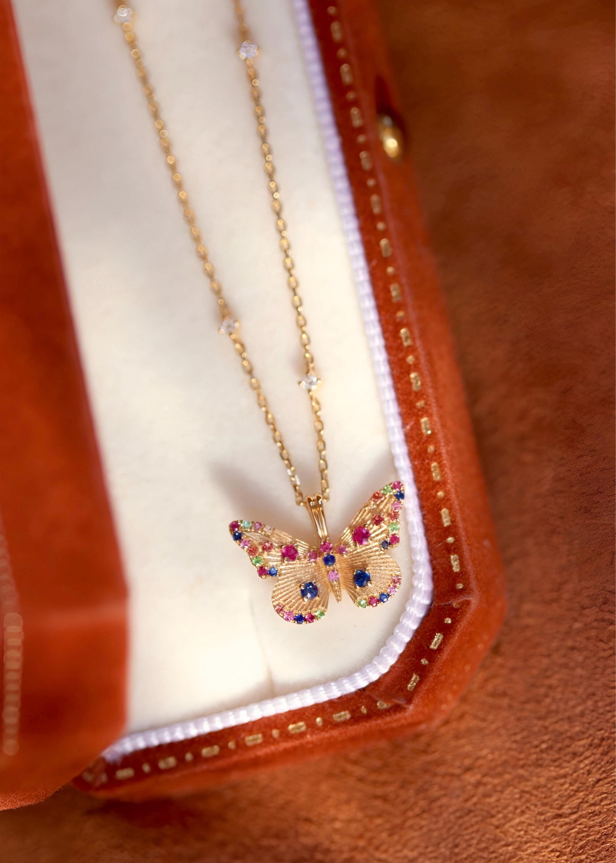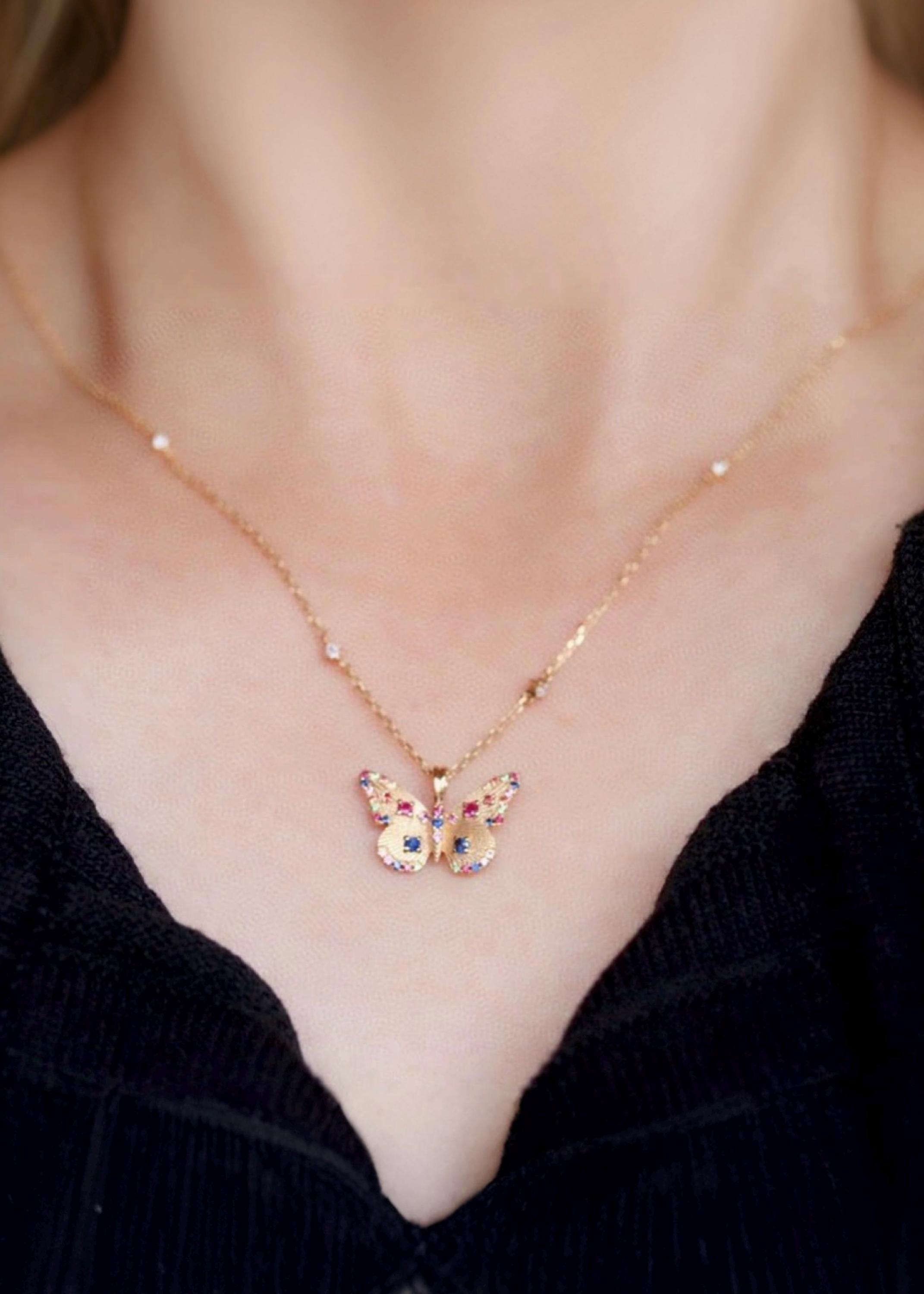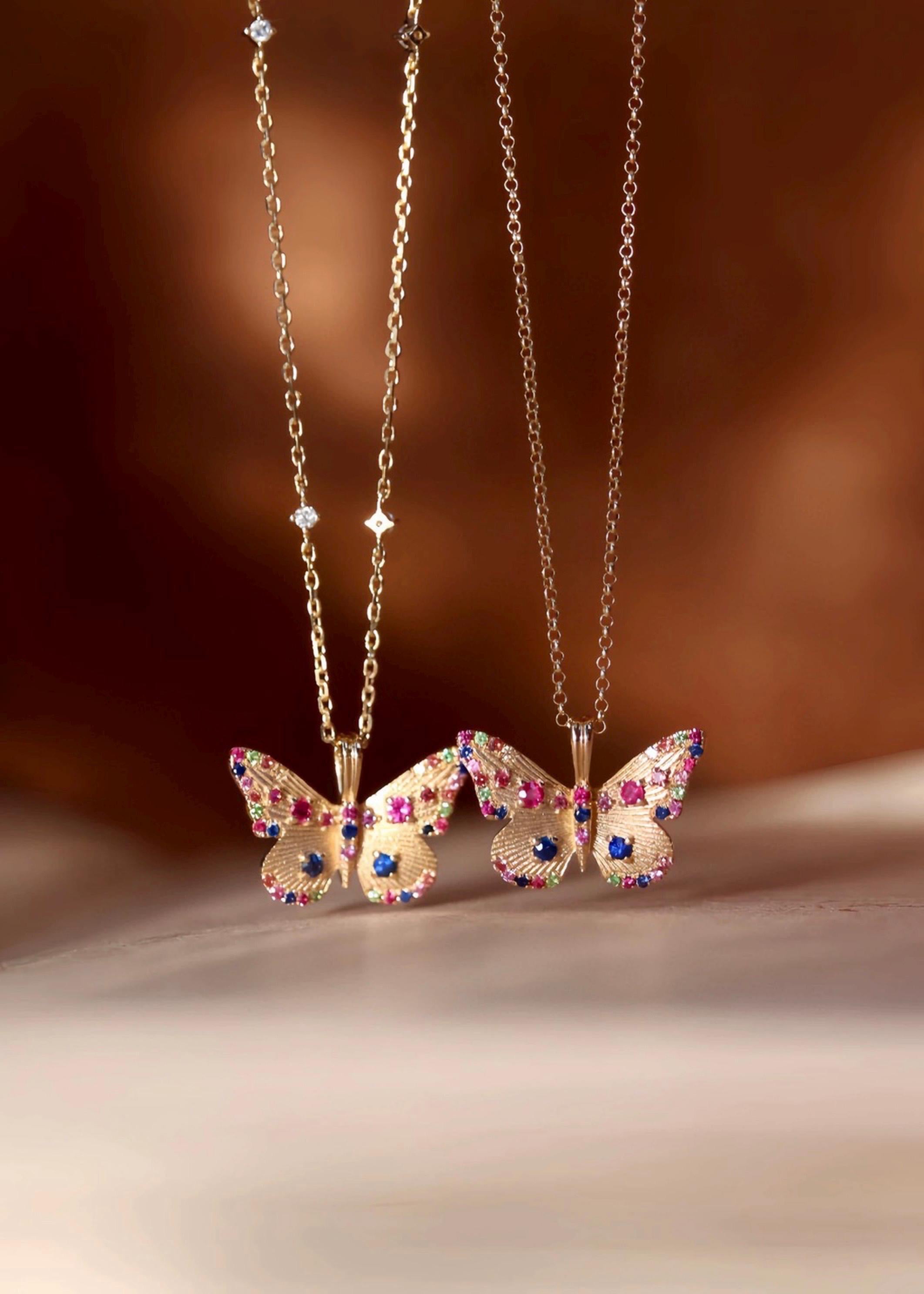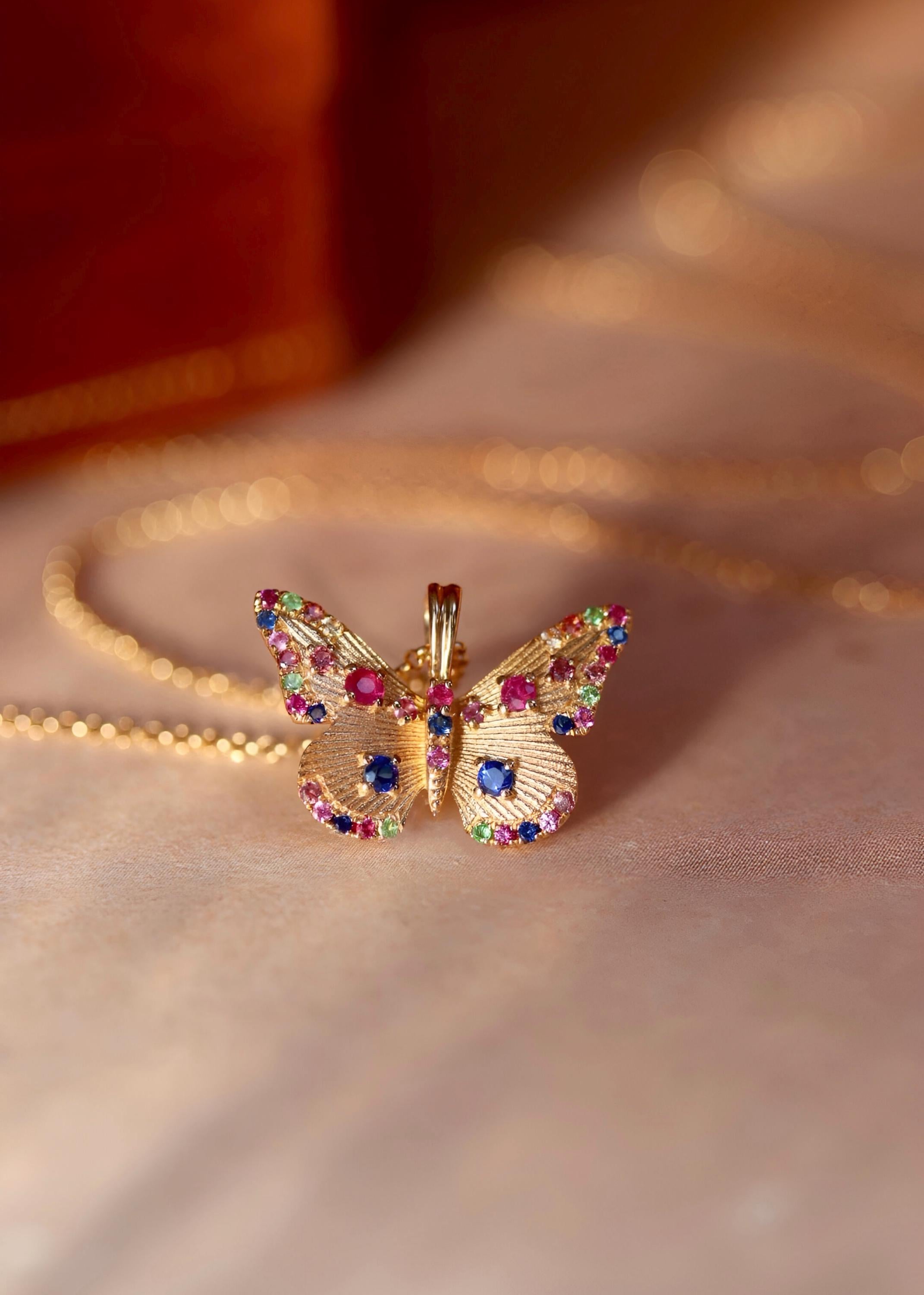 This handcrafted butterfly pendant is made in 18k solid gold and set with natural sapphires, rubies, and emeralds — each gem hand-placed to bring out the delicate motion and color of a butterfly mid-flight.