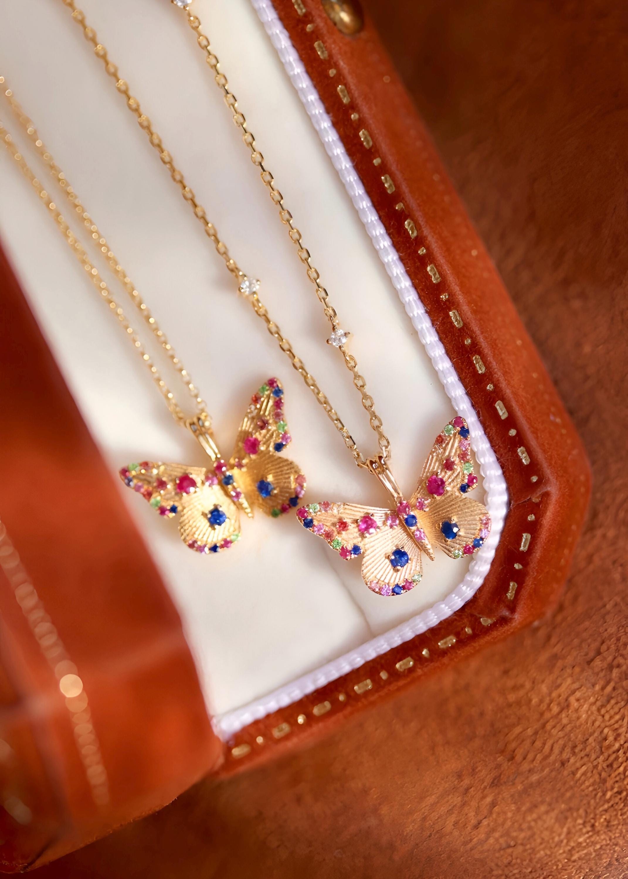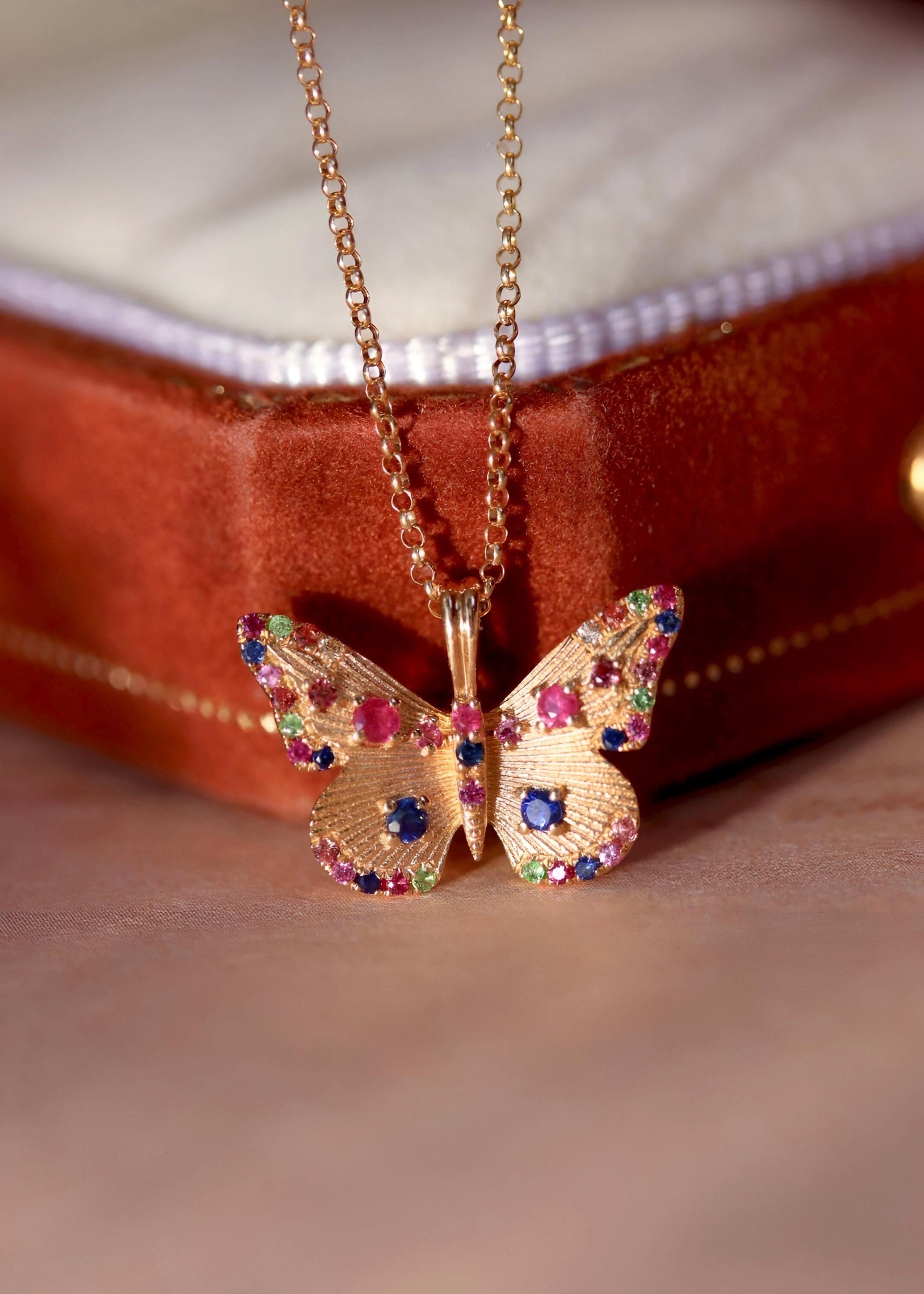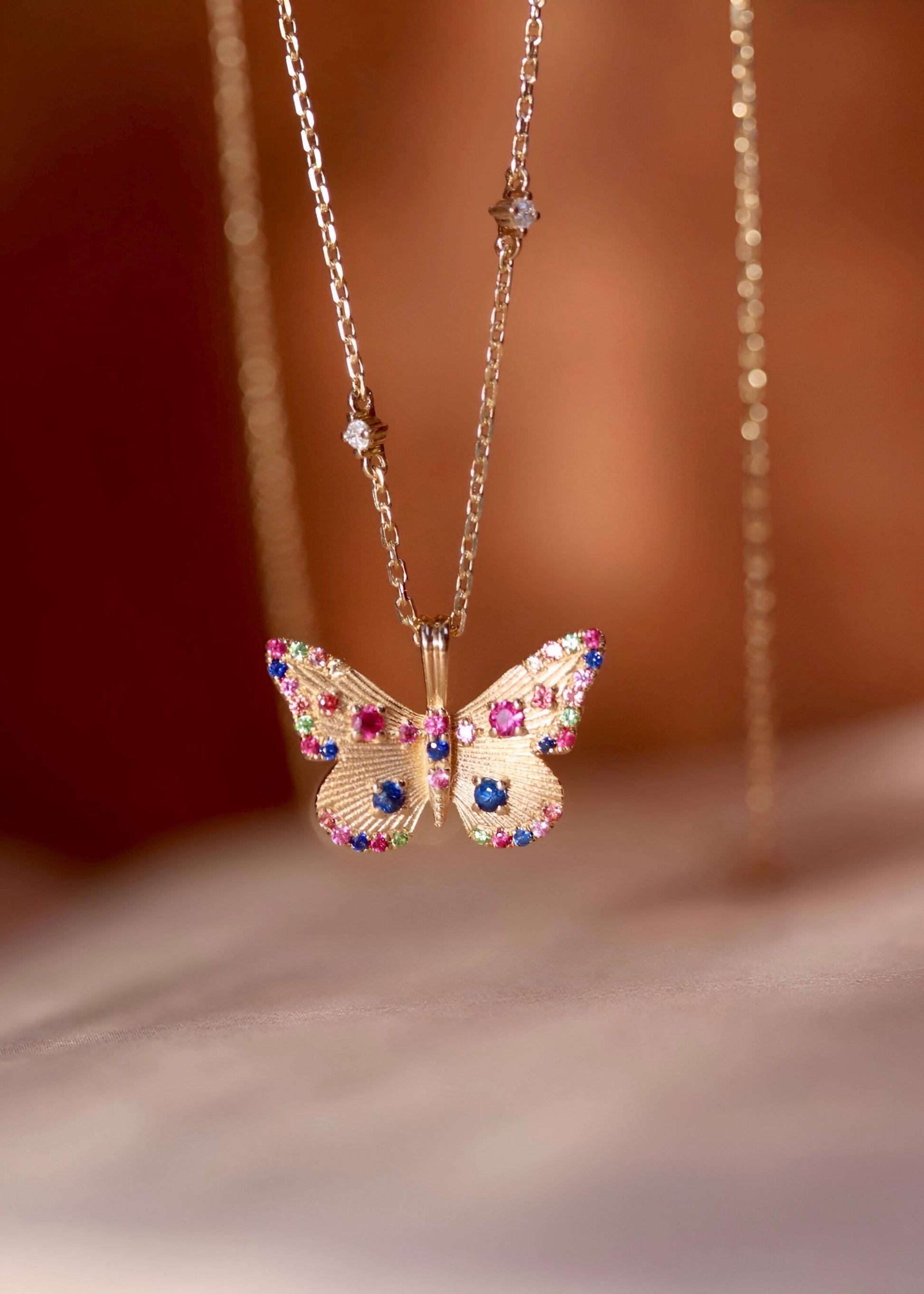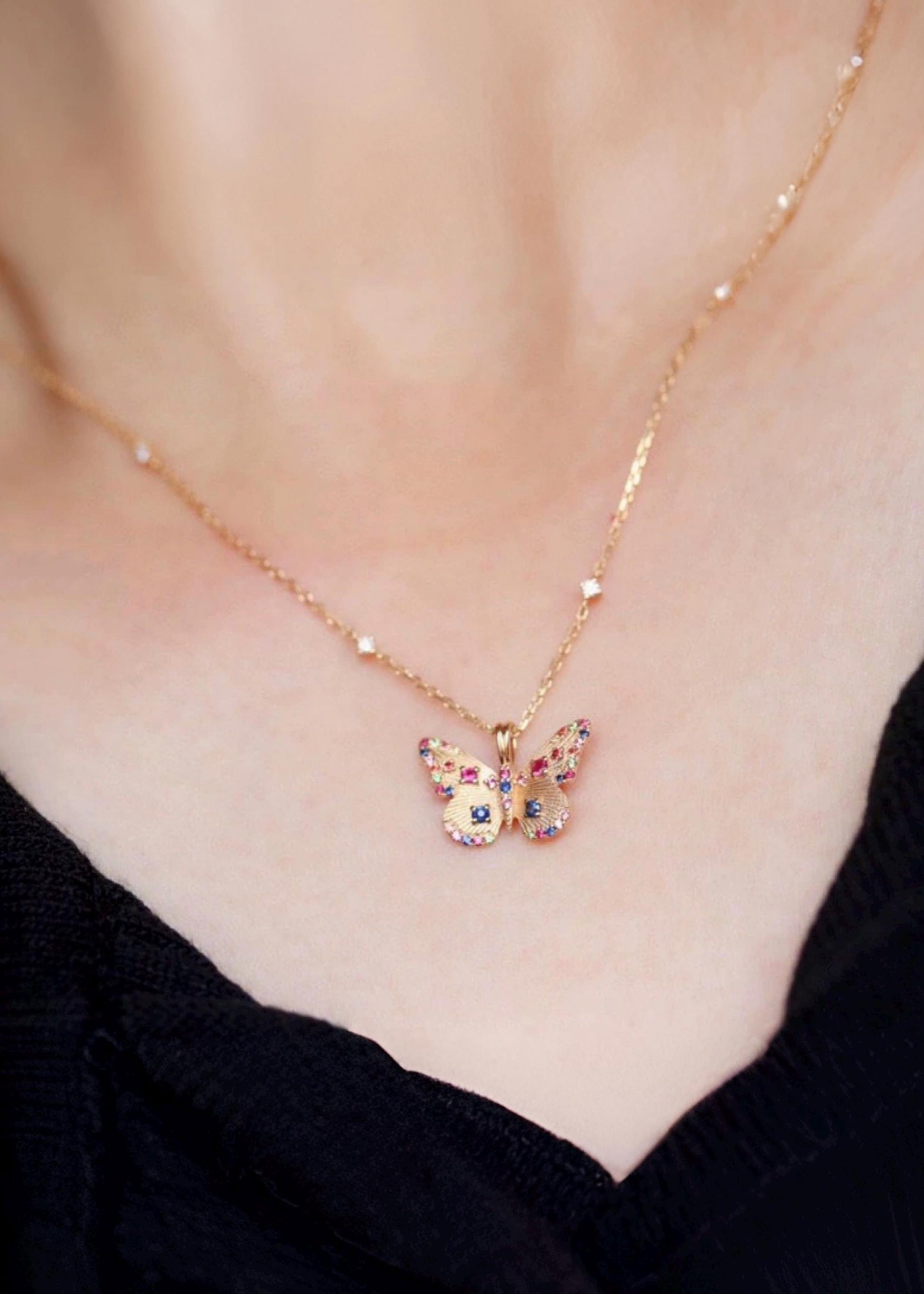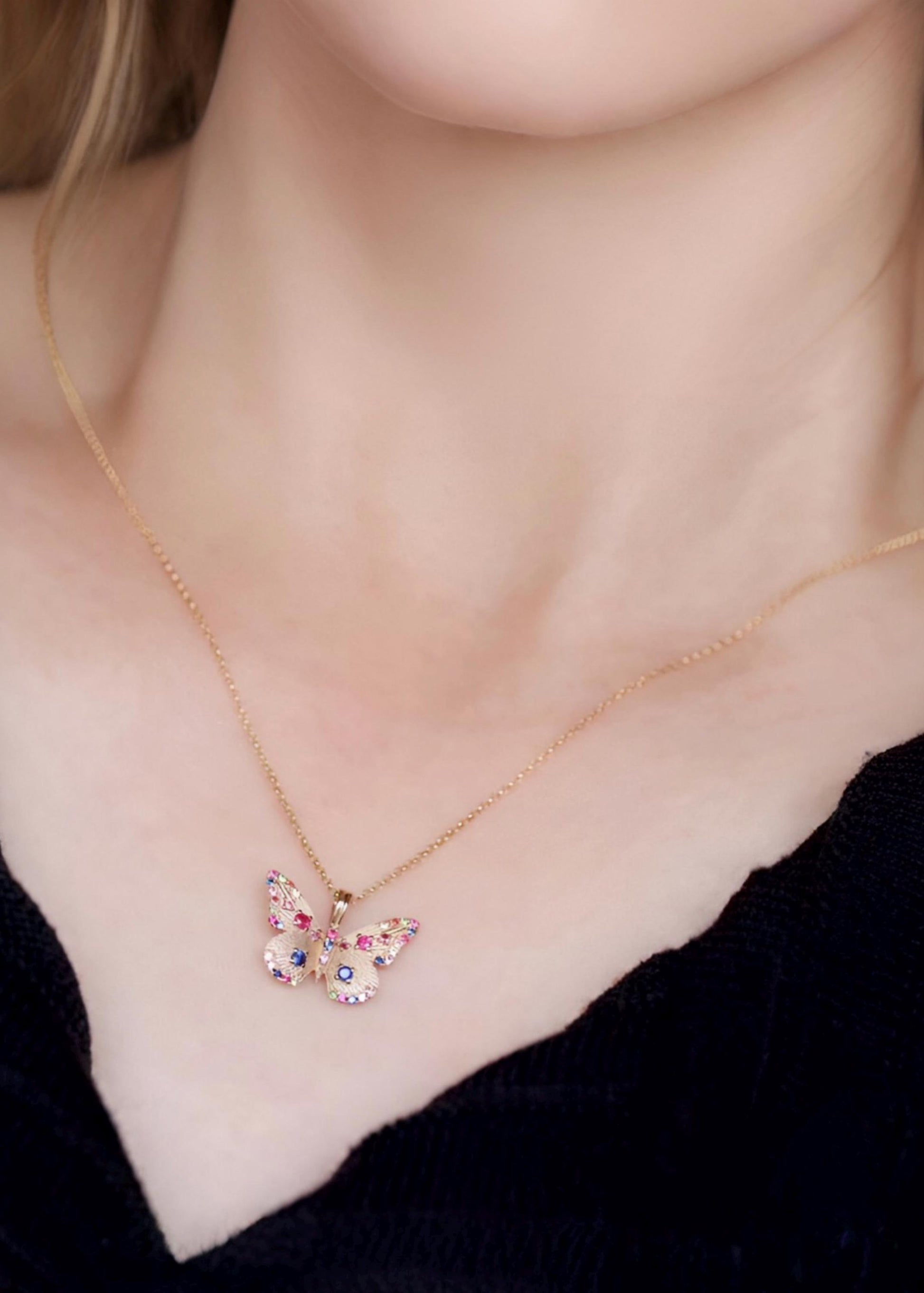 This handcrafted butterfly pendant is made in 18k solid gold and set with natural sapphires, rubies, and emeralds — each gem hand-placed to bring out the delicate motion and color of a butterfly mid-flight.