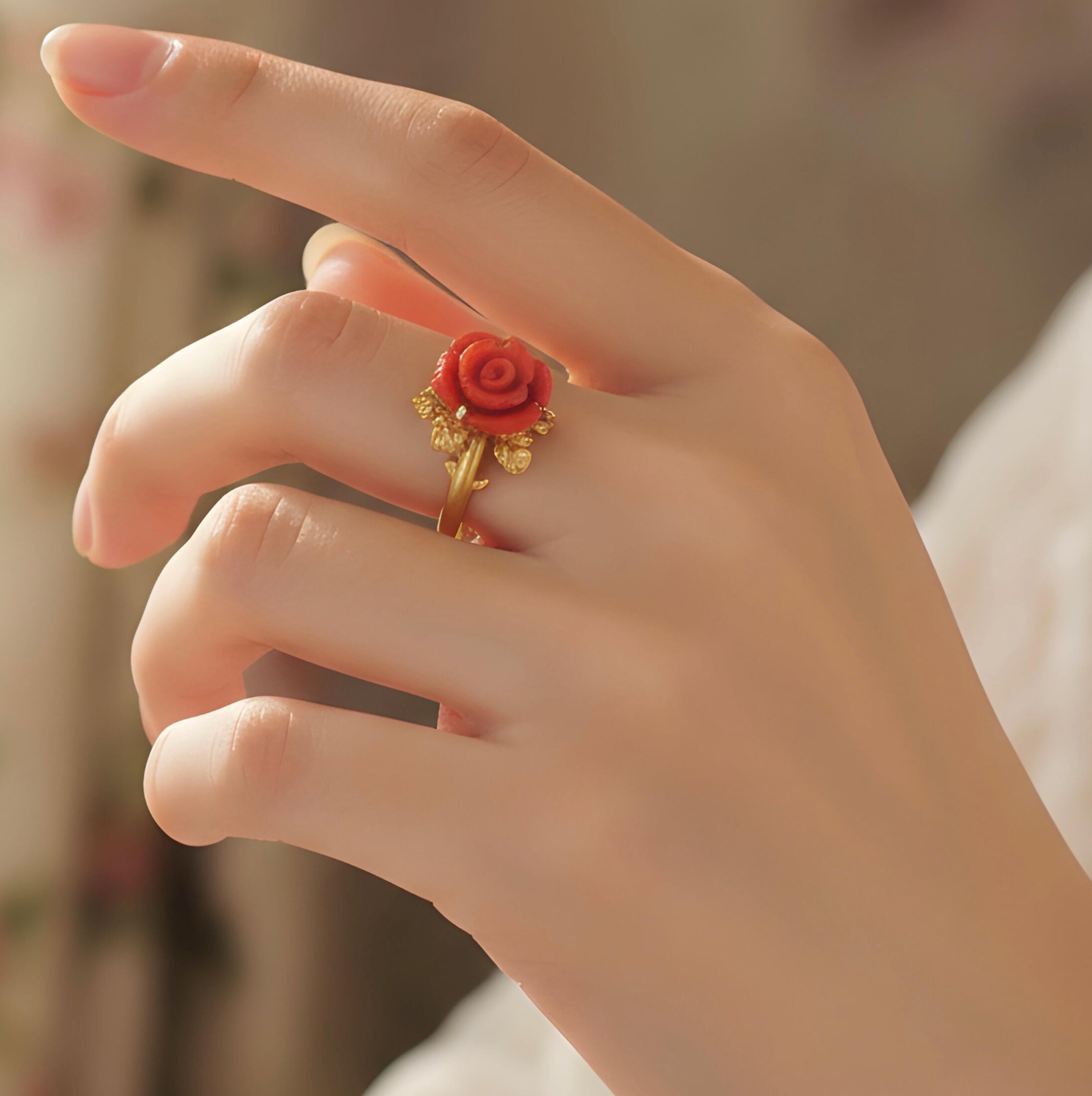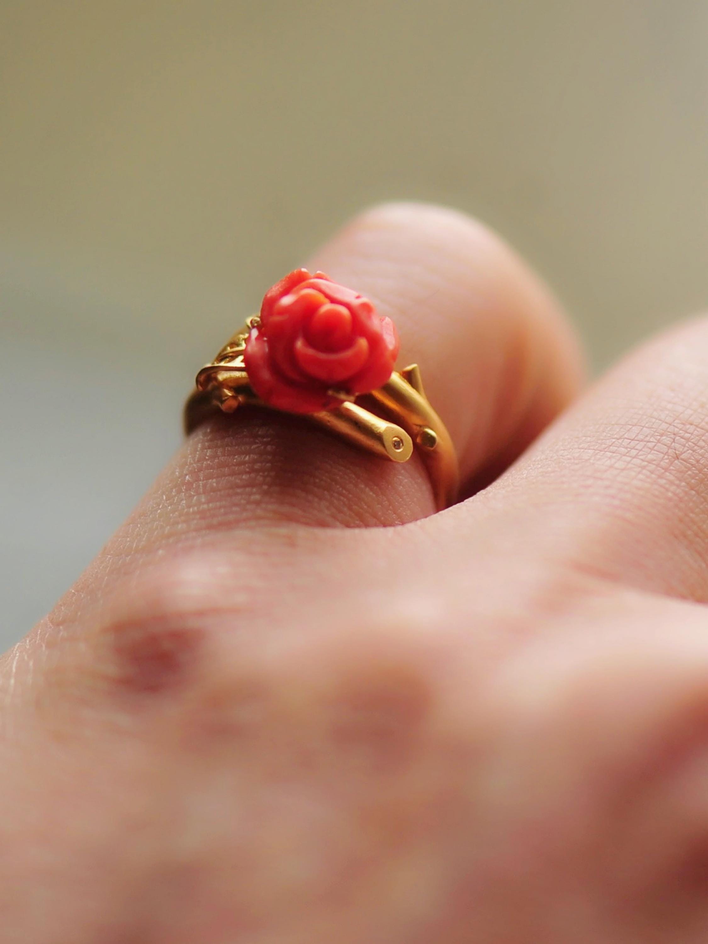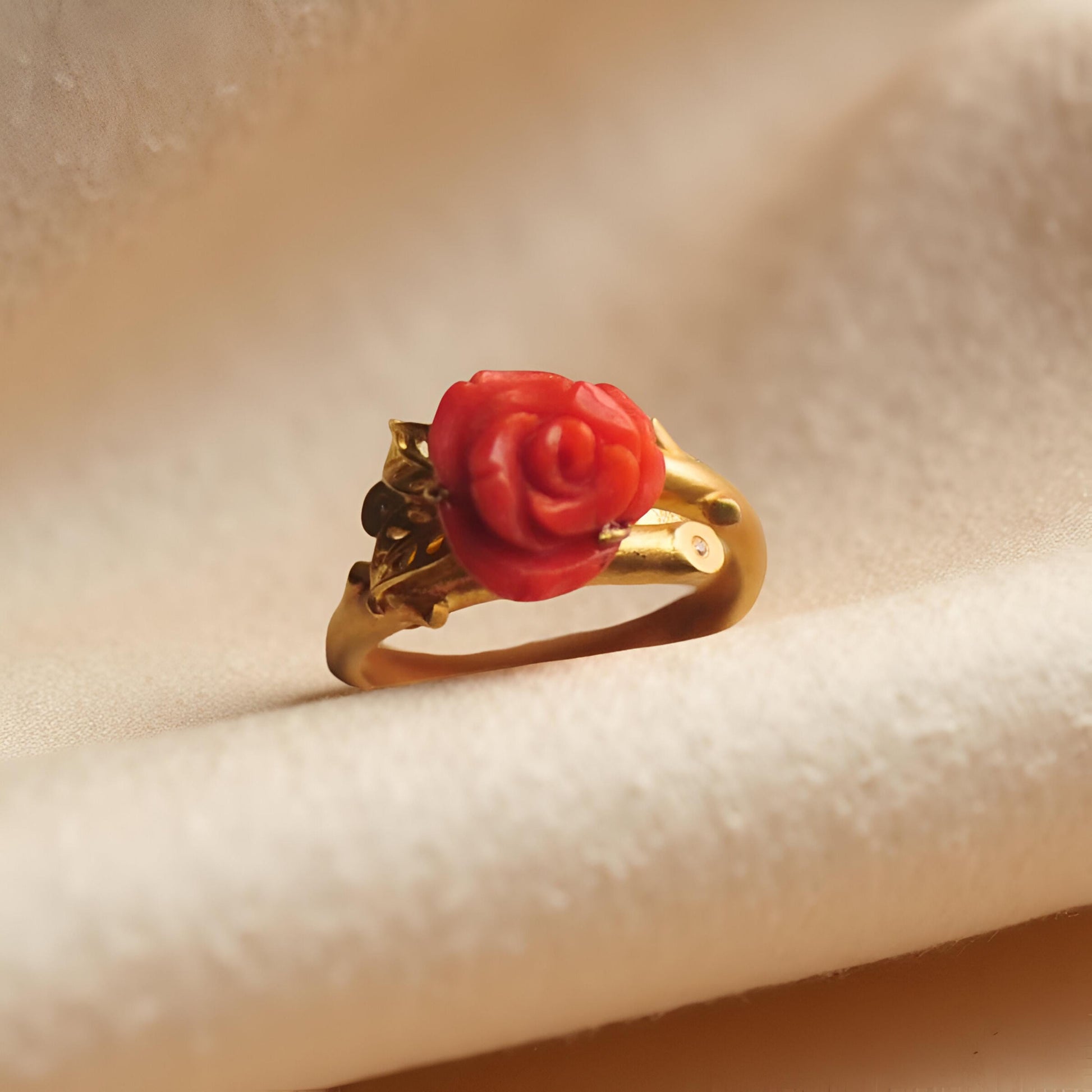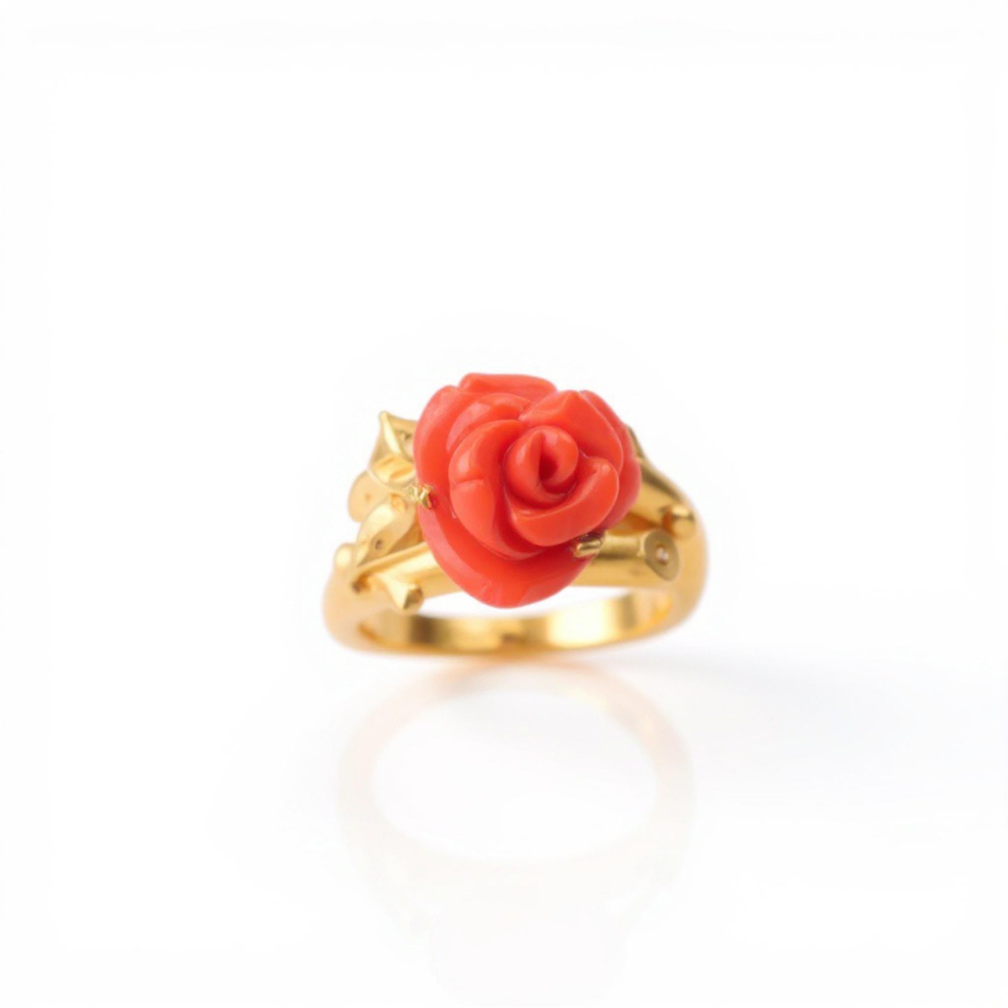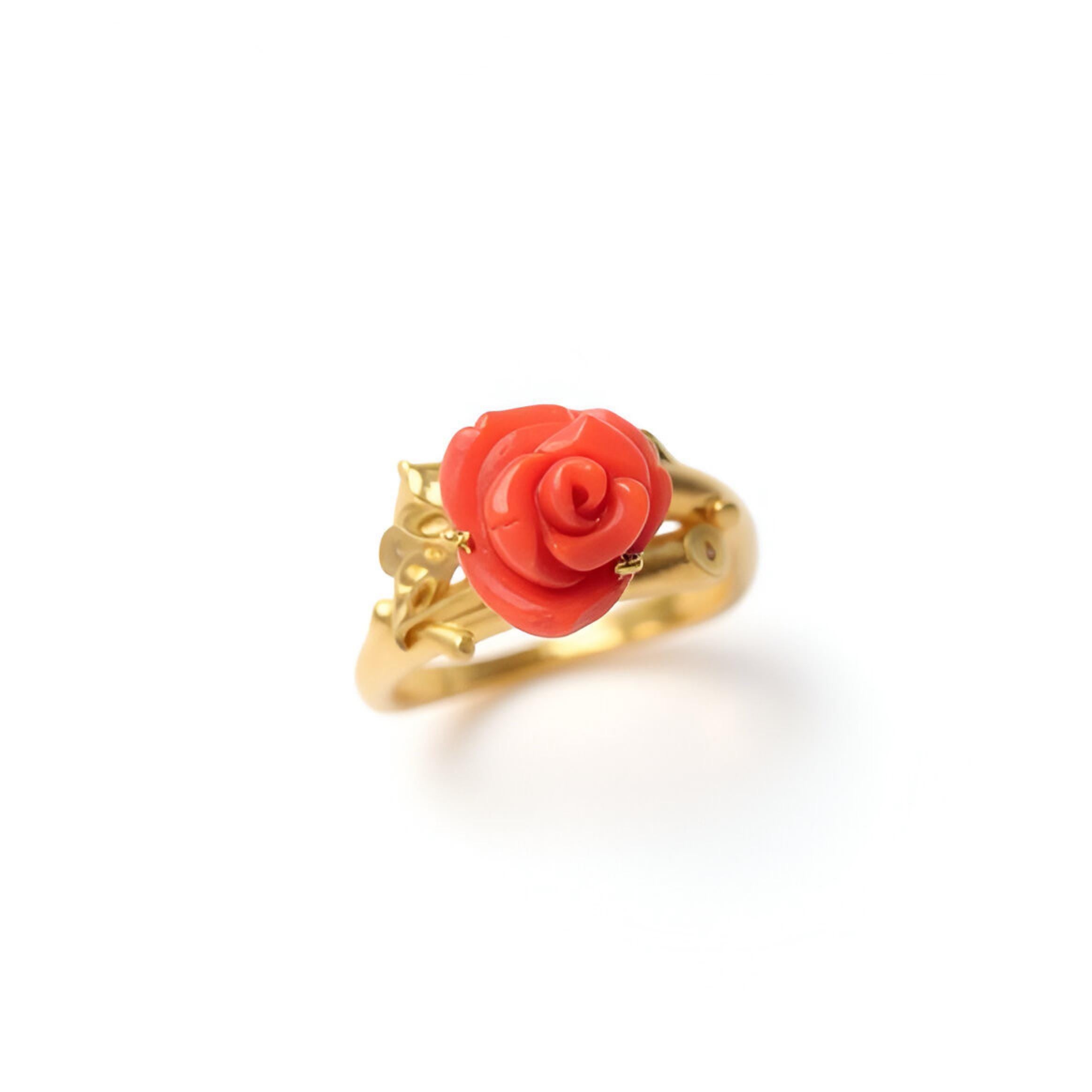 Bring timeless romance to your jewelry collection with this exquisite 18K gold coral rose ring. The centerpiece is a delicately hand-carved natural red coral rose, set on a finely detailed golden branch and leaf design. A true work of art, this ring captures the beauty of nature and the warmth of love.