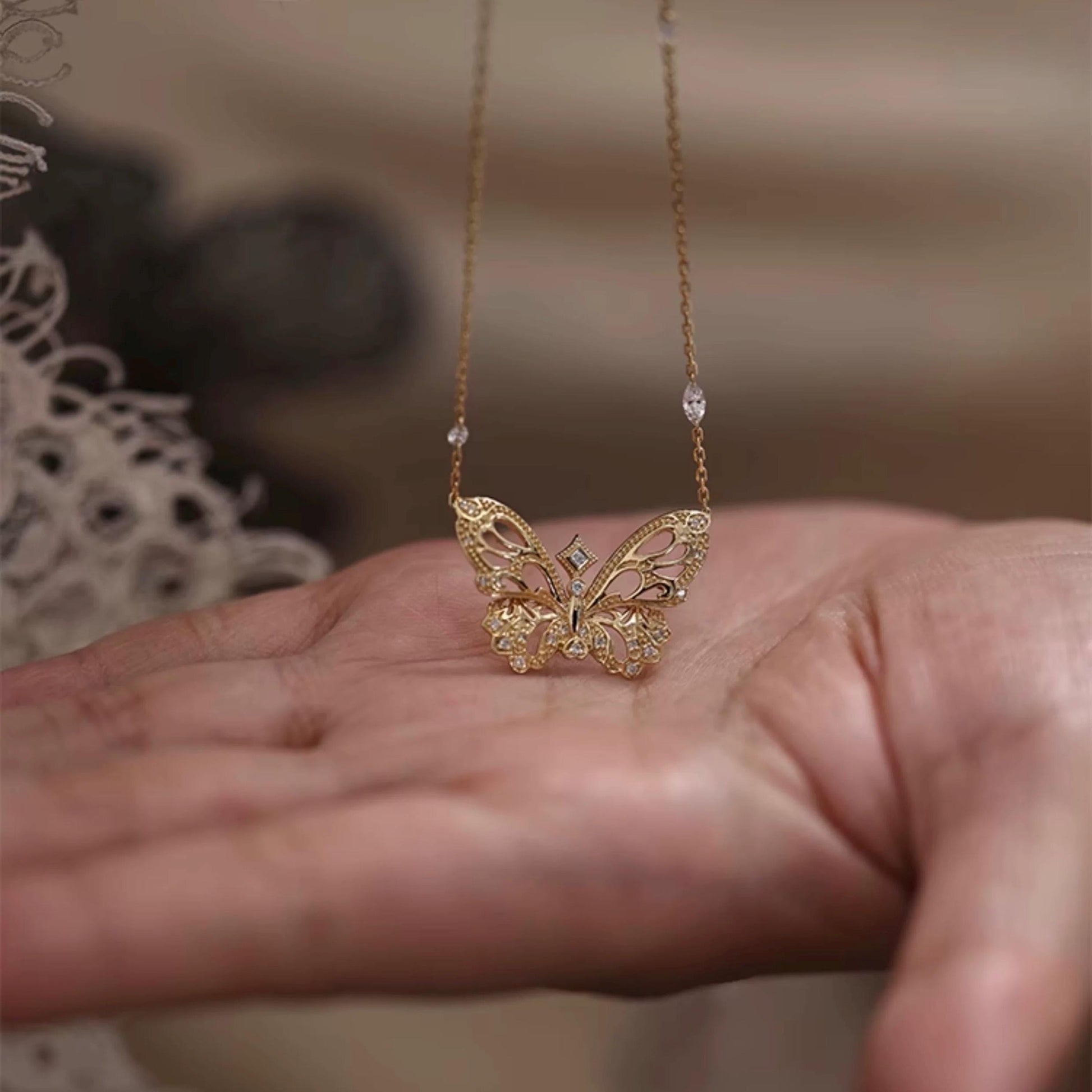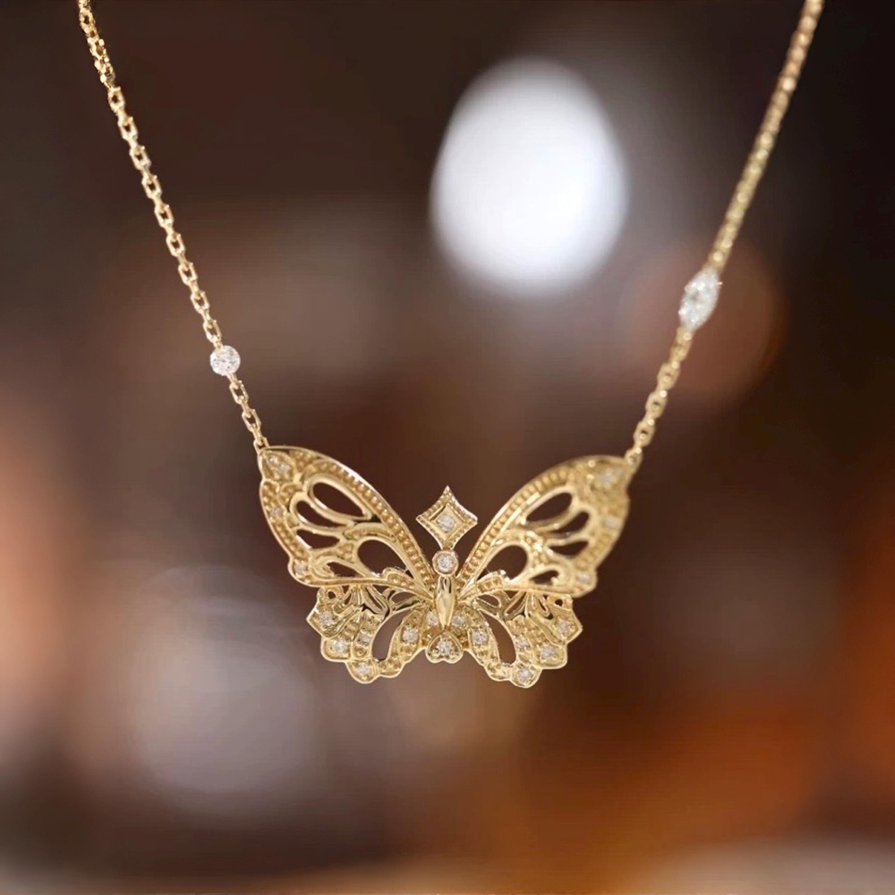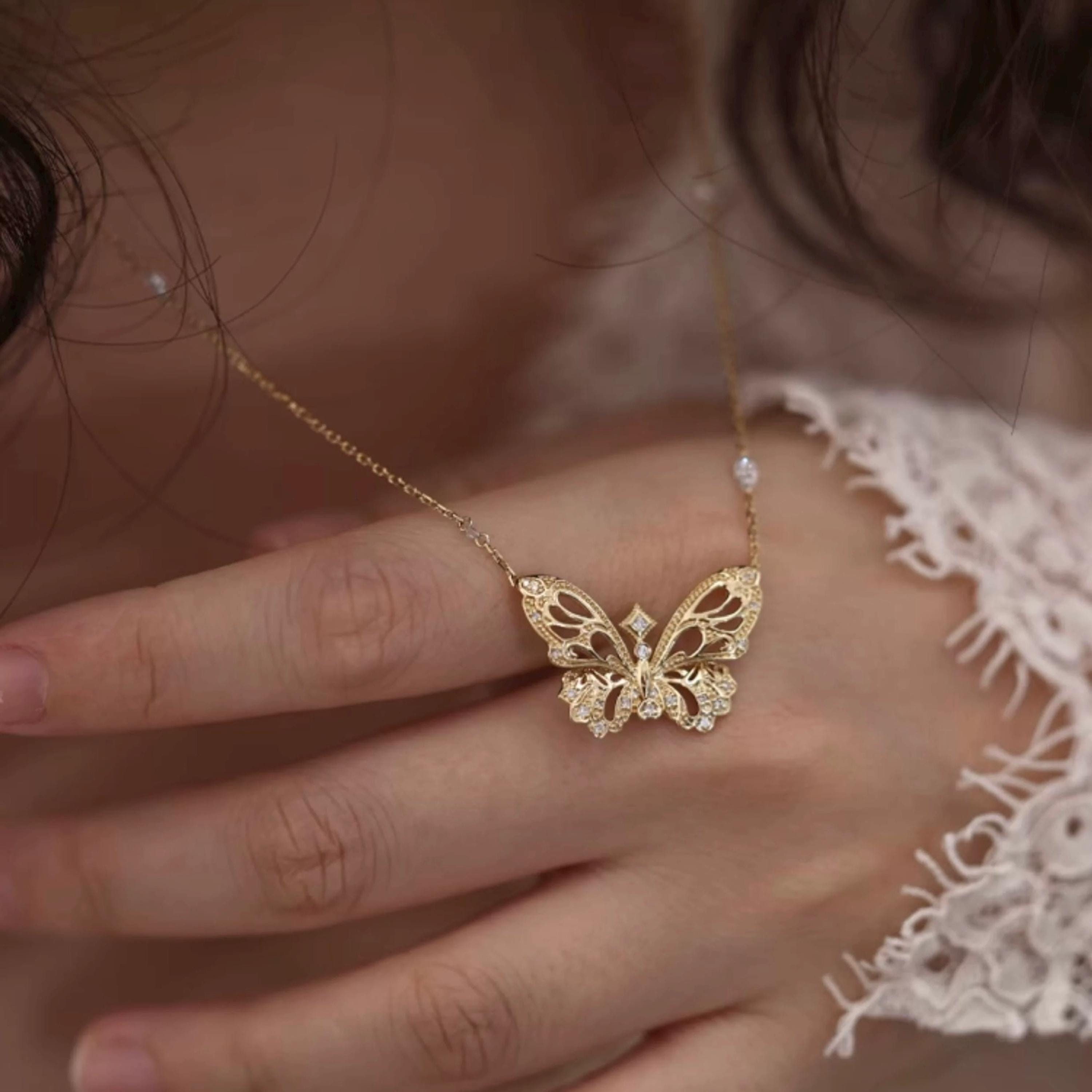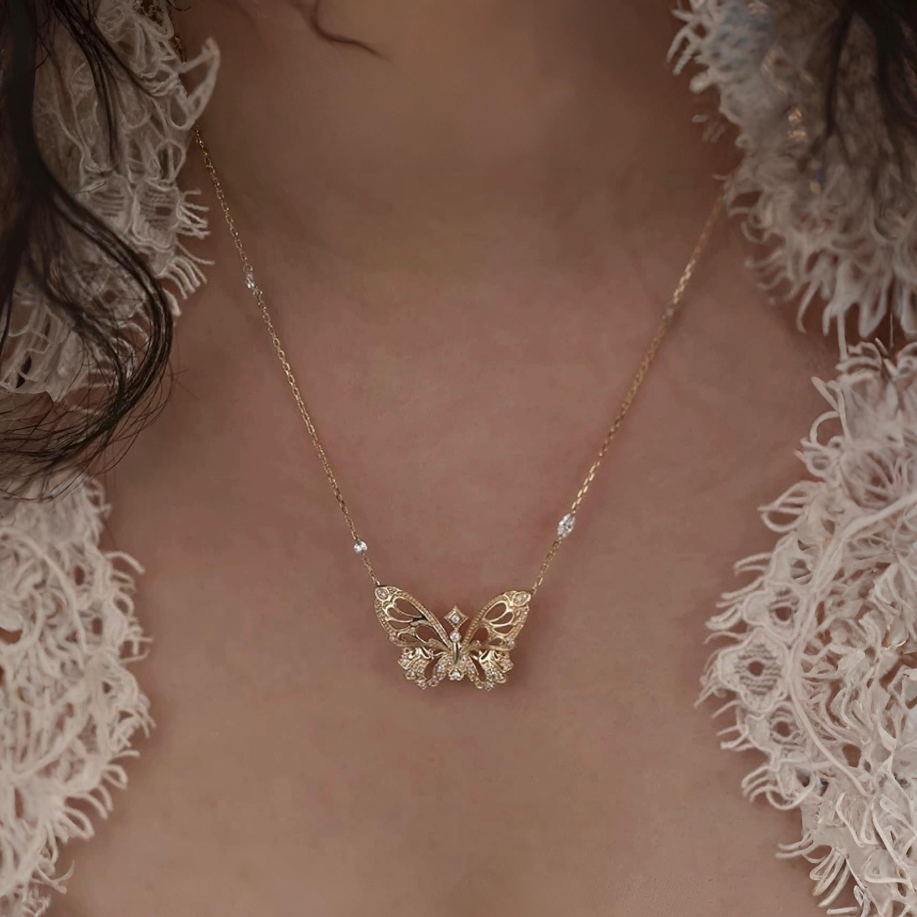 Each filigree detail is carved like lacework in gold, forming a butterfly that hovers delicately against the skin. It’s not just a necklace—it’s a tribute to courage, rebirth, and refined beauty.