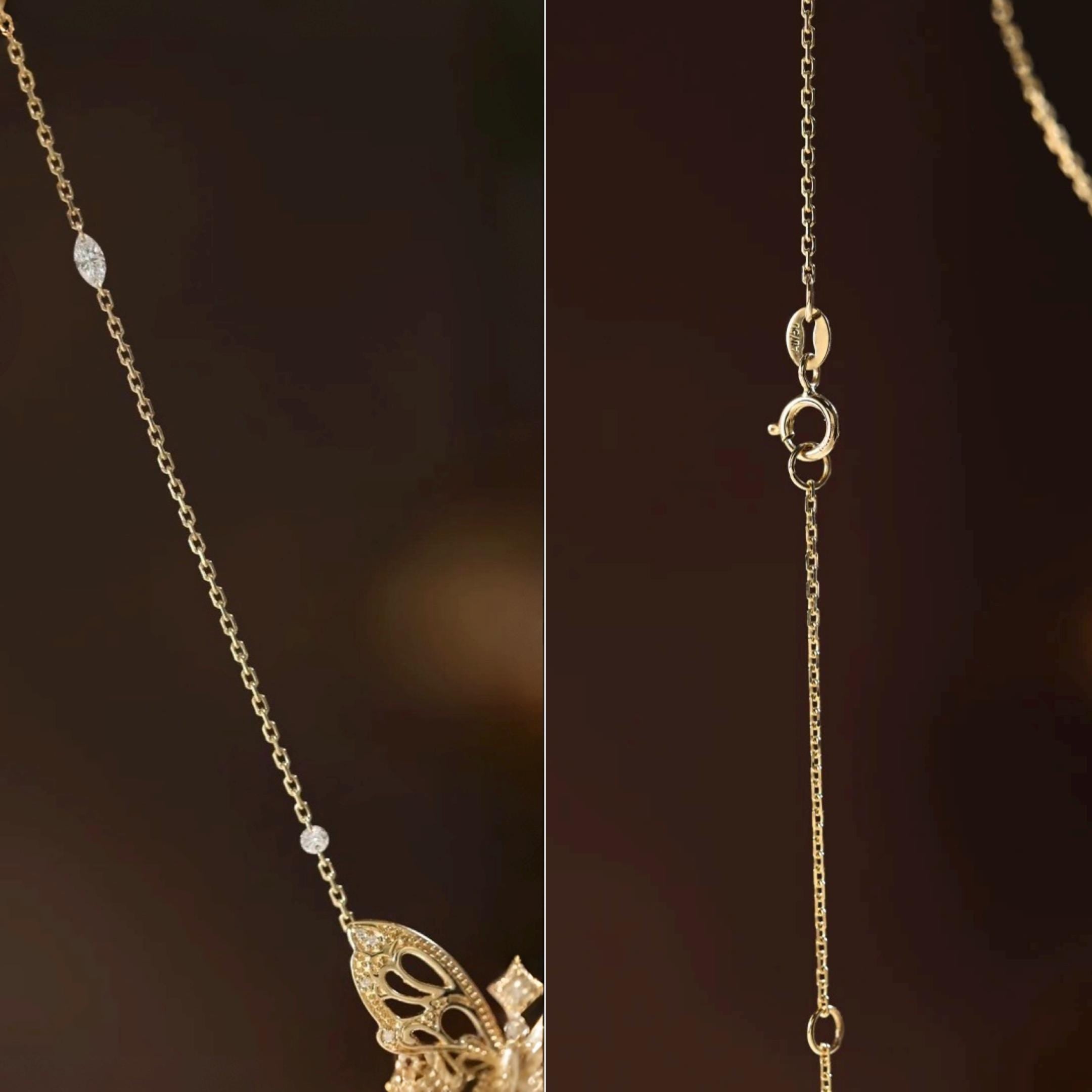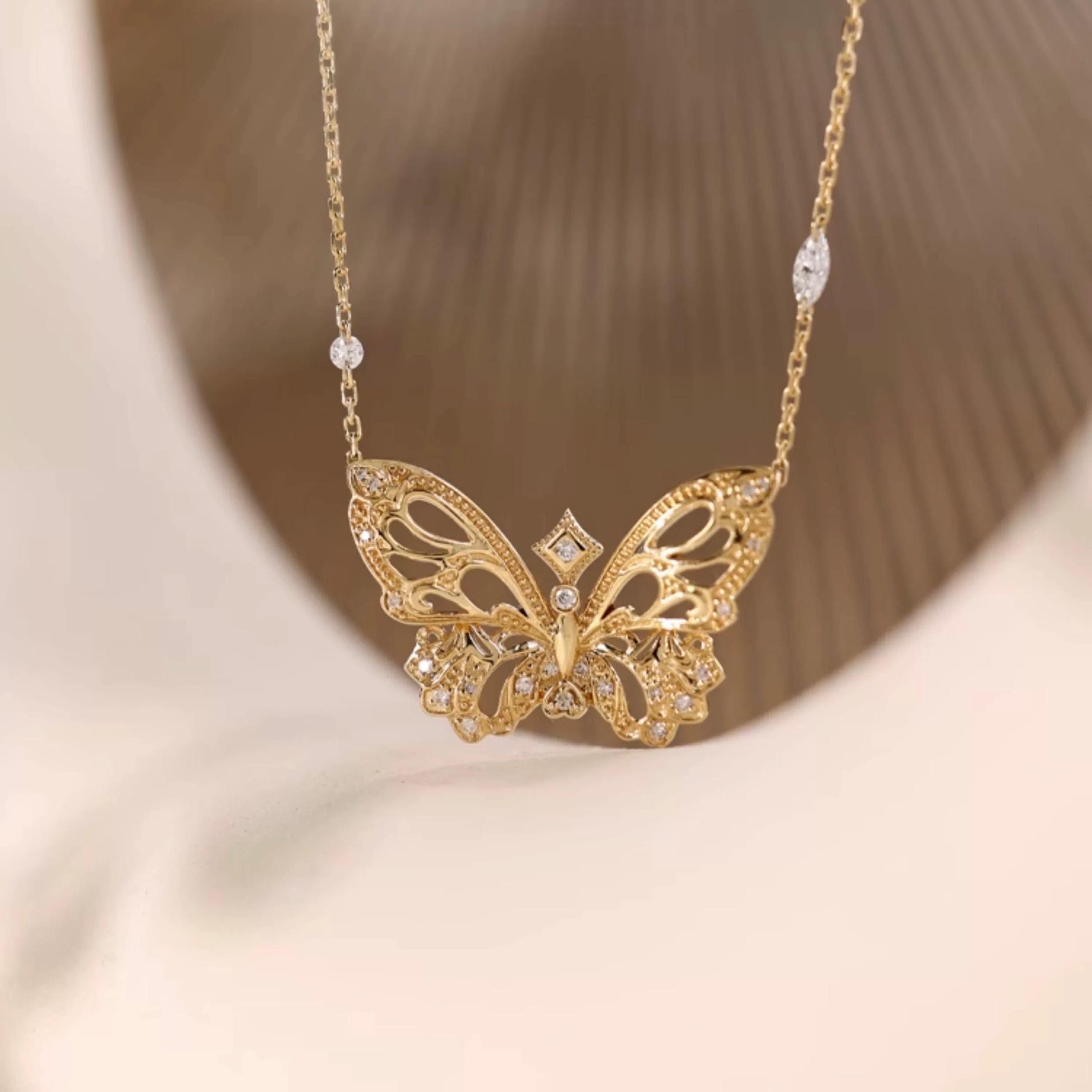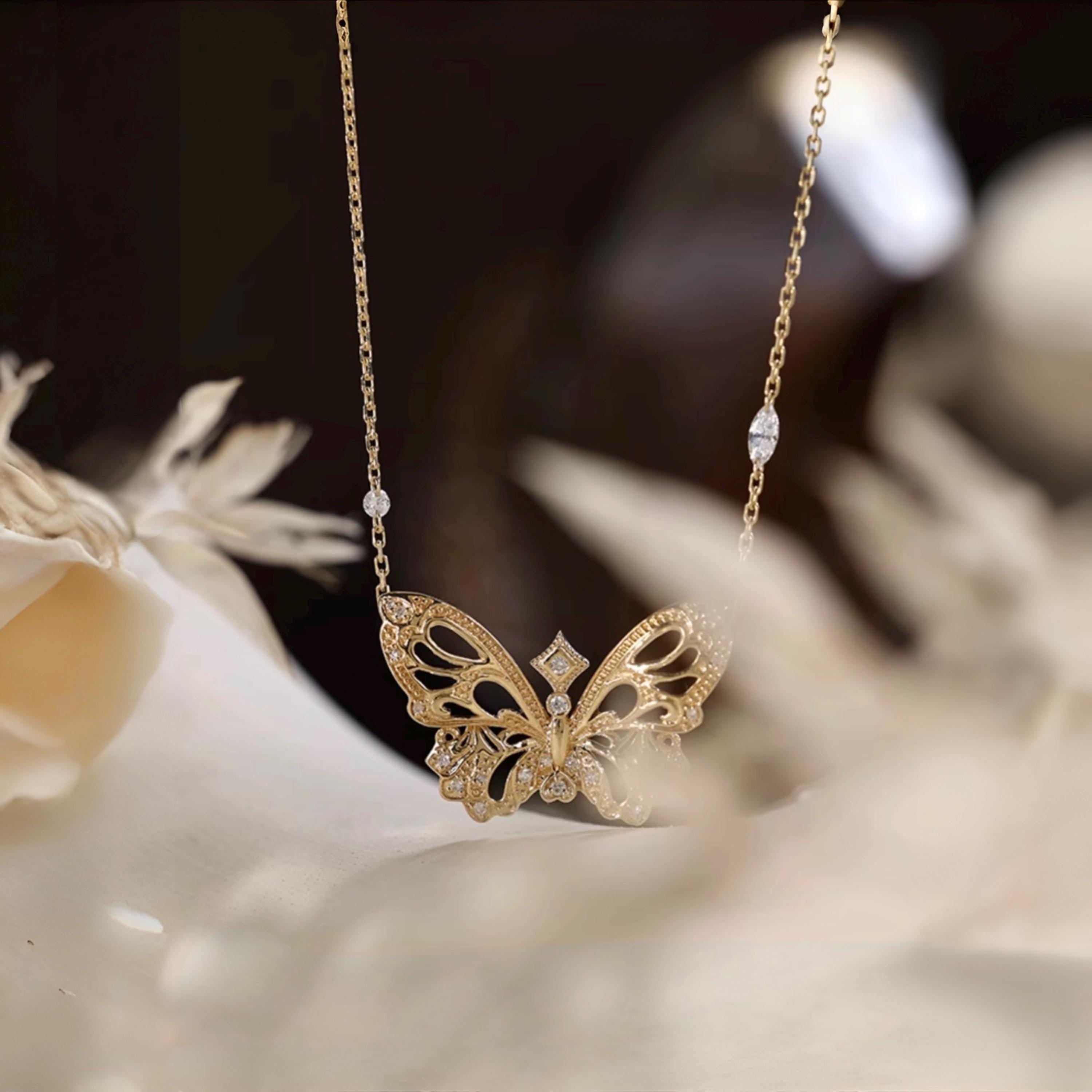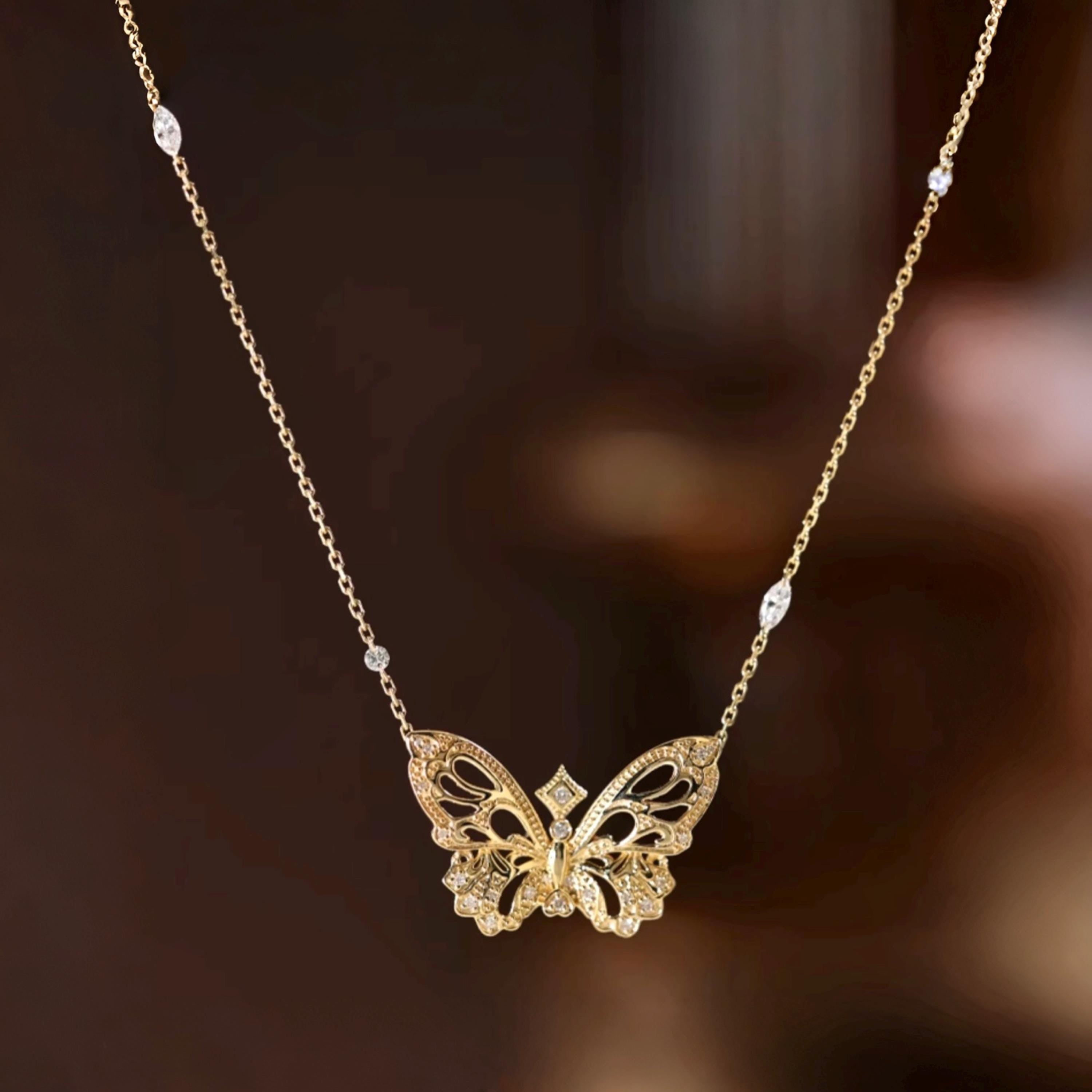 Each filigree detail is carved like lacework in gold, forming a butterfly that hovers delicately against the skin. It’s not just a necklace—it’s a tribute to courage, rebirth, and refined beauty.