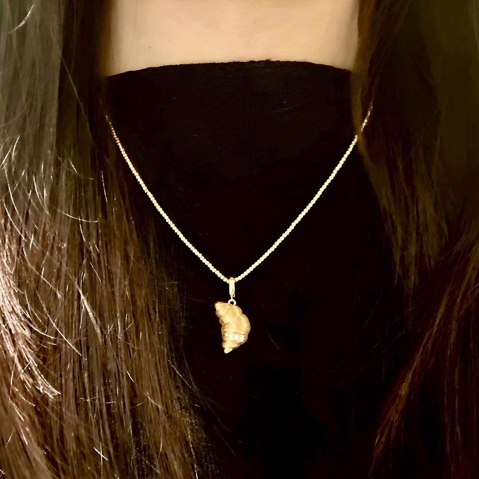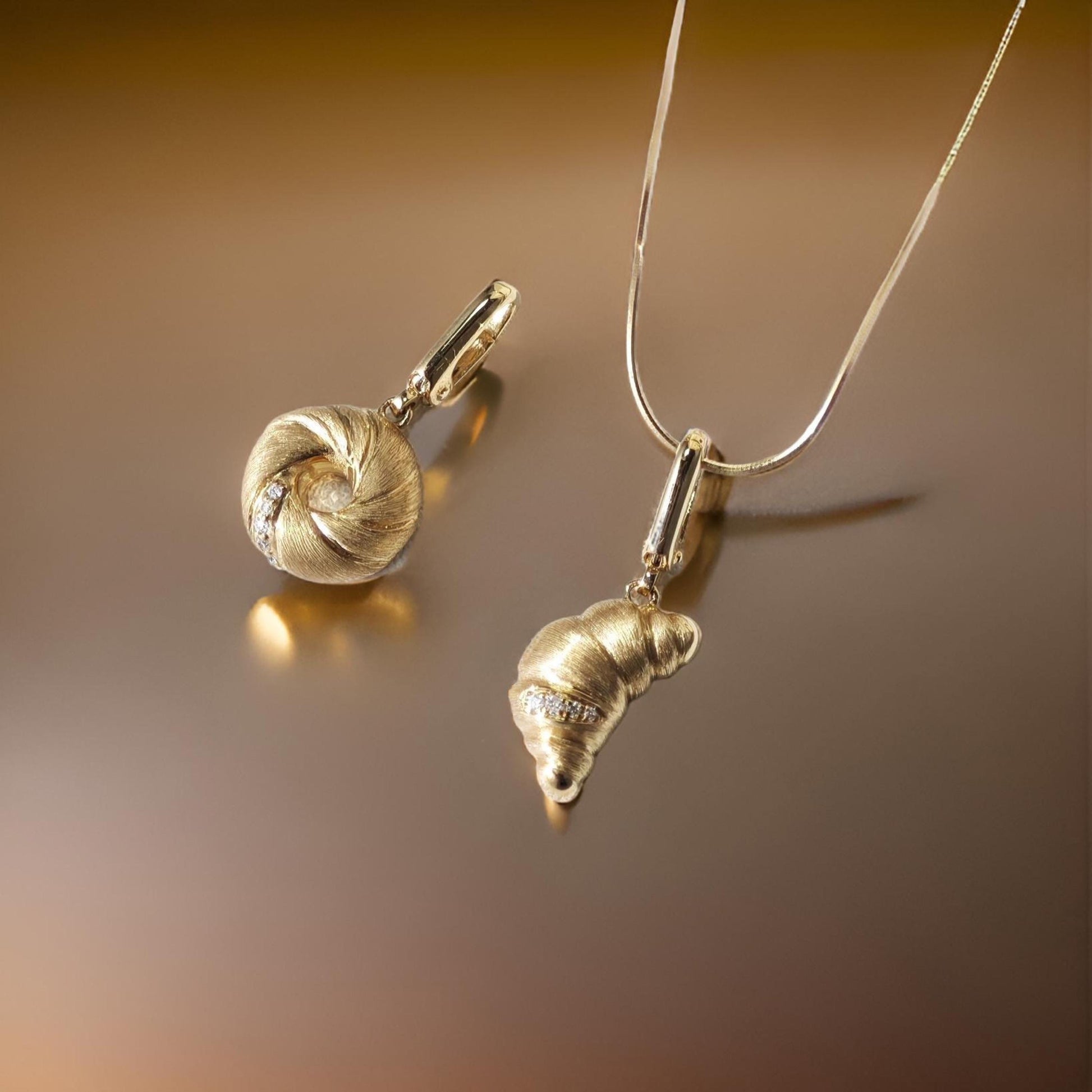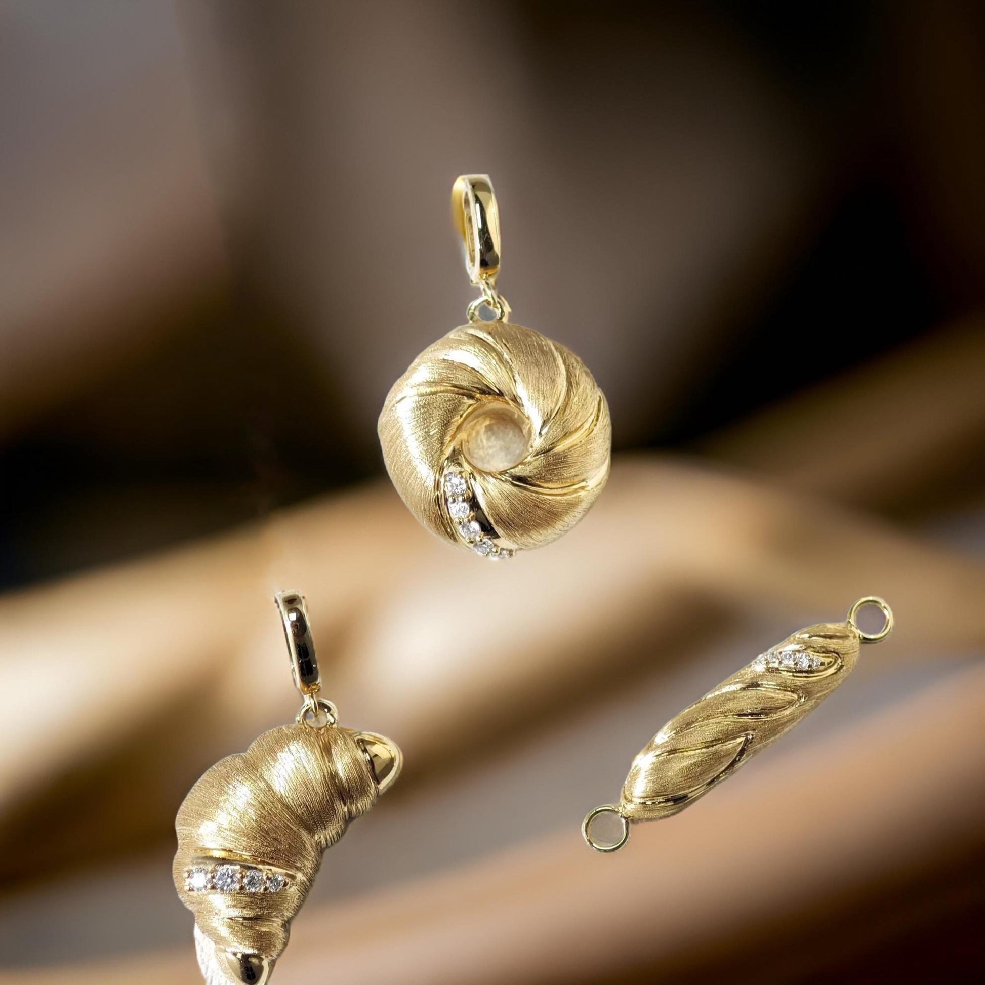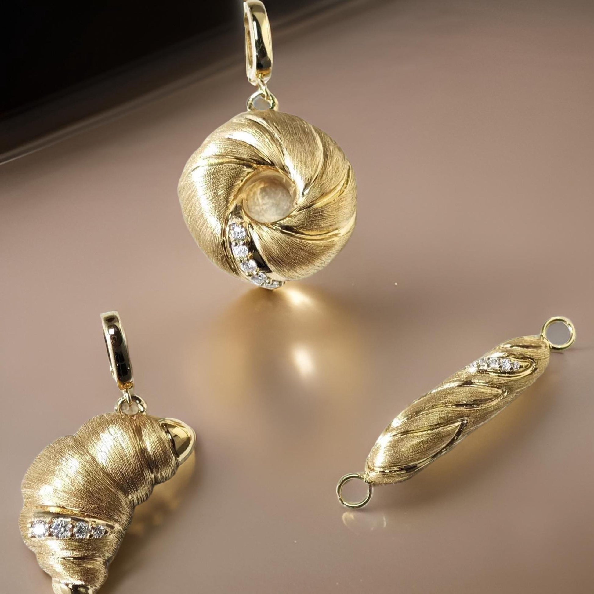 • The Croissant Charm: A buttery, golden delight captured in 18K solid gold, with diamonds that mimic sugar dusting.