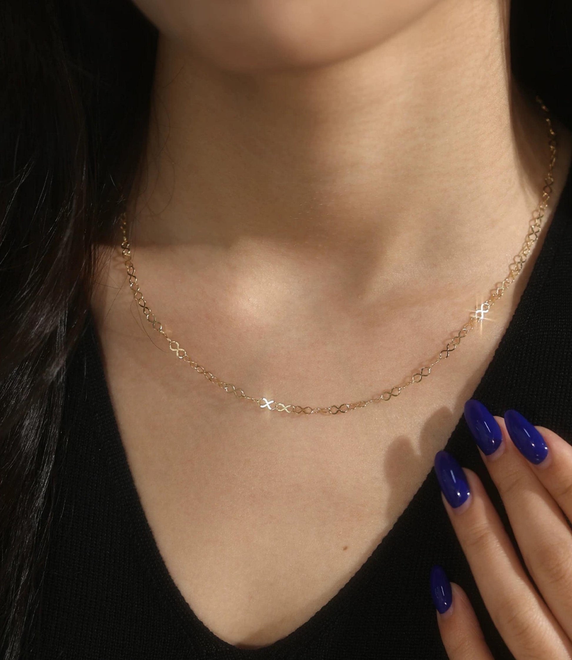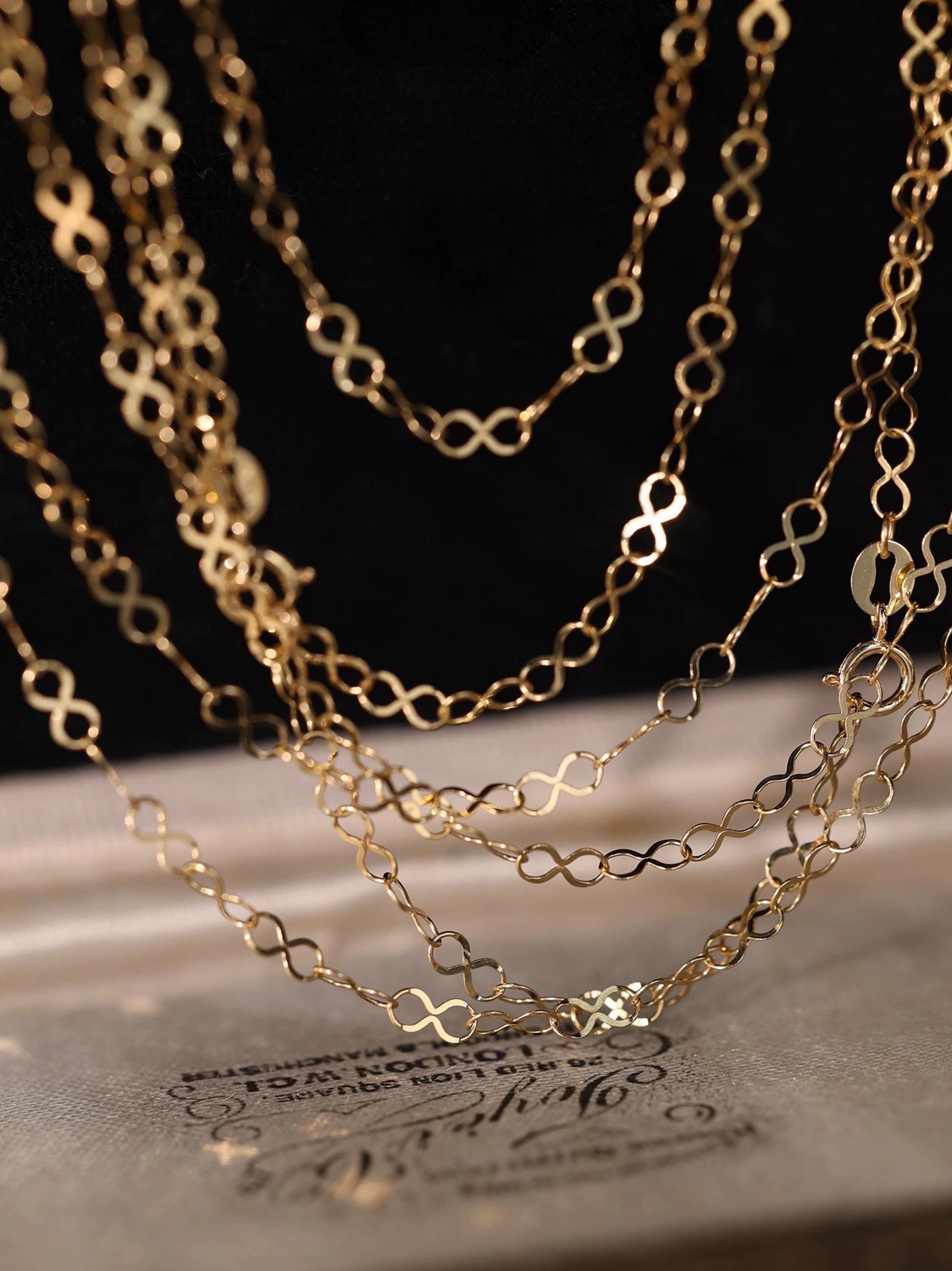 This refined chain is crafted in genuine 18K solid gold, featuring a continuous flow of figure-eight links — a symbol of balance, wholeness, and infinite beauty. Each loop is fluid and symmetrical, forming a graceful silhouette that shines with quiet sophistication.