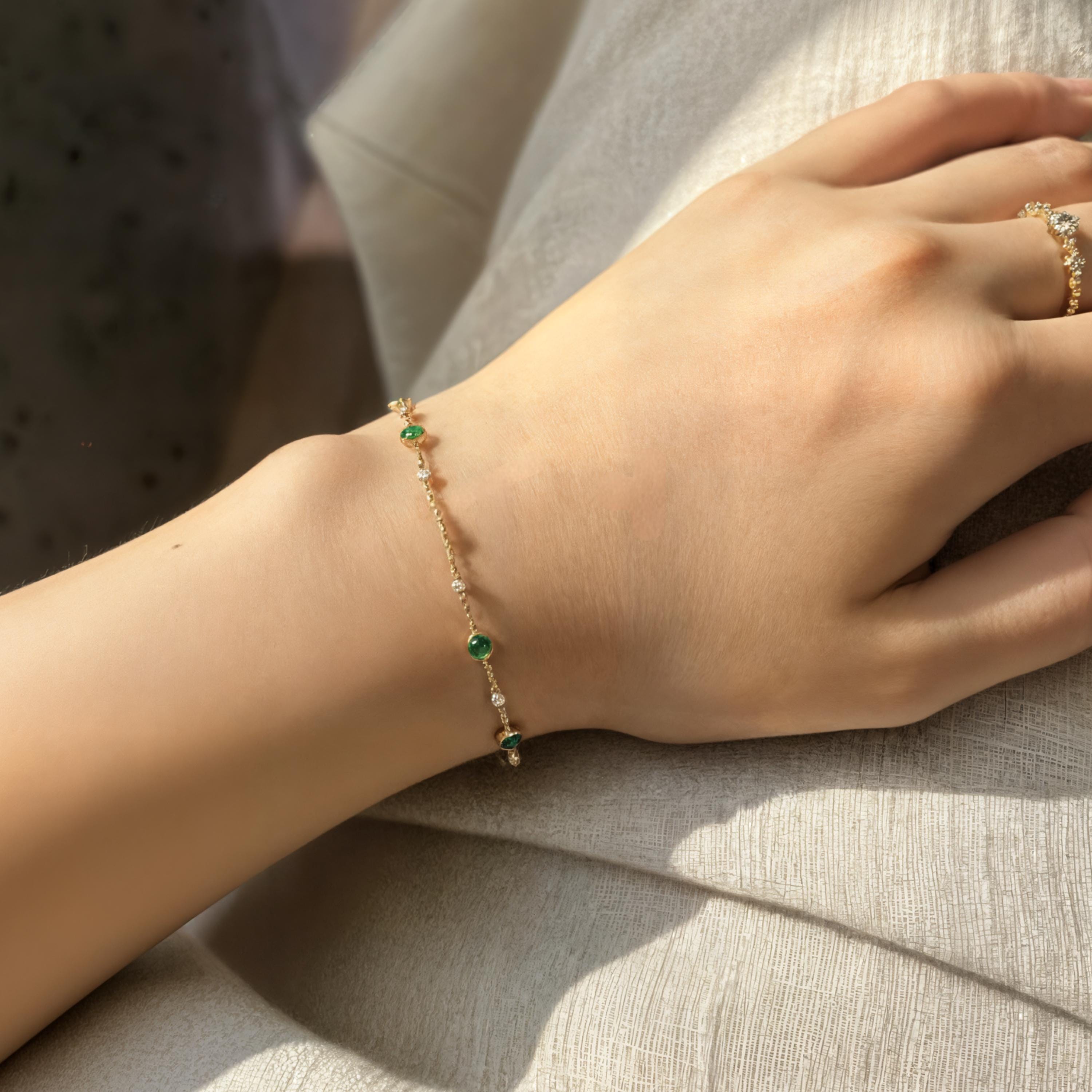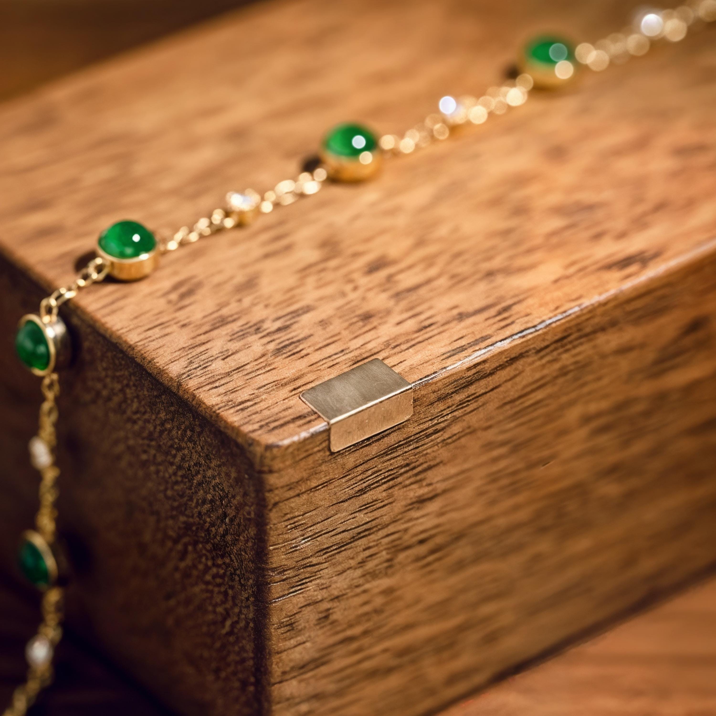 Each bracelet features six vivid A-grade jadeite cabochons (Type A, untreated) and seven sparkling natural diamonds, forming a graceful chain that glows with quiet luxury.