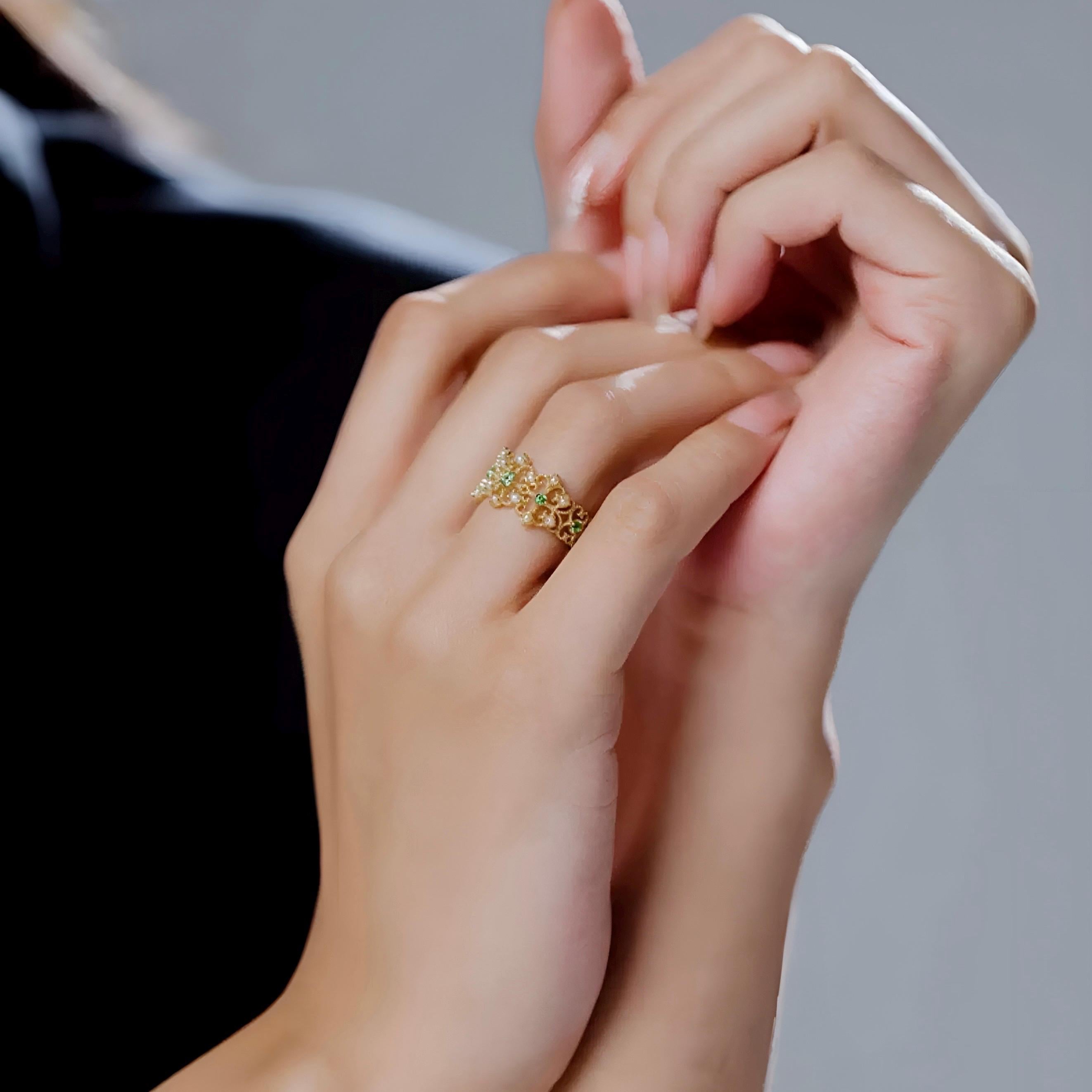 18K solid gold lace ring that feels like it belongs to a fairytale. Crafted with exquisite attention to detail, this ring features intricate floral lacework adorned with natural Tsavorite garnets and delicate saltwater pearls.