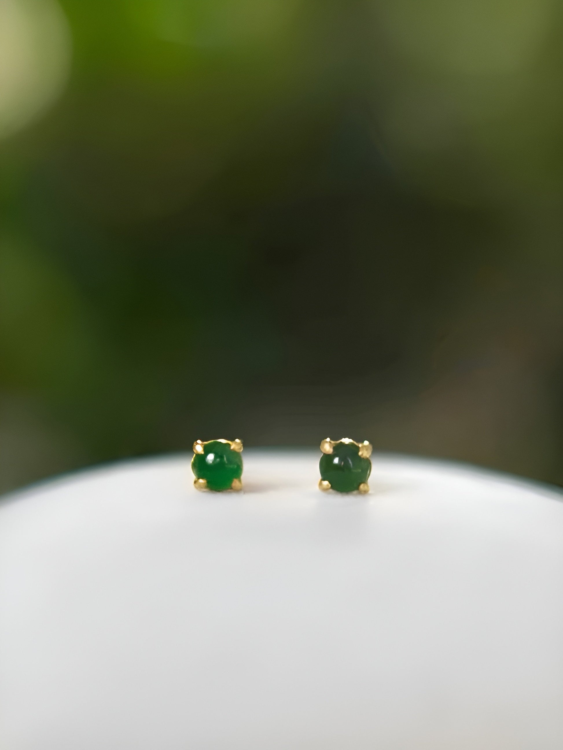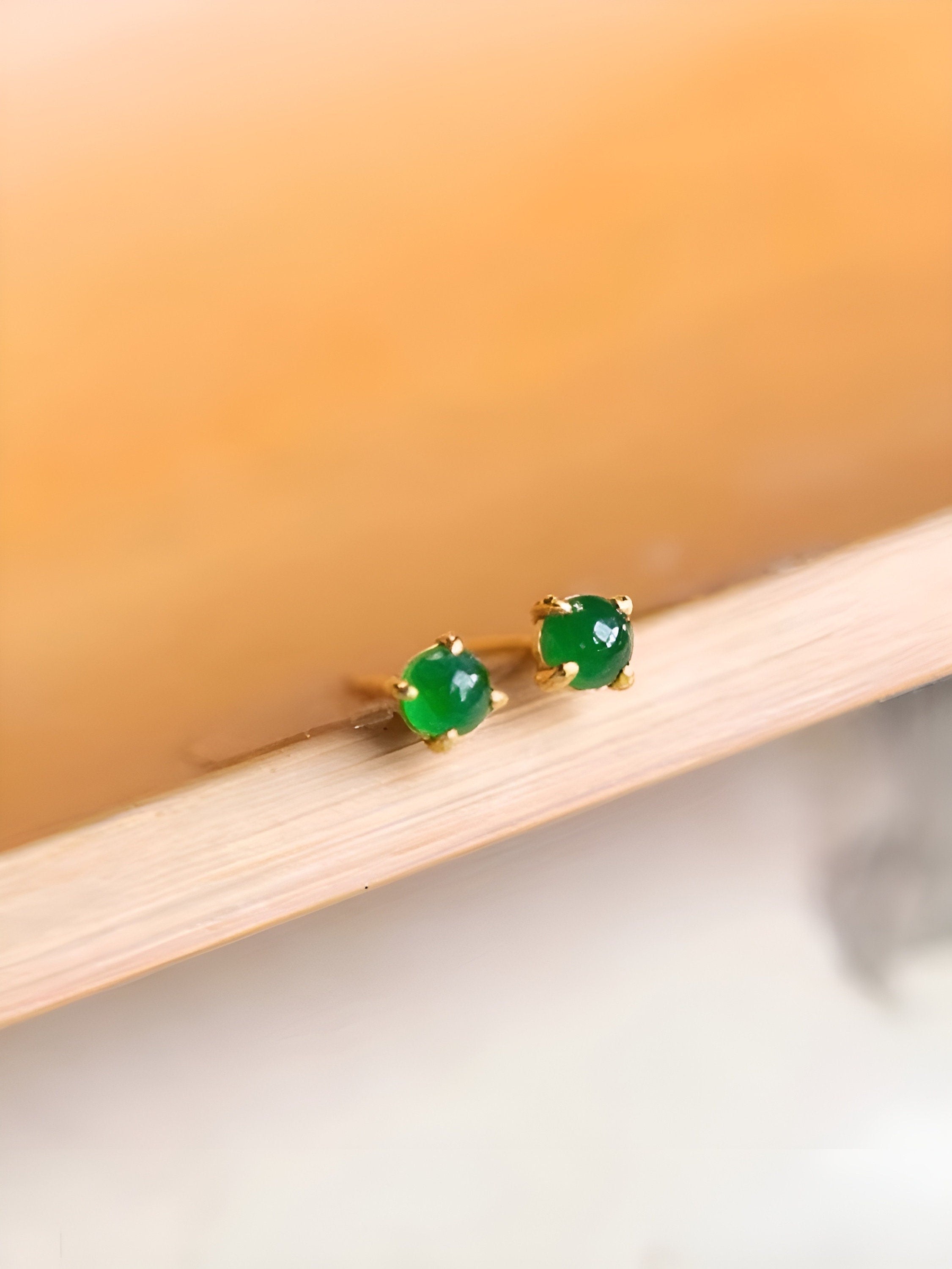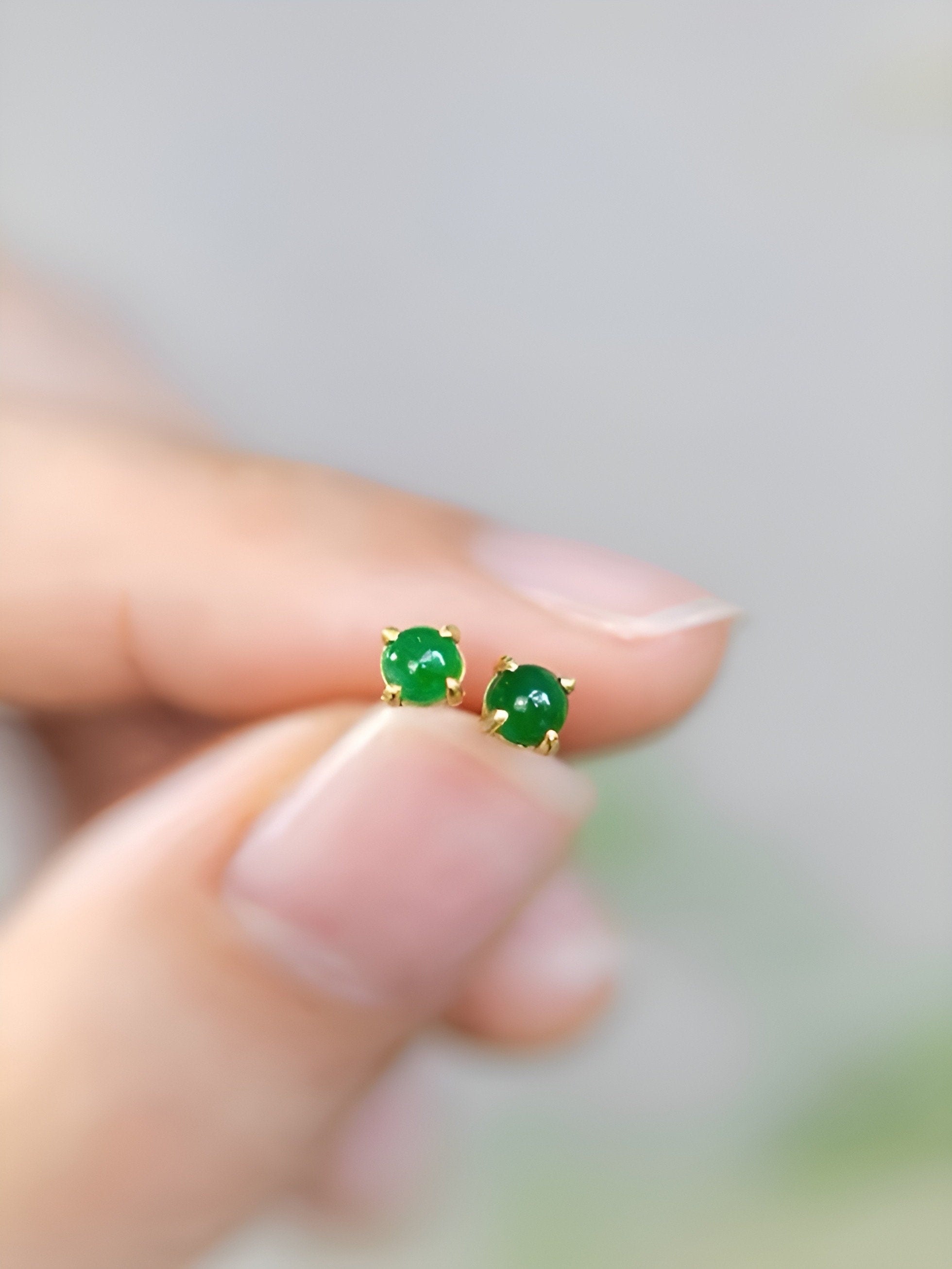 A simple yet extraordinary pair of stud earrings crafted from premium, natural Grade A jadeite. The material is smooth, translucent, and radiantly clear with a vibrant, rich green color. The earring posts are made of 18k solid gold, adding a touch of luxury and elegance. These petite, delicate earrings are perfect for everyday wear and can even be kept on while sleeping, making them ideal for nurturing new piercings. The jade cabochons are fine-textured, boasting a lustrous green hue that remains stunning in both natural and sunlight.