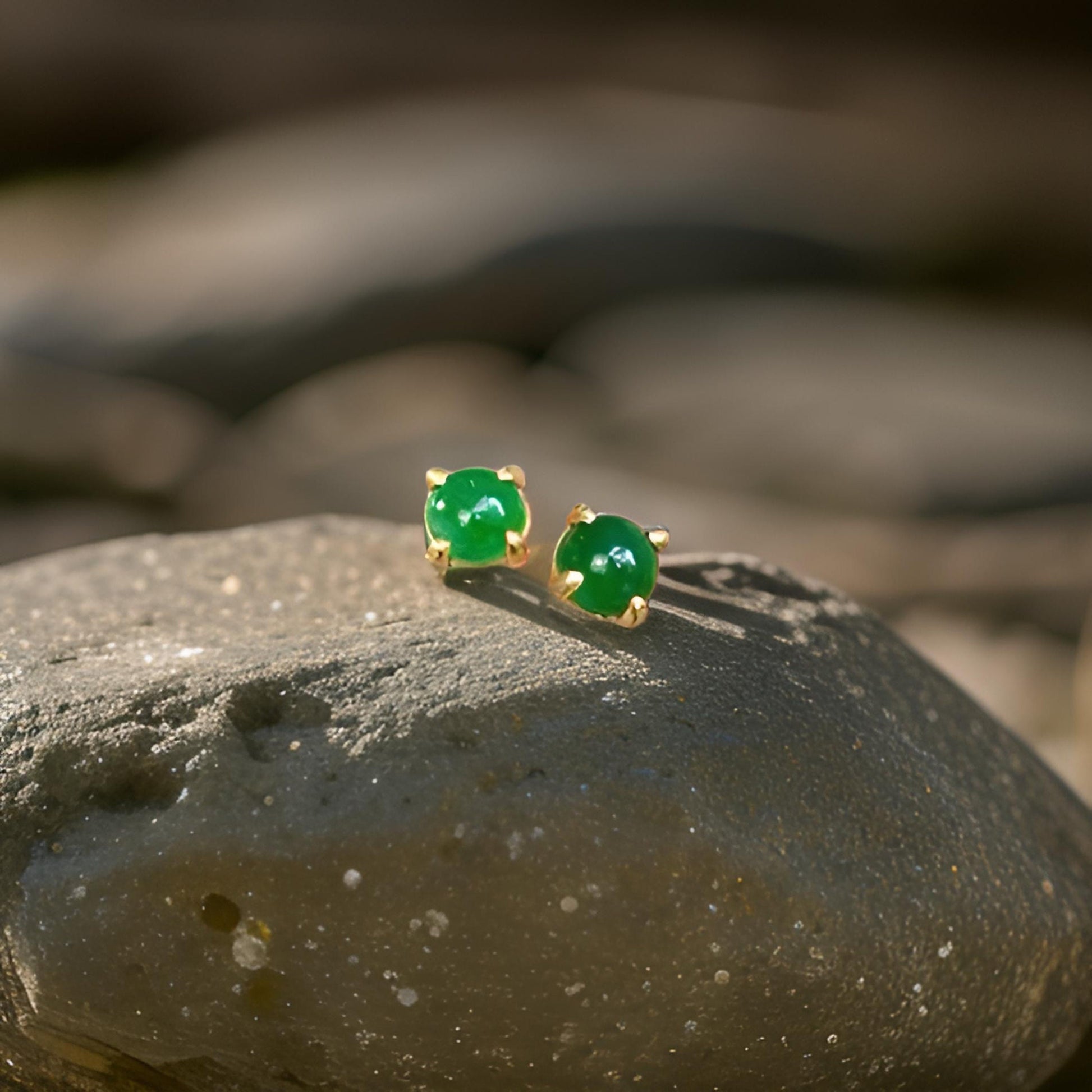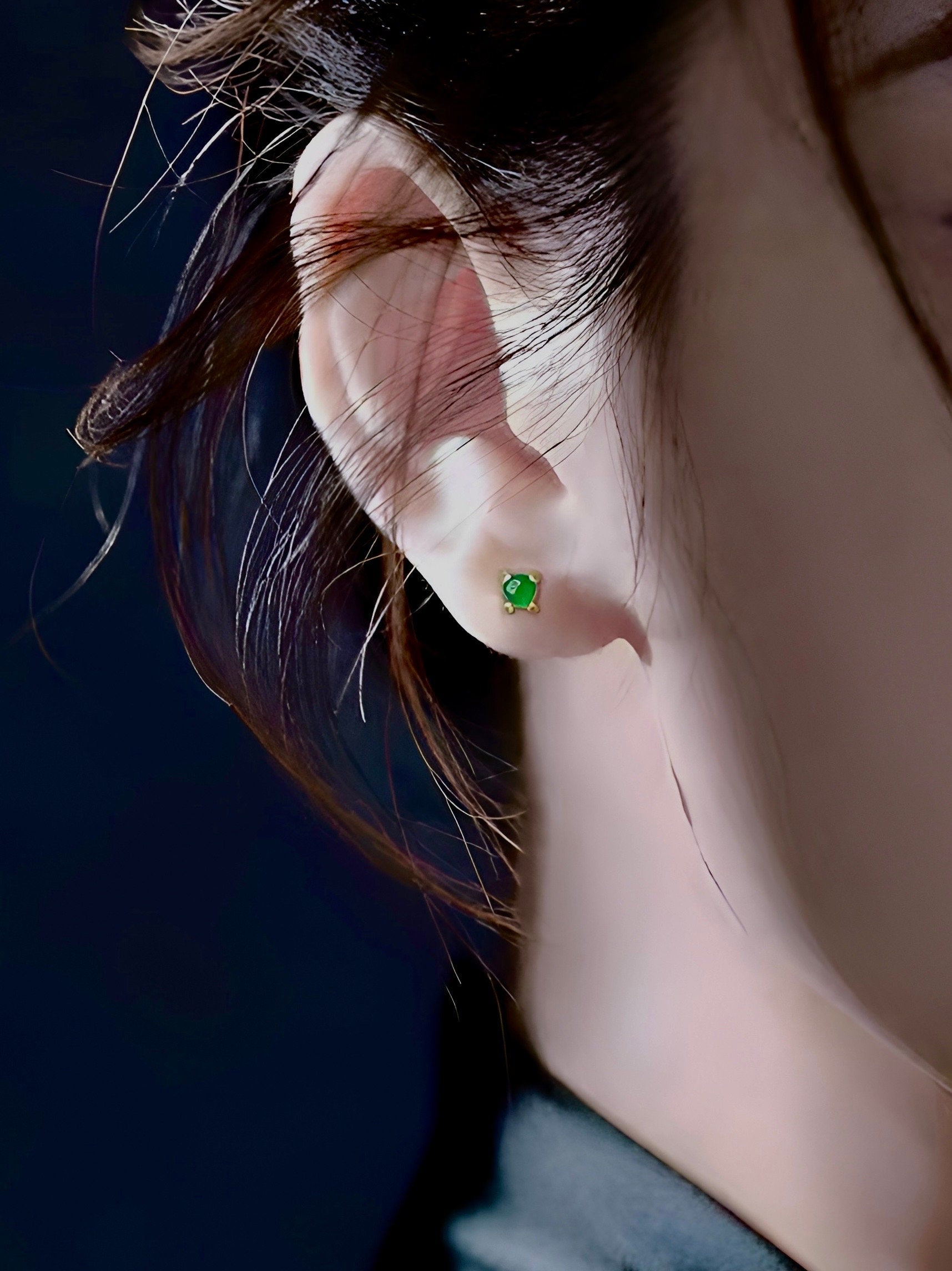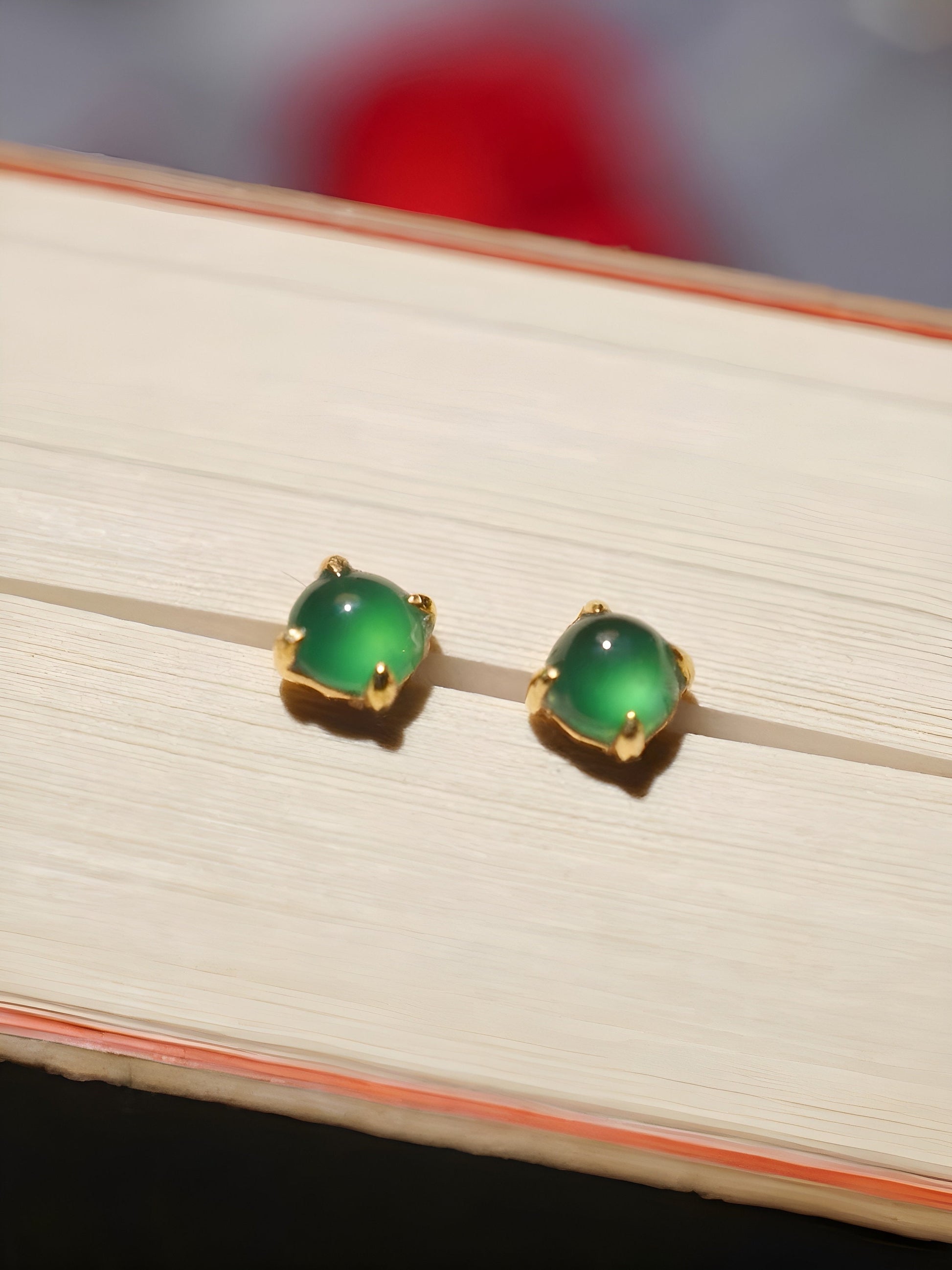 A simple yet extraordinary pair of stud earrings crafted from premium, natural Grade A jadeite. The material is smooth, translucent, and radiantly clear with a vibrant, rich green color. The earring posts are made of 18k solid gold, adding a touch of luxury and elegance. These petite, delicate earrings are perfect for everyday wear and can even be kept on while sleeping, making them ideal for nurturing new piercings. The jade cabochons are fine-textured, boasting a lustrous green hue that remains stunning in both natural and sunlight.