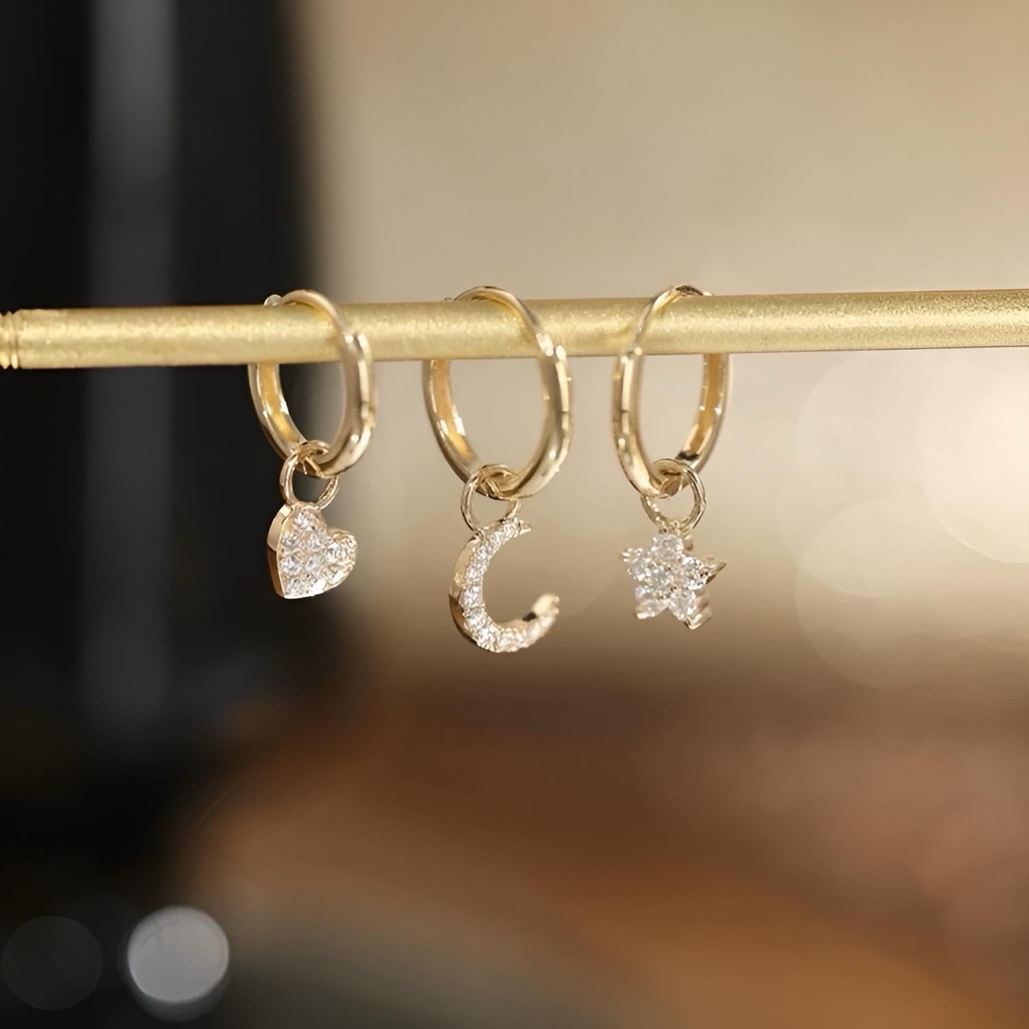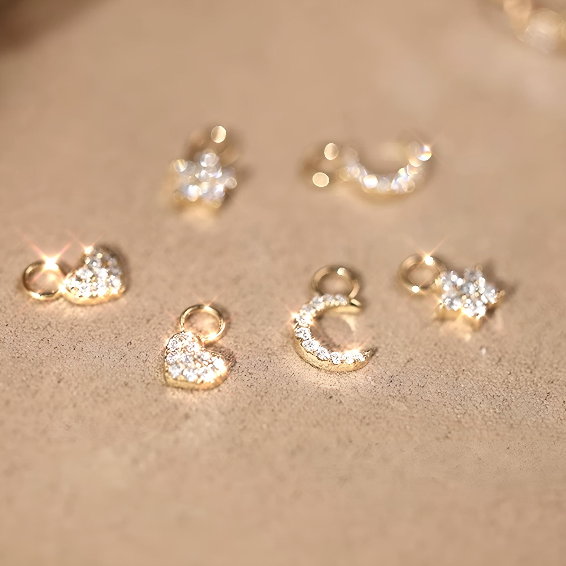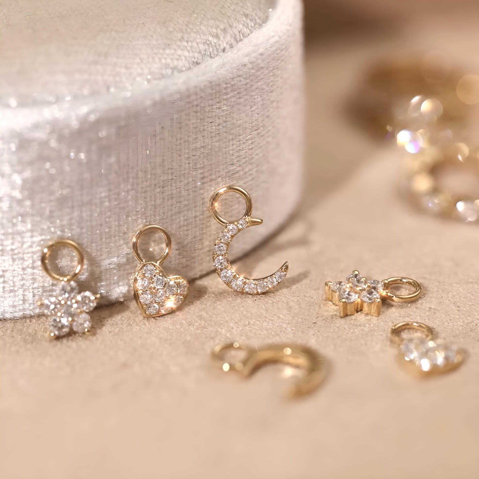 18K Solid Gold Pavé Diamond Charms – Crescent Moon, Heart & Flower | Dainty Charms for Hoops Earrings or Bracelets, Gift for her