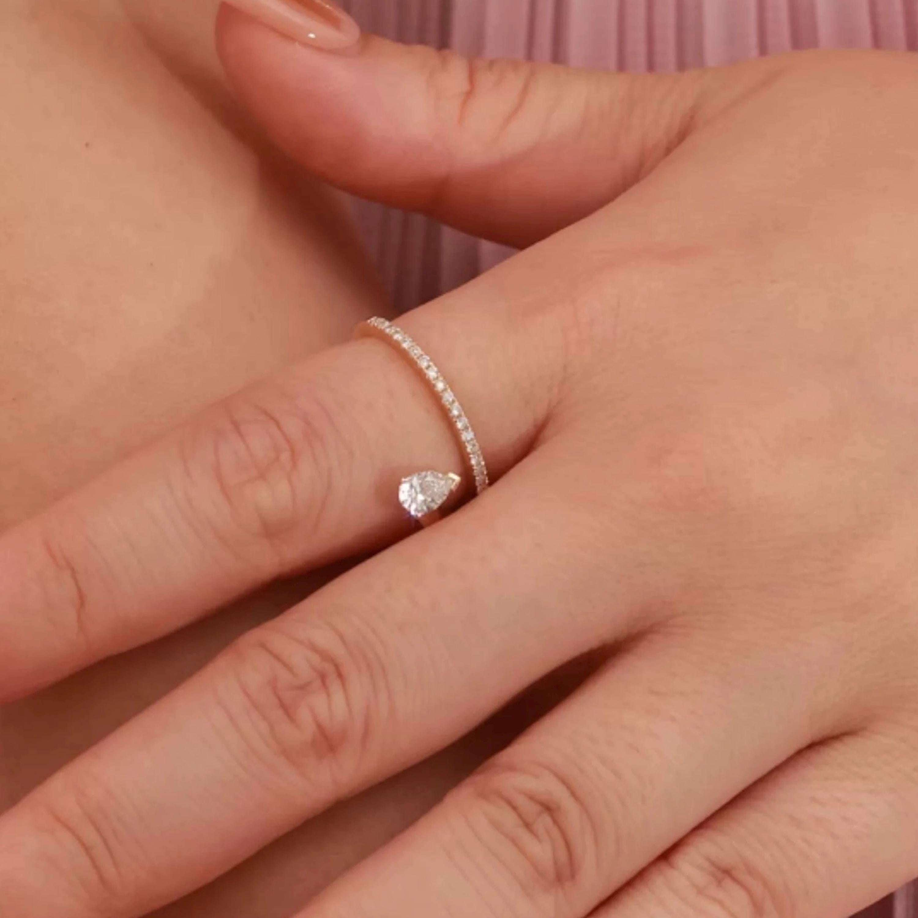 The open band creates a striking silhouette, sculpting the finger with light and softness. A standout for engagement, anniversary, or a personal milestone, this design draws attention while whispering sophistication.