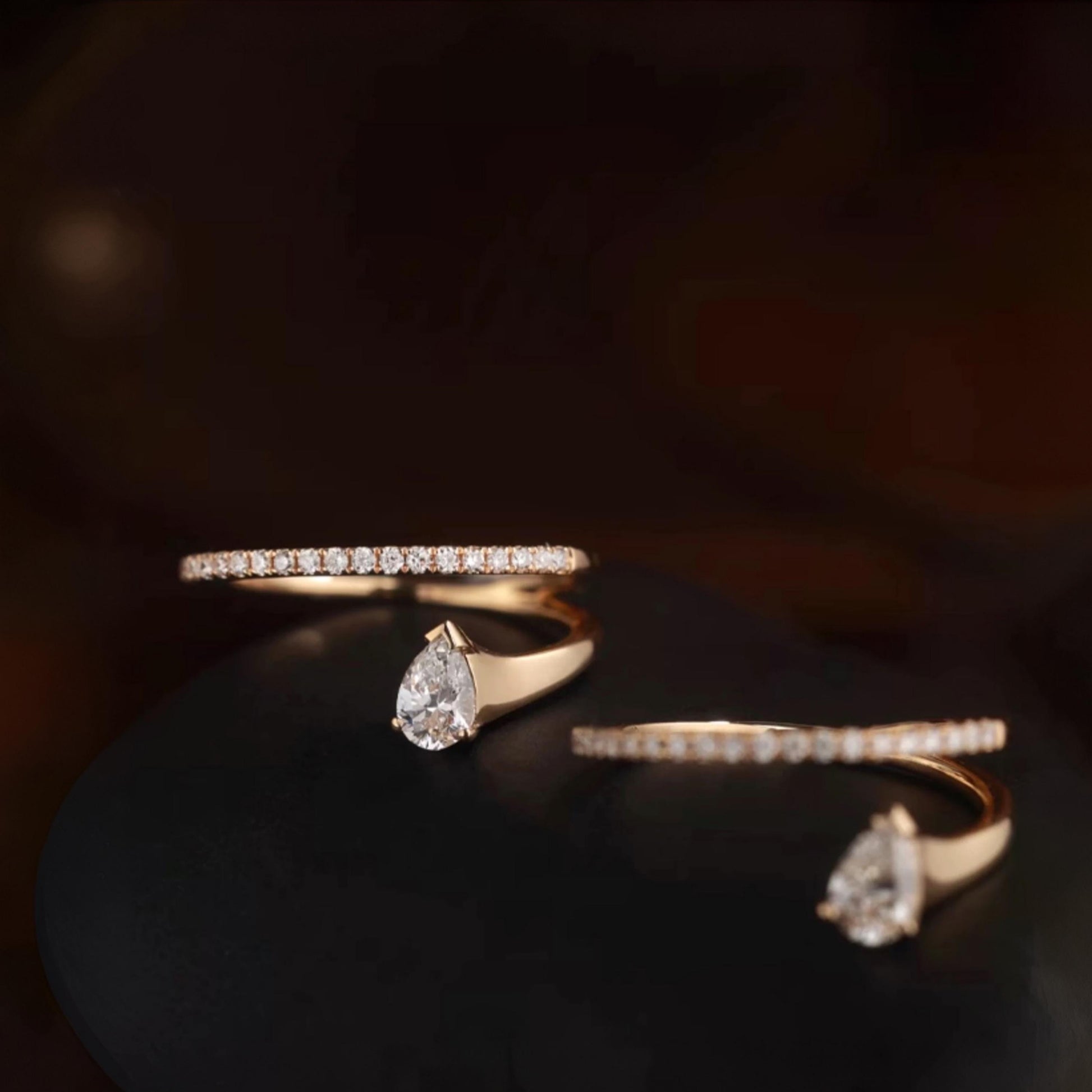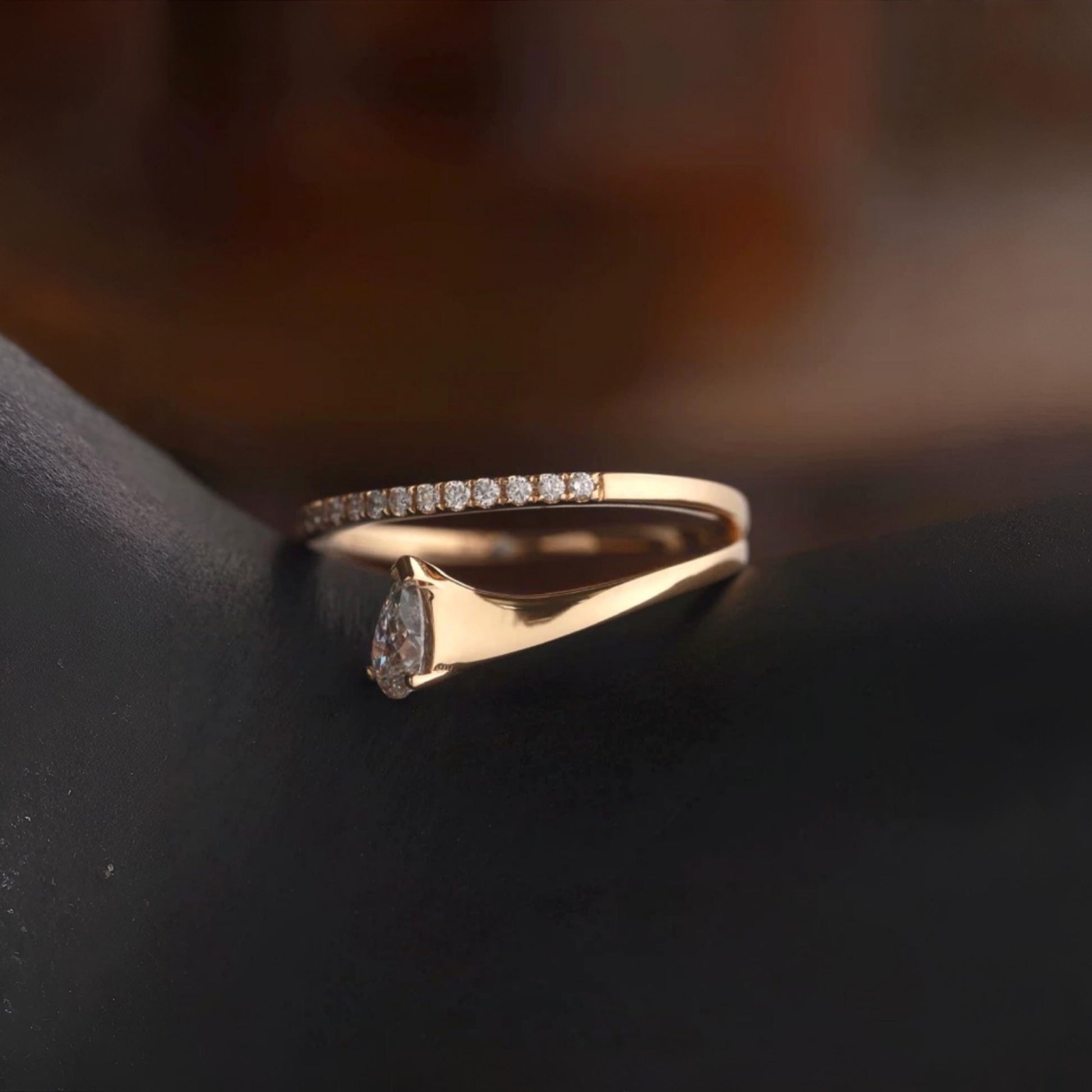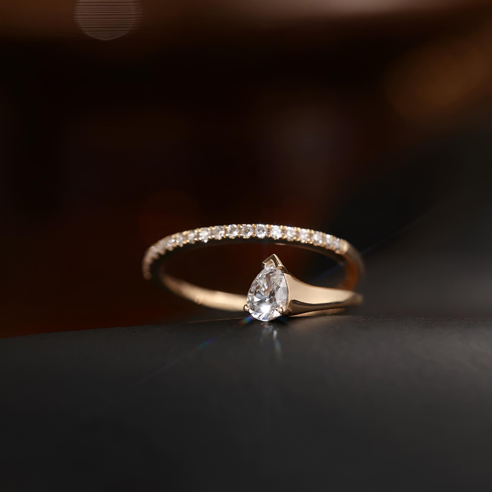 your everyday elegance with this luminous 18K solid gold diamond ring. Featuring a teardrop-shaped center diamond that appears to float between a graceful arc of shimmering stones, this piece captures the essence of quiet luxury—refined, rare, and effortlessly modern.