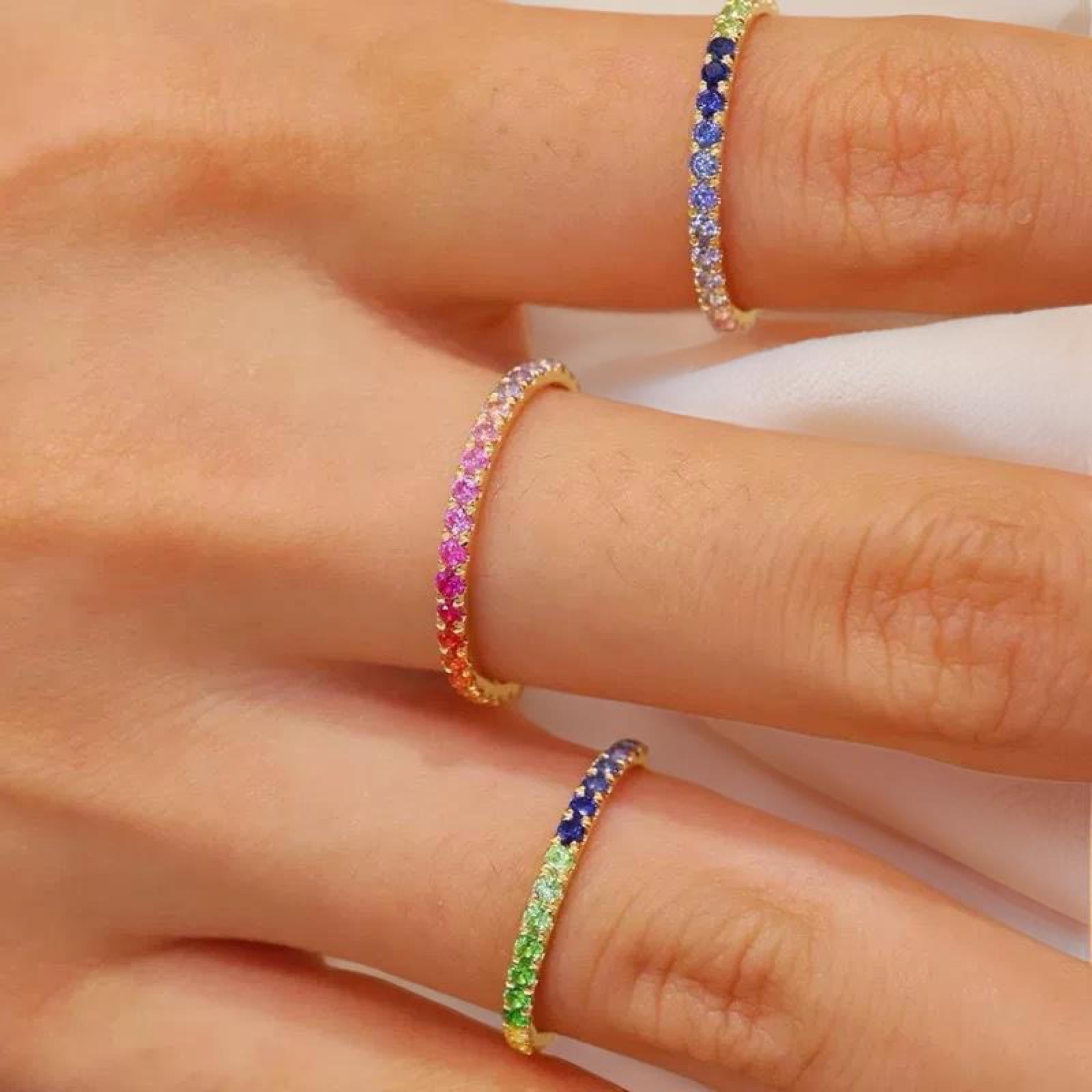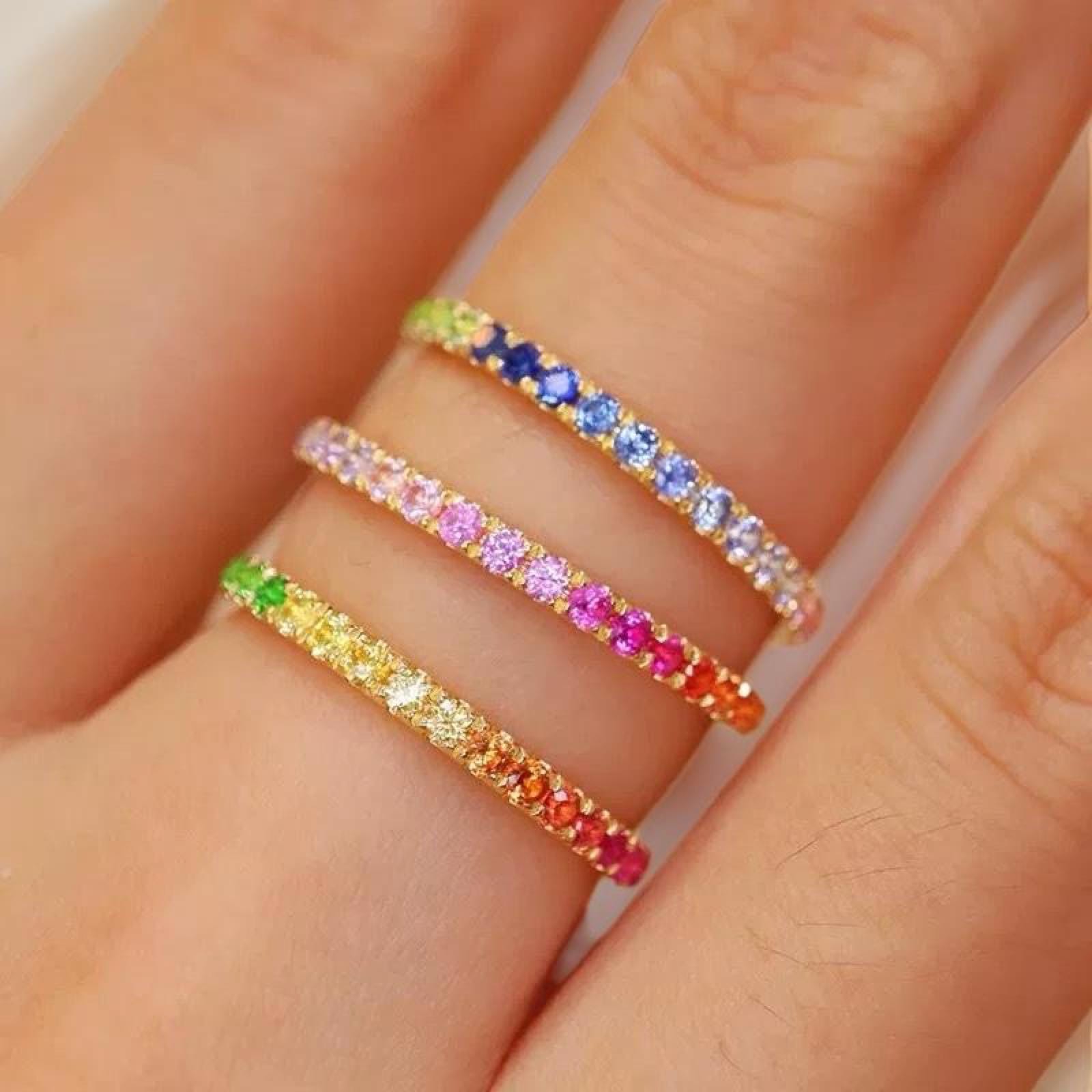 • Design: Full circle band with a vibrant rainbow gradient, featuring hand-matched gemstones for the perfect shine.