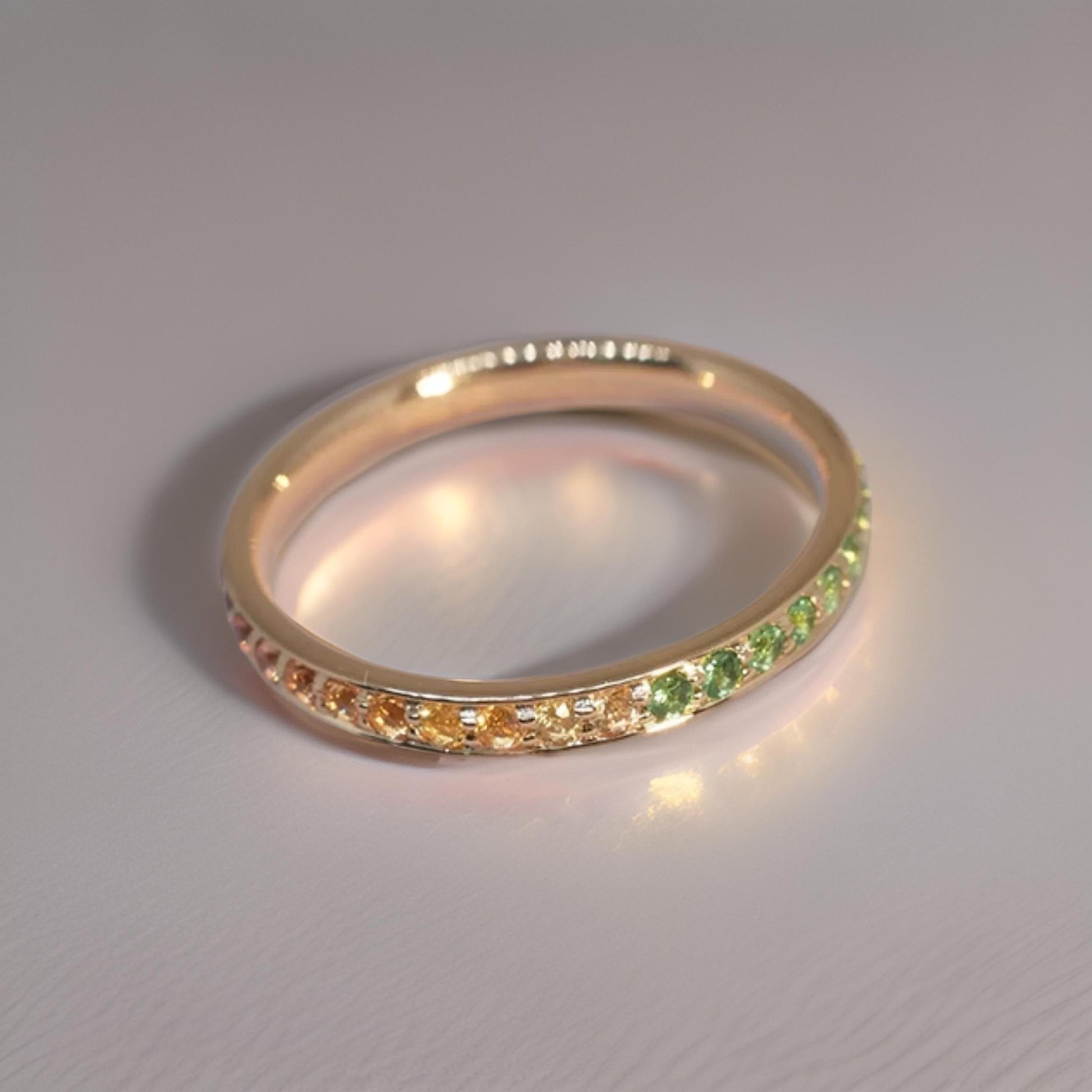 Unlike green sapphires that lack vibrancy, we chose natural tsavorite for the green section to bring out a truly lush, popping green. The craftsmanship and attention to detail ensure a seamless and eye-catching design, making this band perfect for stacking, wearing solo, or as a meaningful promise ring.