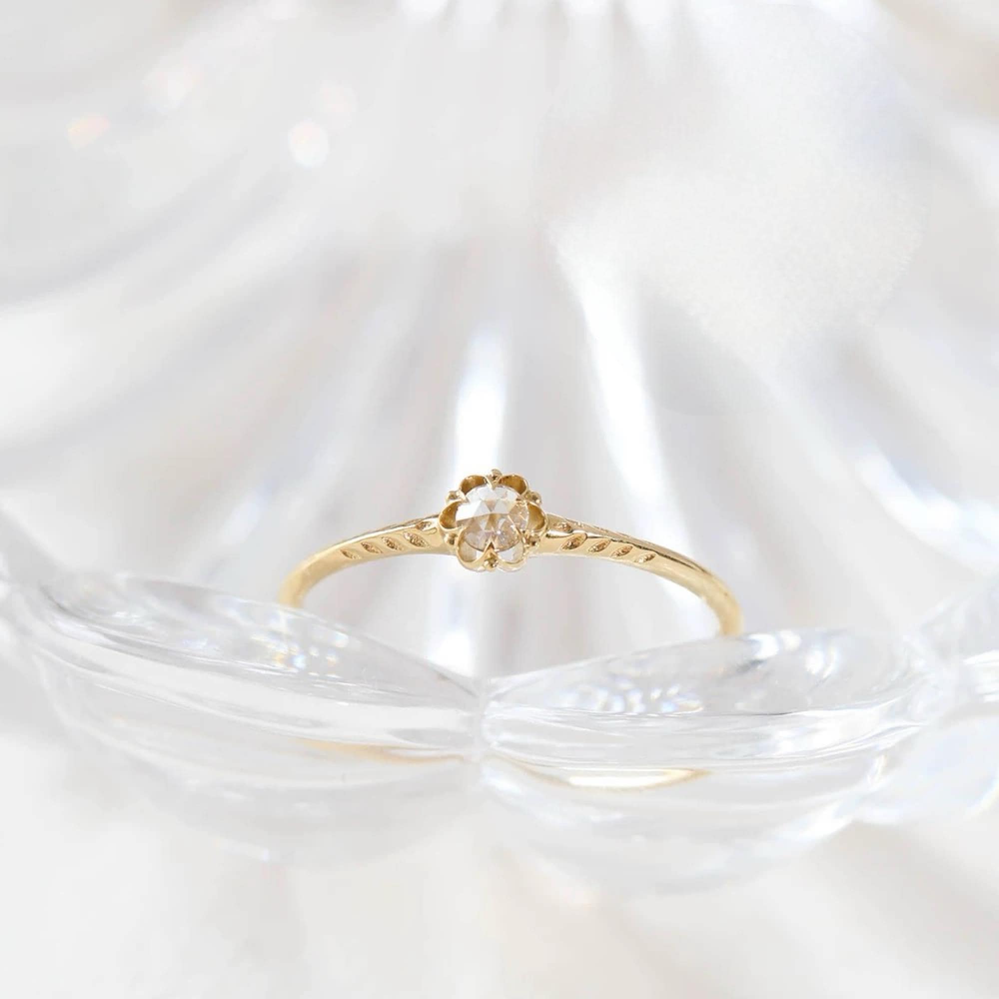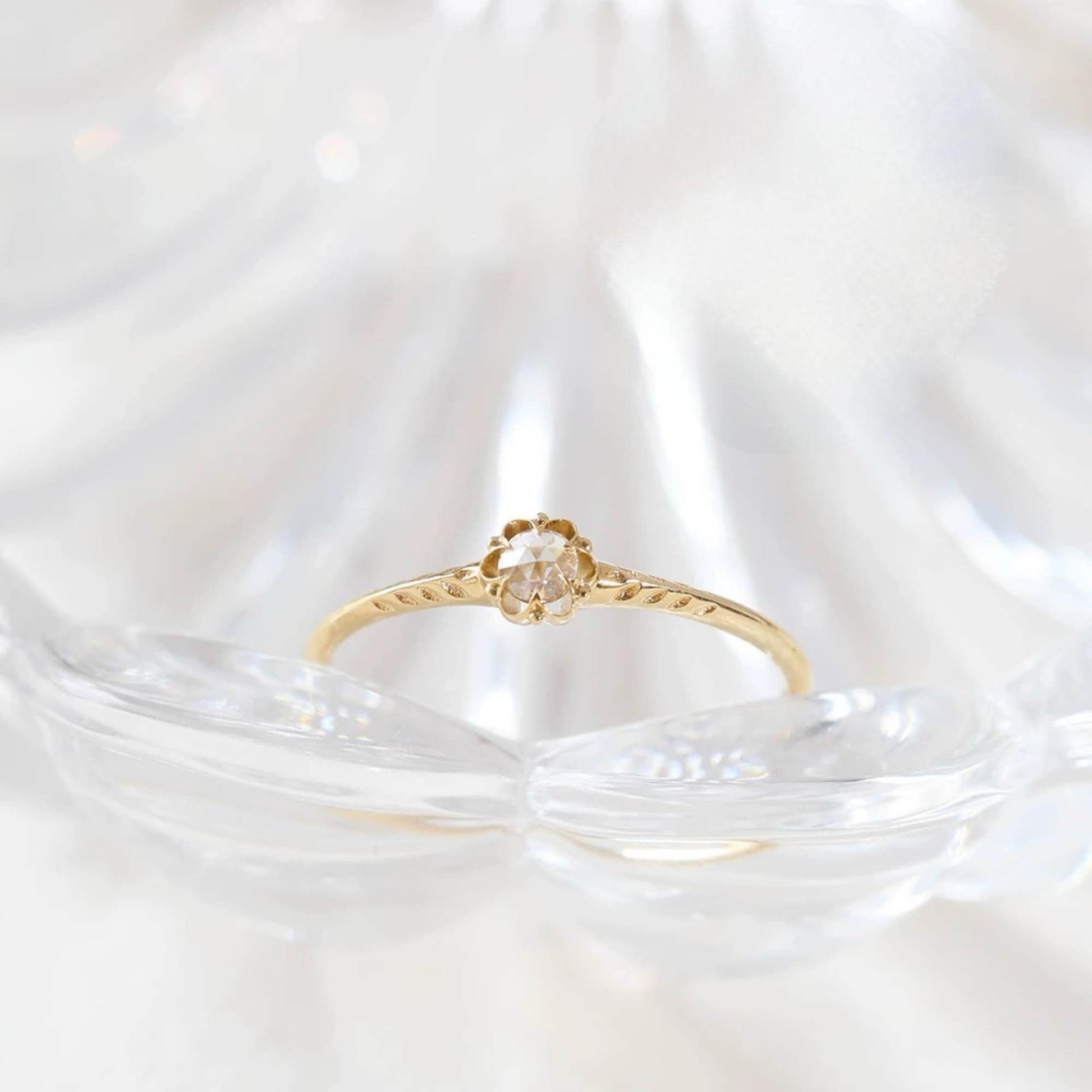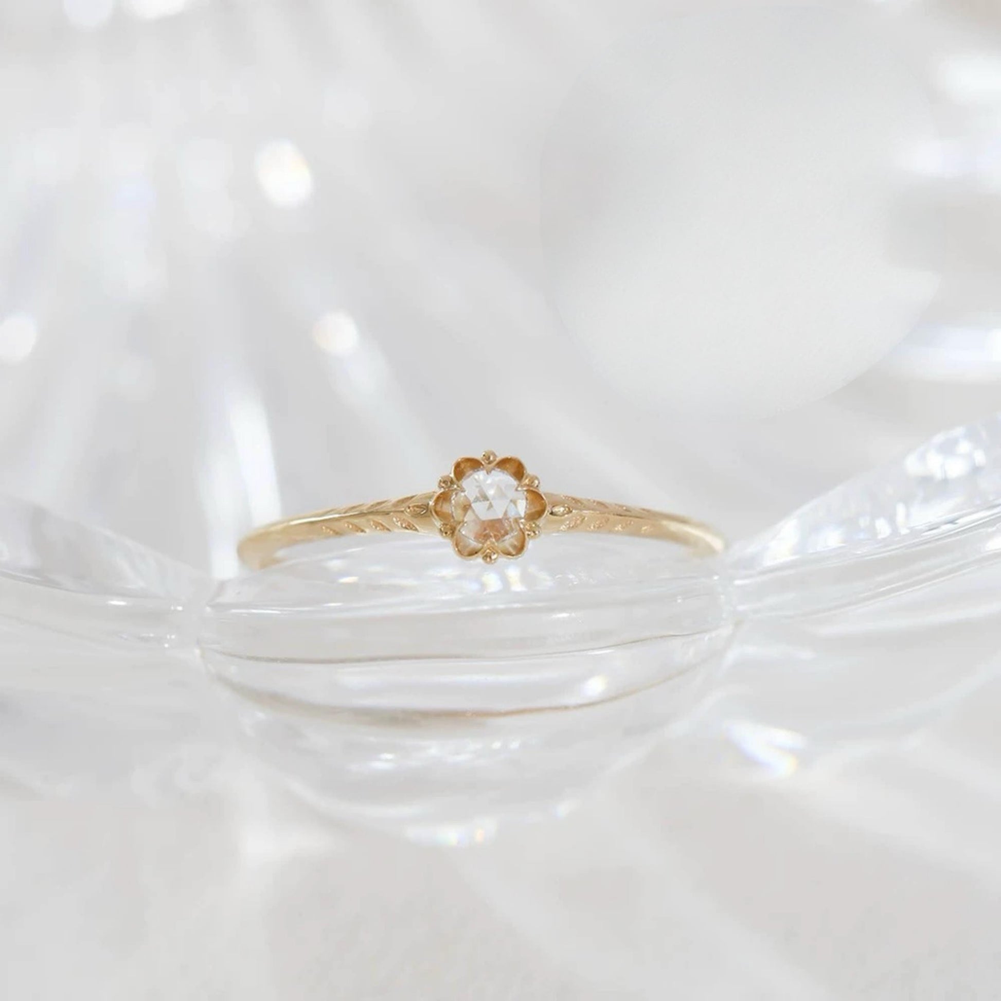 The diamond is cradled in a flower-shaped setting, inspired by a dried rose blossom. Each petal is hand-sculpted to embrace the stone gently, while the shank is etched with slender rose leaves, creating a band that wraps around your finger like a vine from a bygone era.