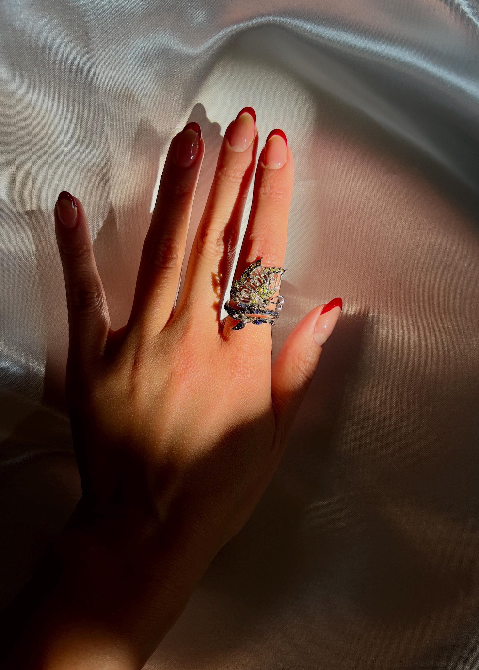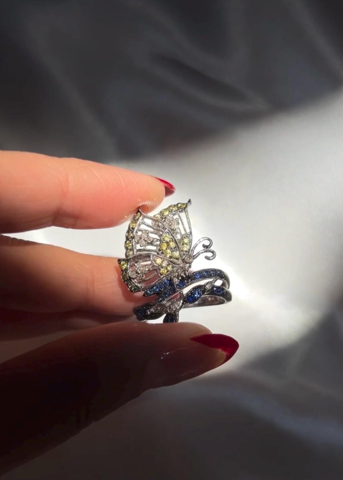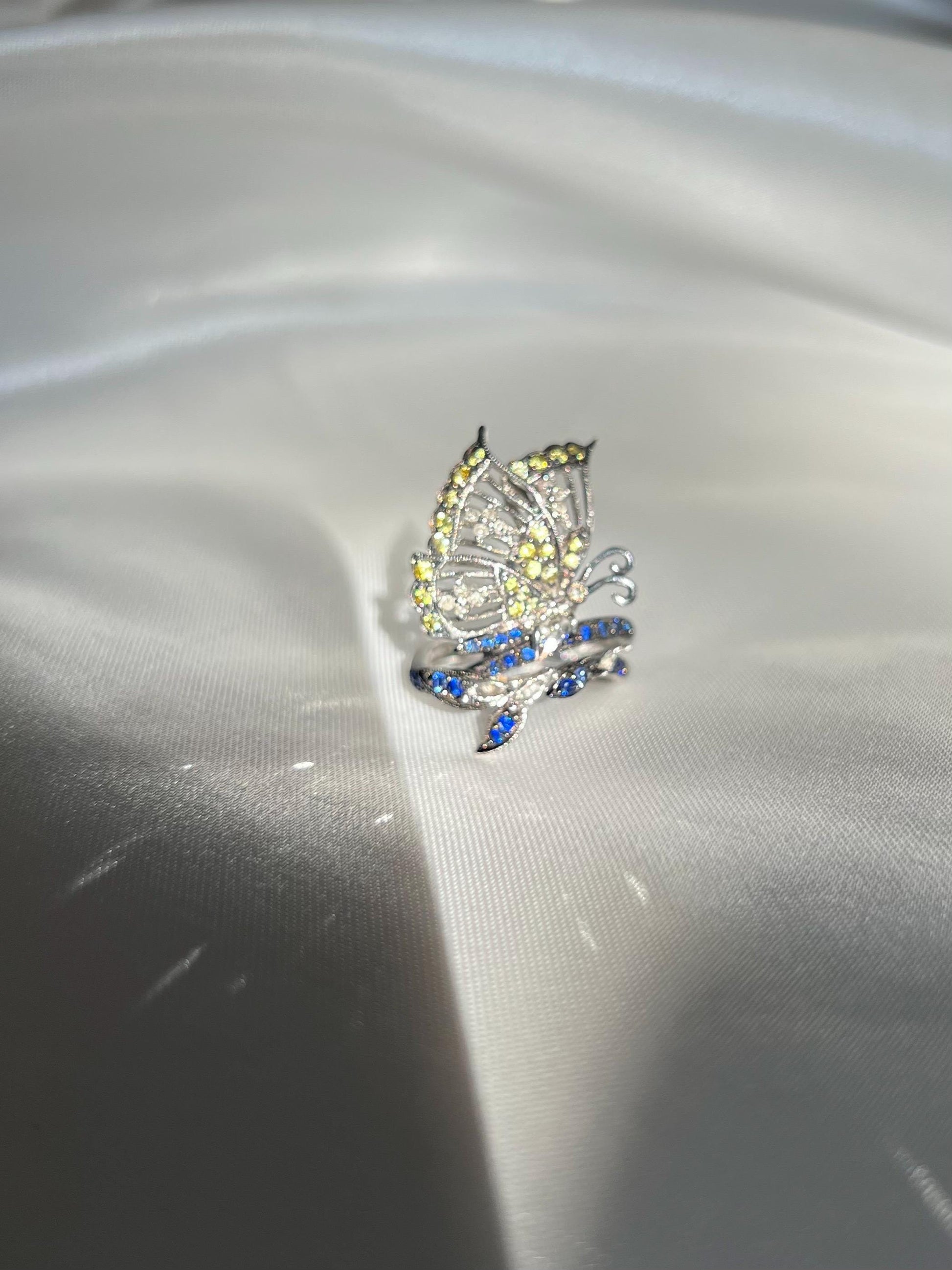 18k Solid White Gold Diamond Sapphire Butterfly Ring