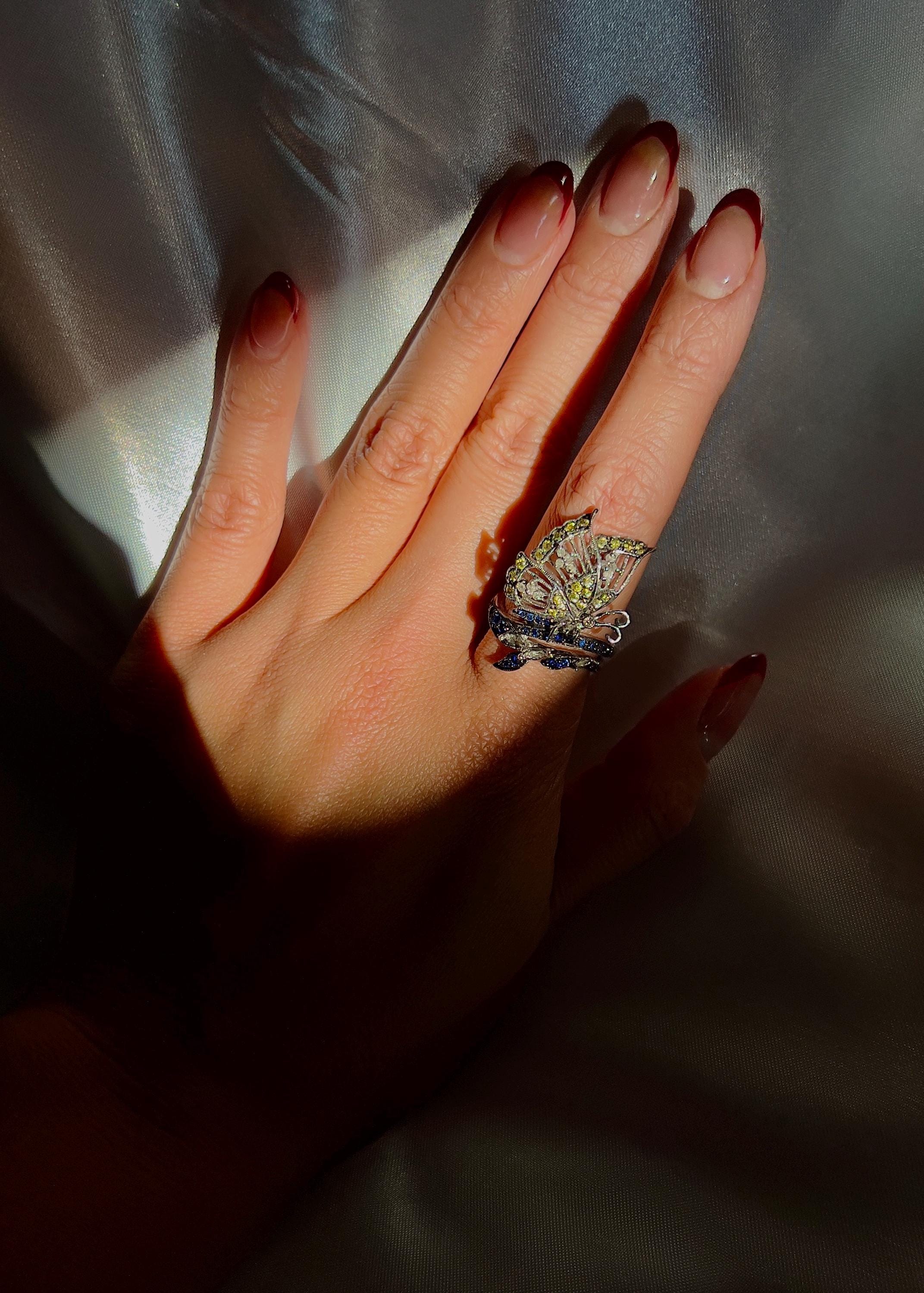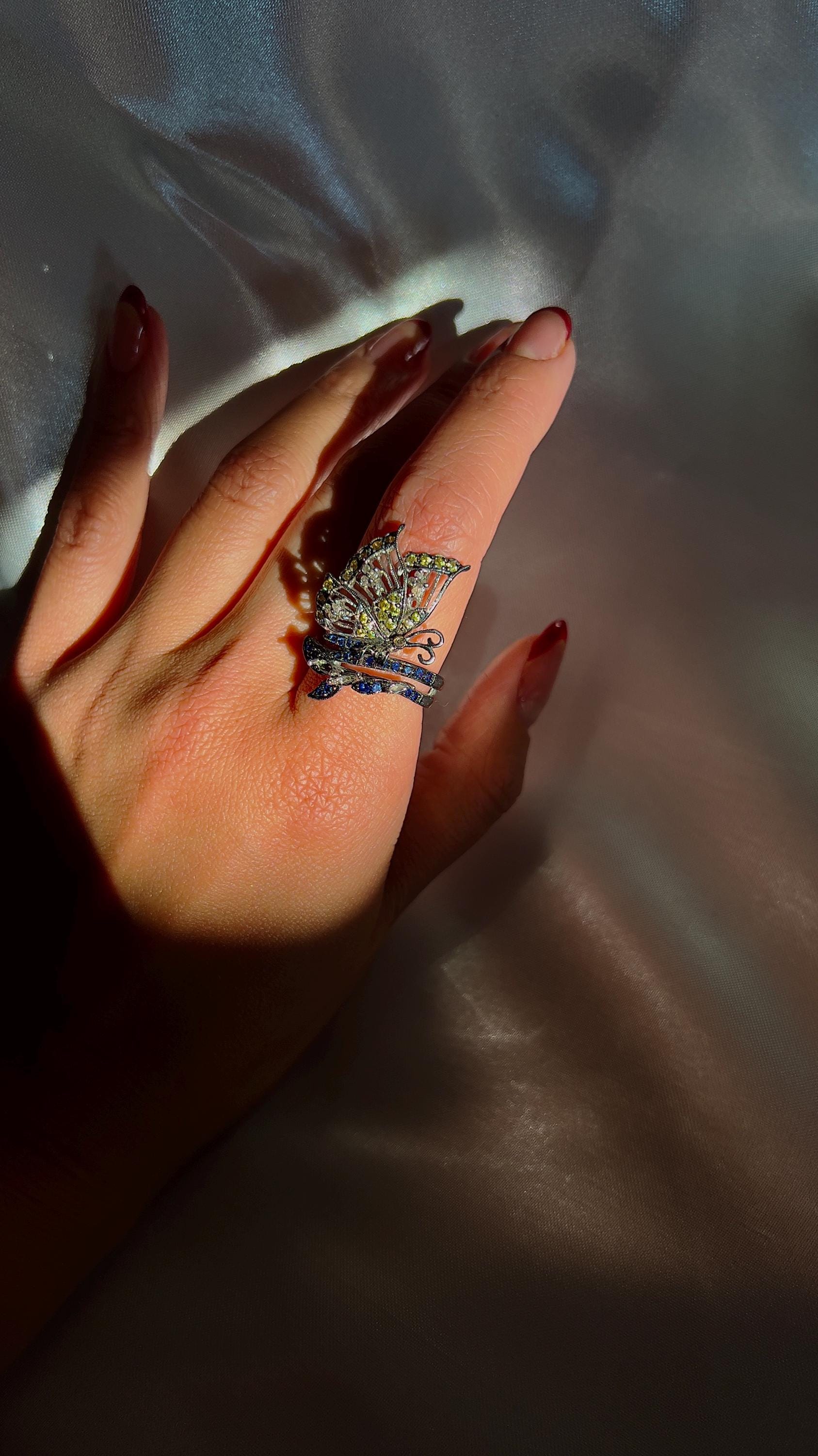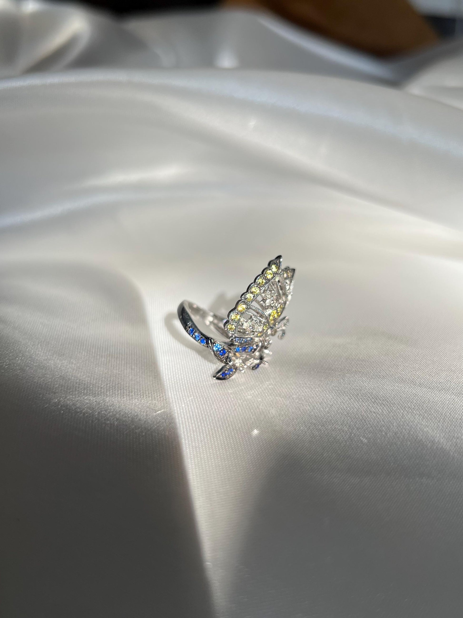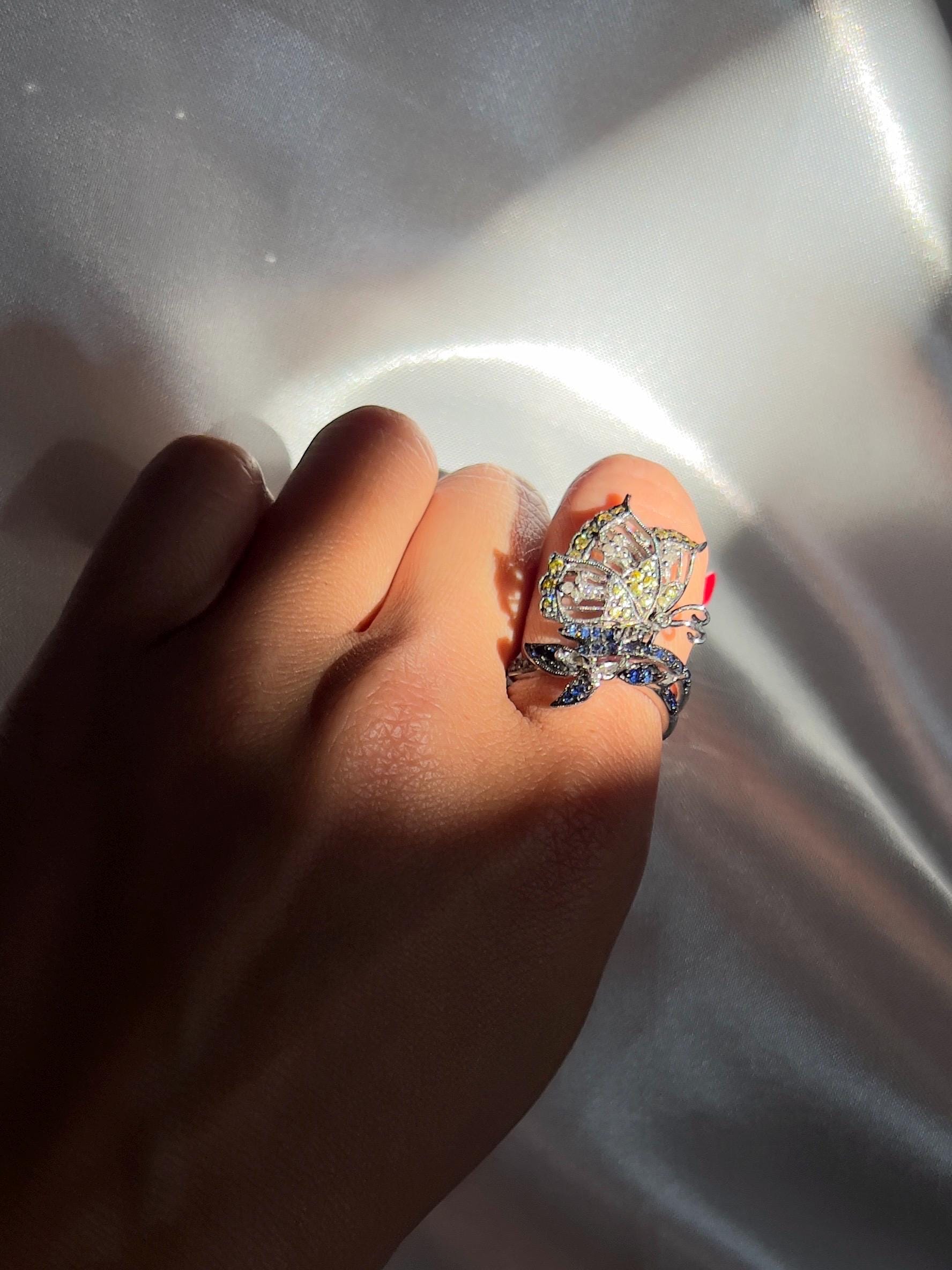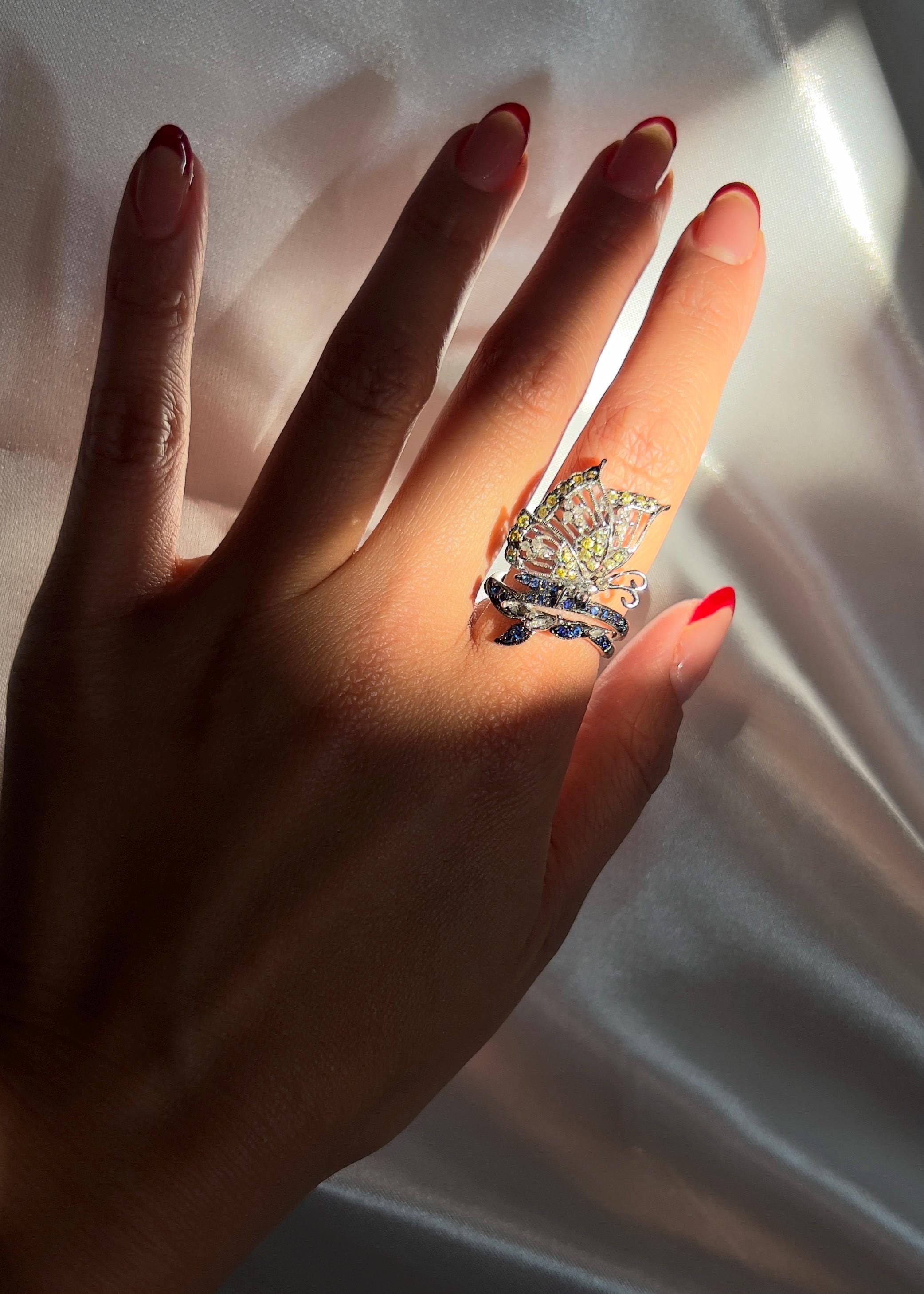 Delicately crafted from 18k solid white gold, this exquisite butterfly ring showcases the natural beauty of Sri Lankan sapphires. The butterfly's wings are adorned with vibrant yellow sapphires, while its body is encrusted with deep blue sapphires, creating a stunning contrast that captures the essence of this elegant creature.