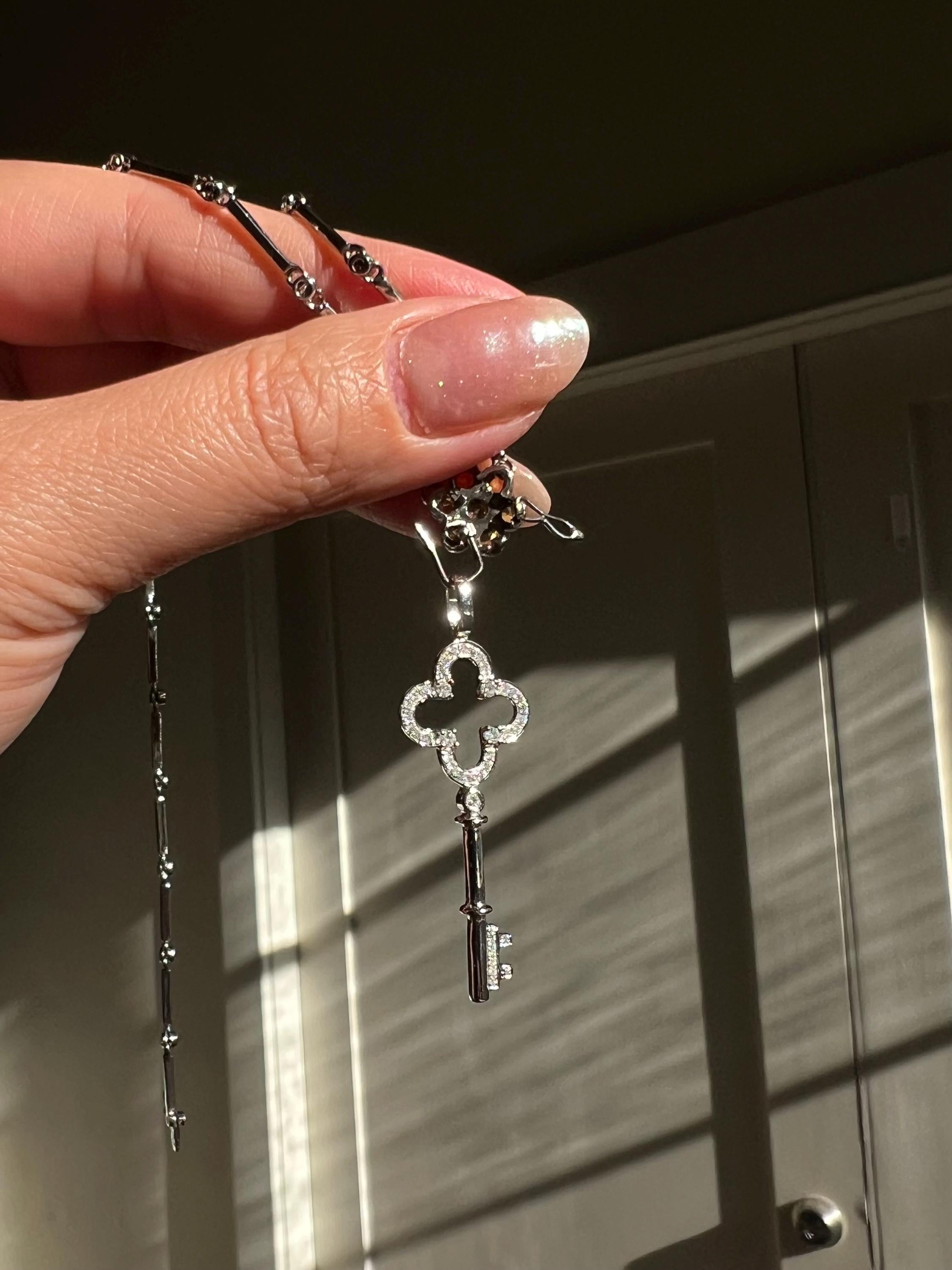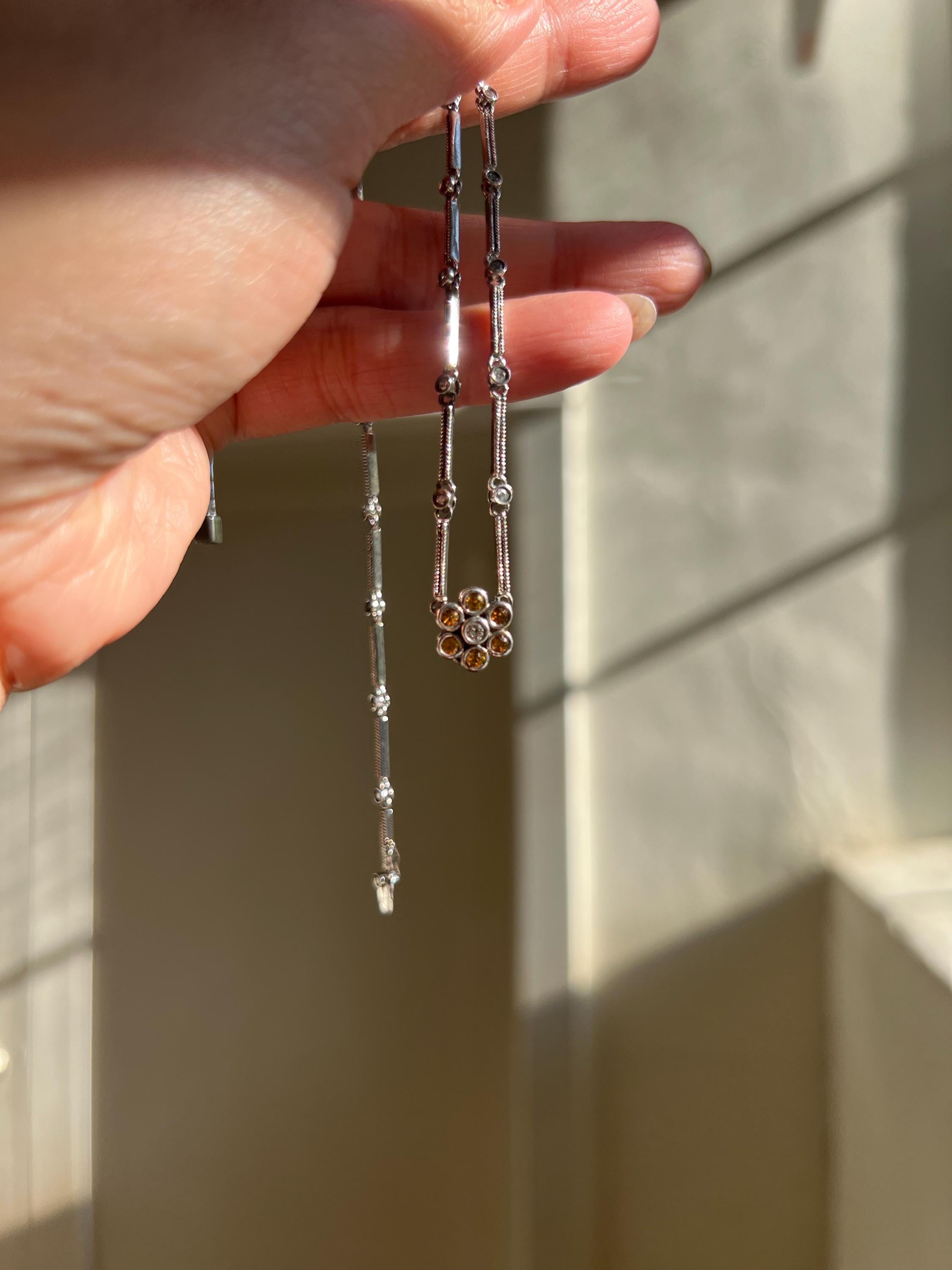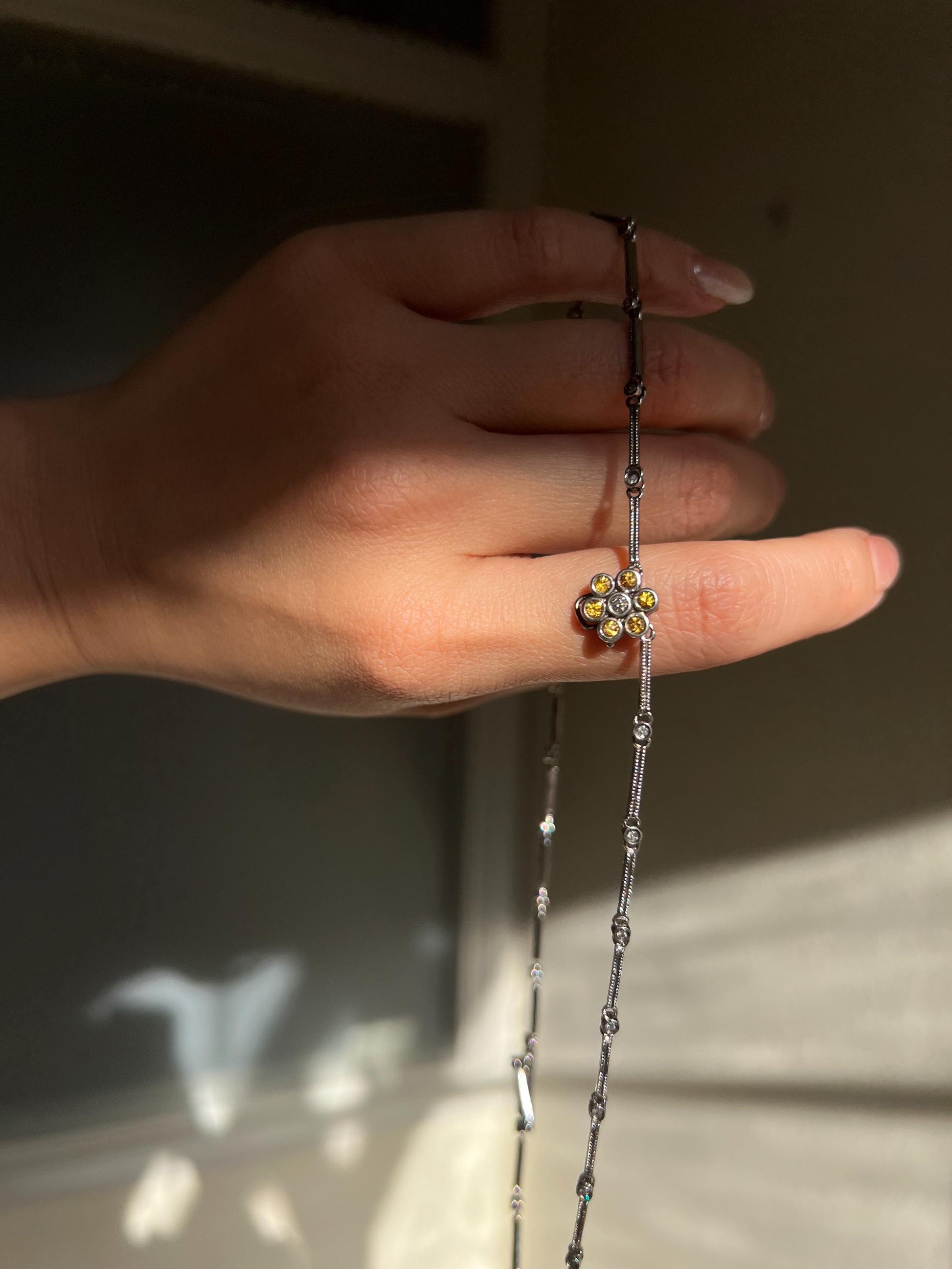 Handcrafted in solid 18K white gold, the chain is lined with natural bezel-set diamonds that shimmer with every movement, leading to a joyful yellow-sapphire flower centered by a brilliant diamond.