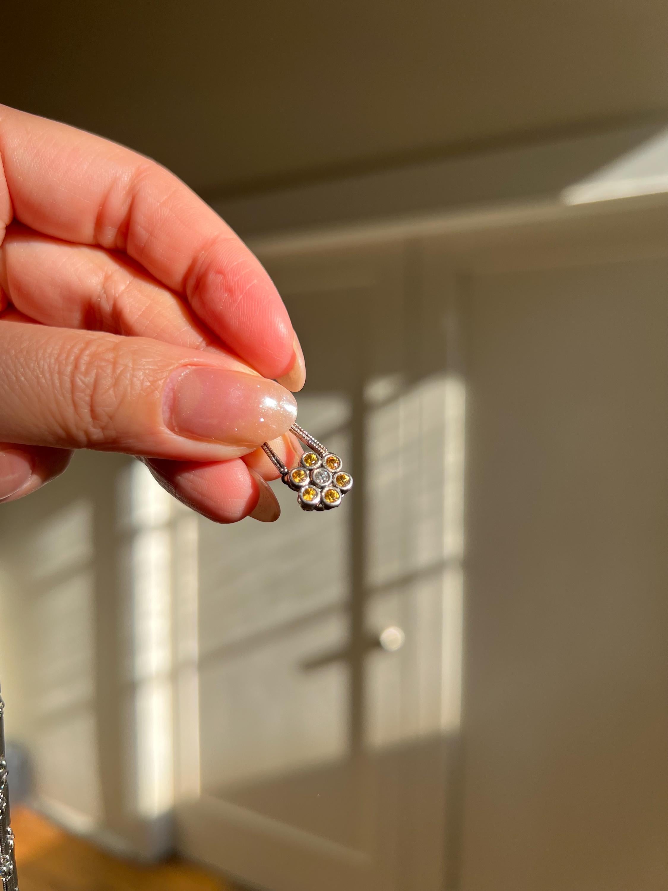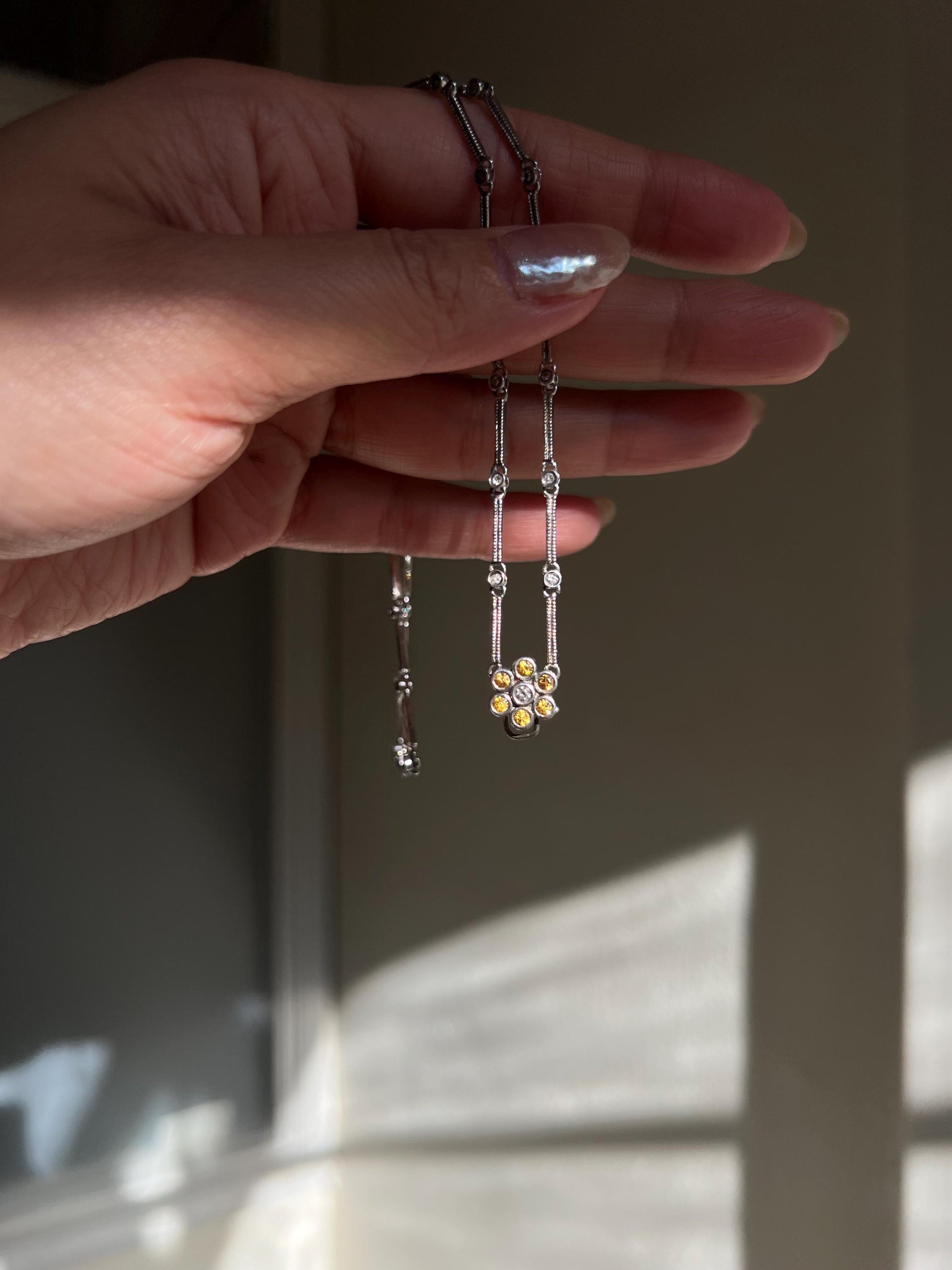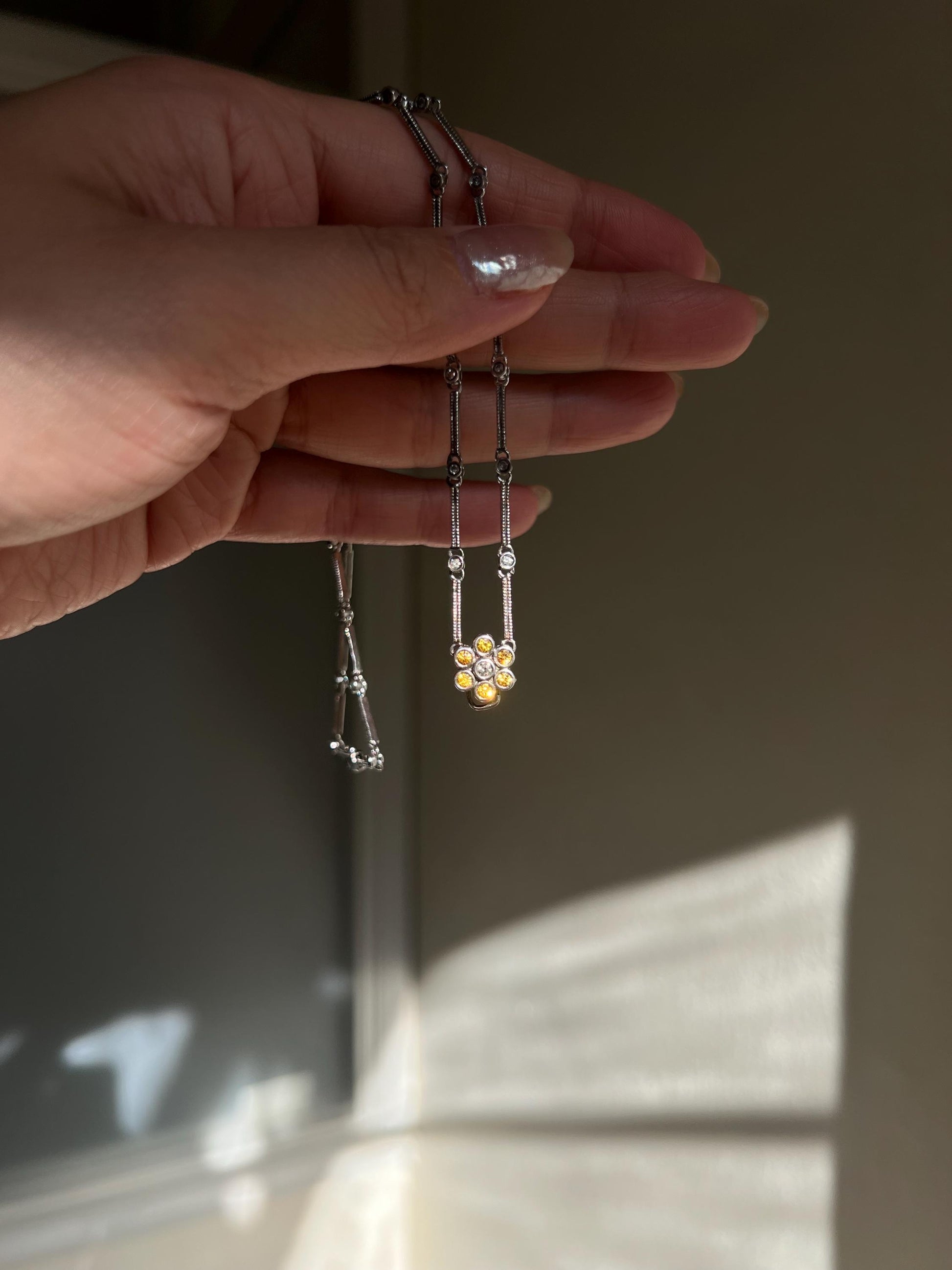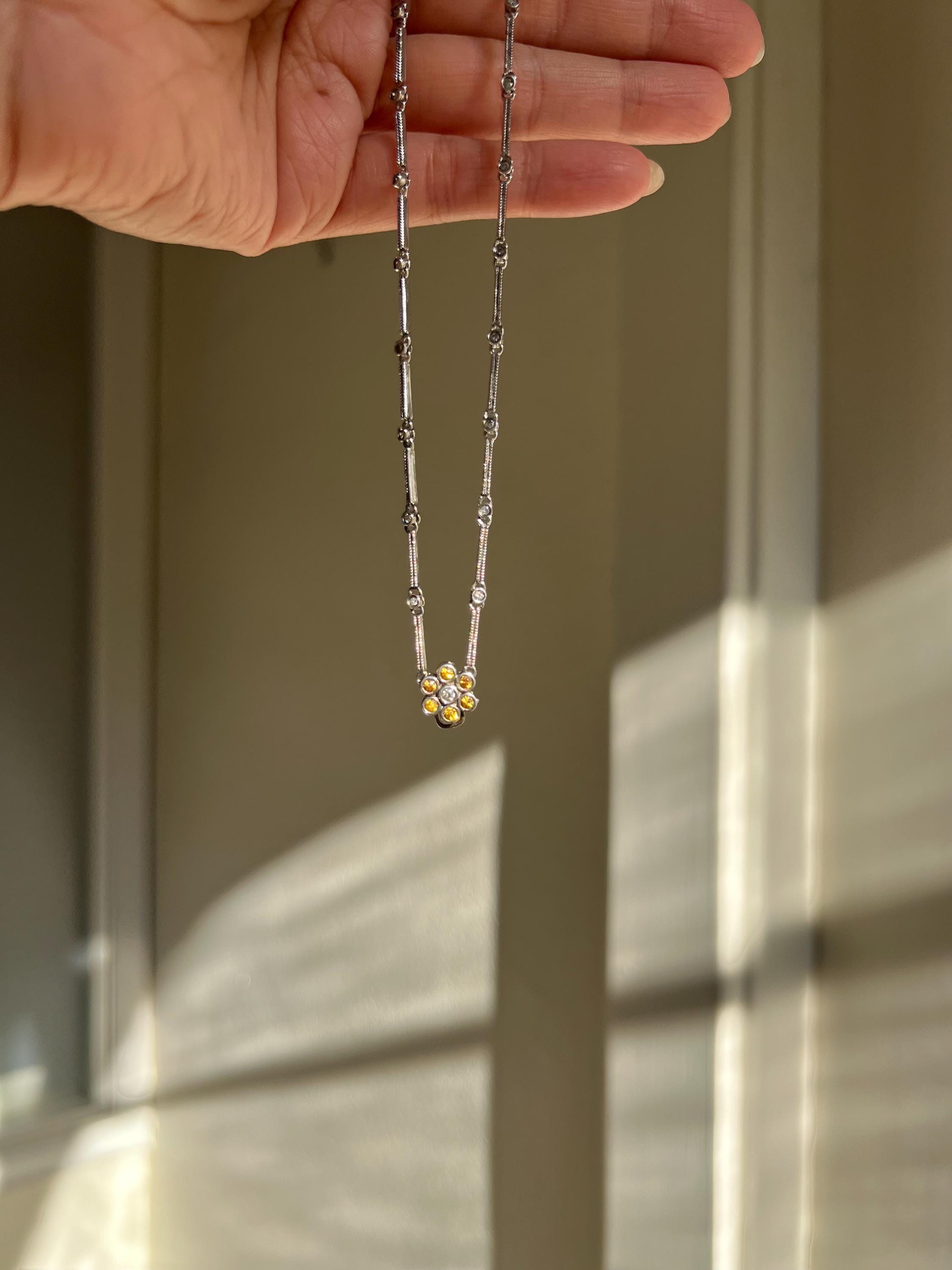 18K Solid White Gold Earth Mined Natural Diamond & Yellow Sapphire Flower Necklace | One-of-a-Kind Vintage | Fine Jewelry Gift for Her