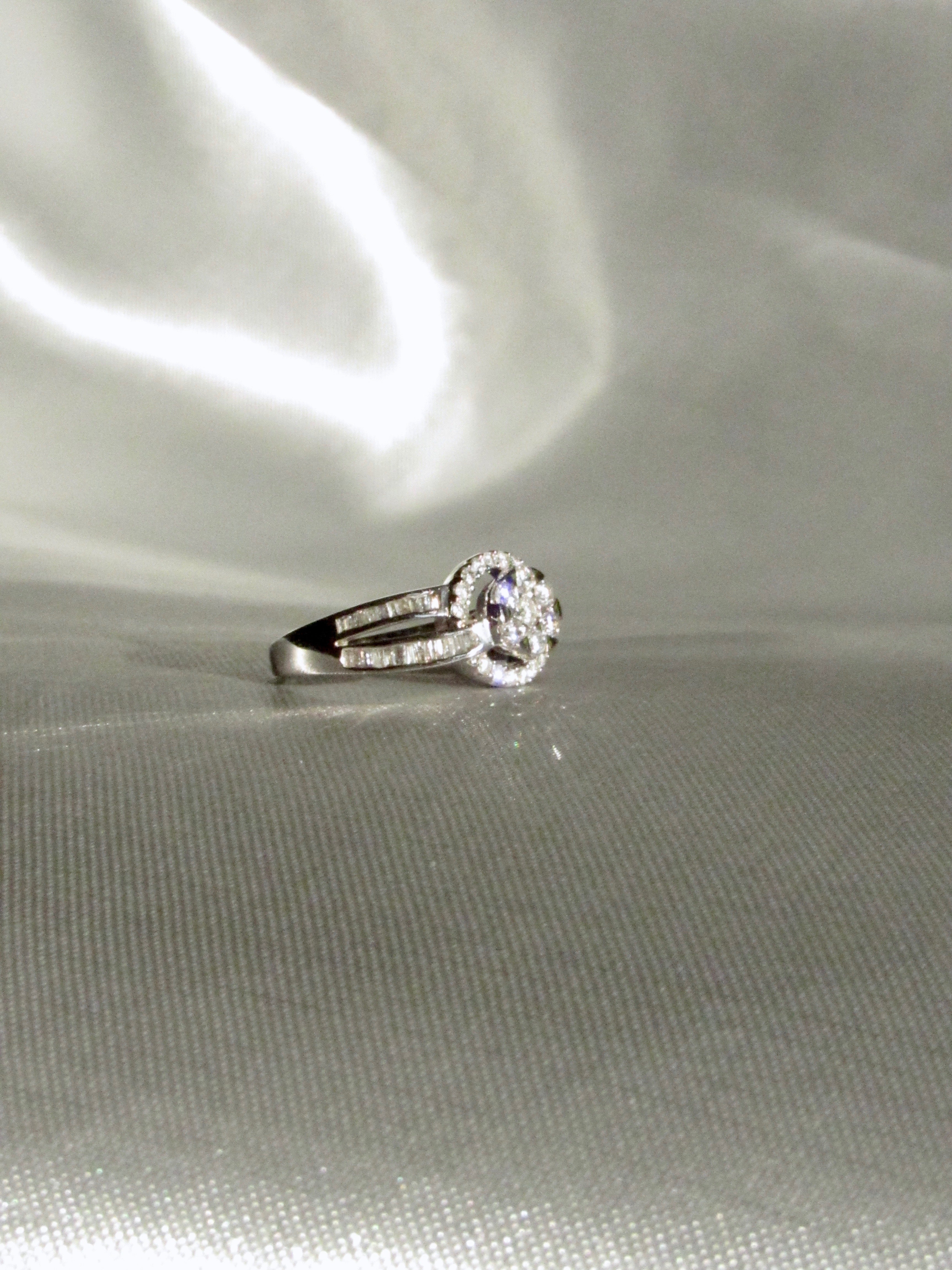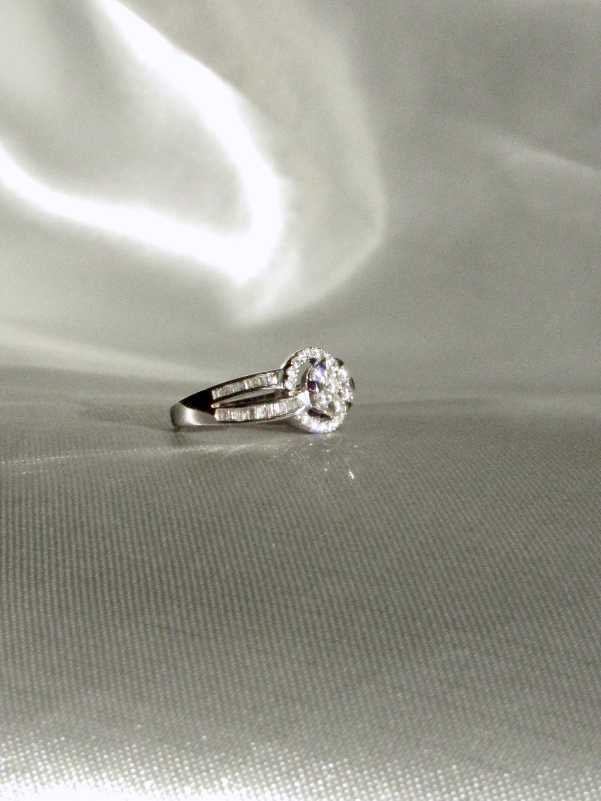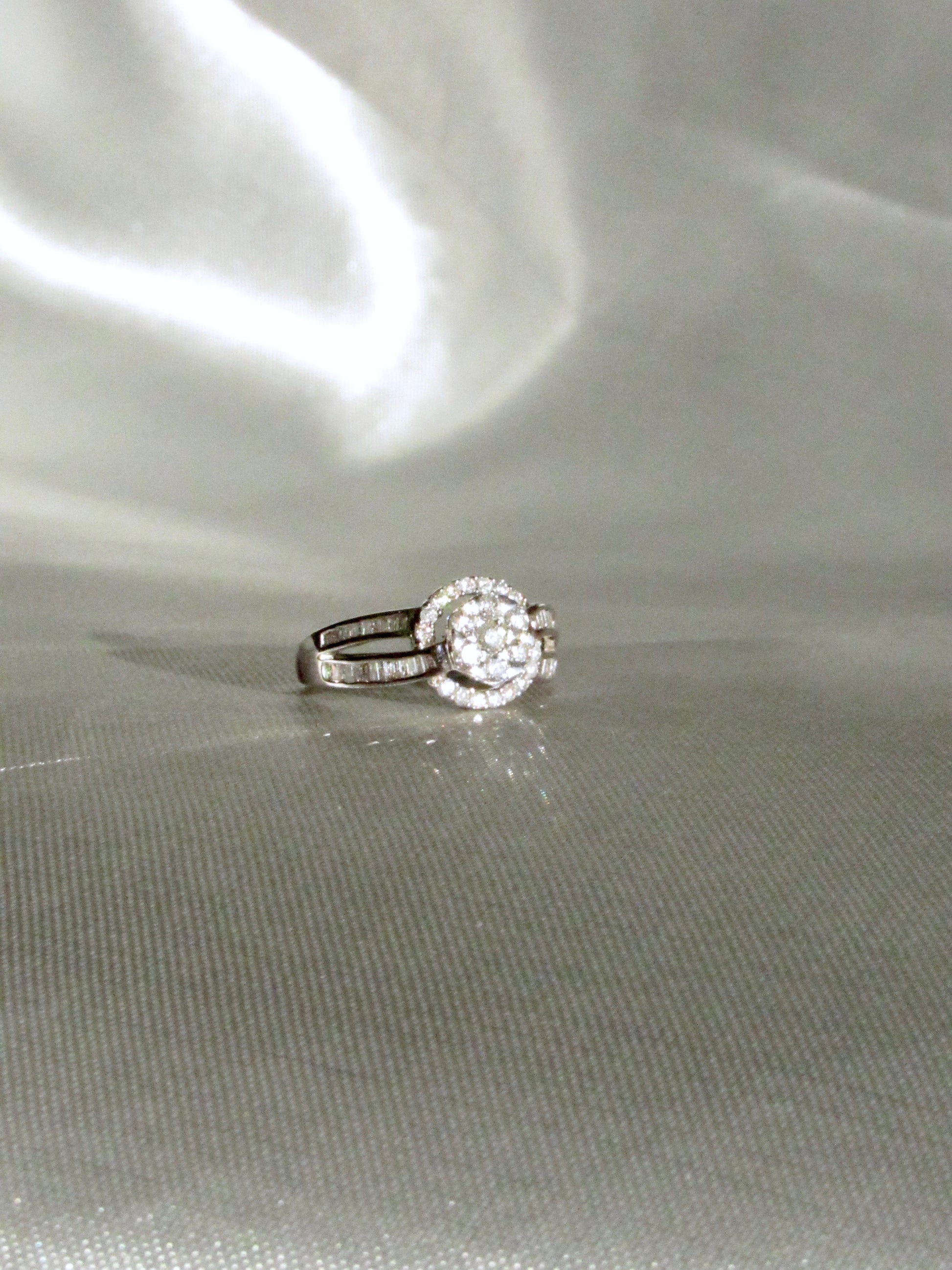18K White Gold Natural Baguette & Round Diamond Flower Cluster Ring