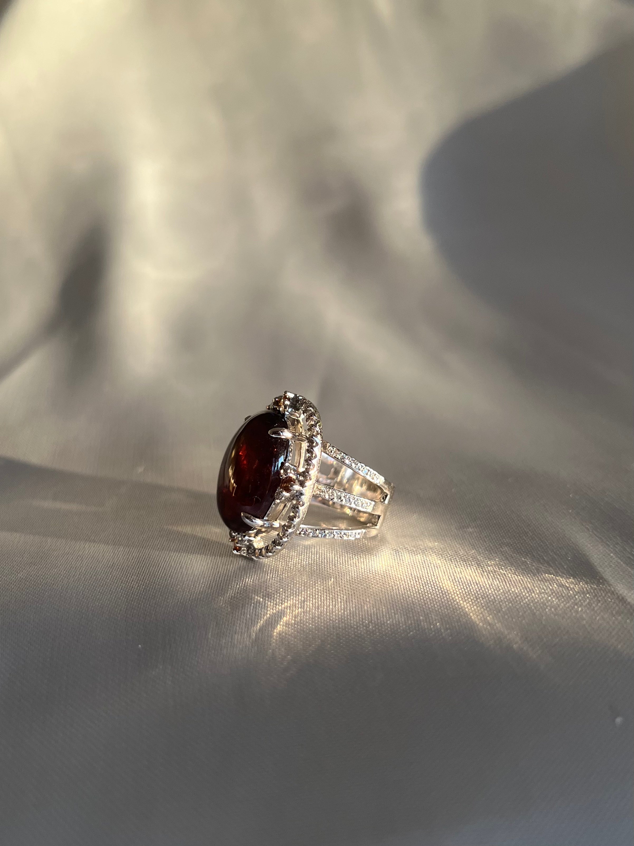 Stunning cocktail ring featuring a rich purplish-red 20.5-carat rubellite tourmaline cabochon from Brazil. We sourced the gem and crafted the ring with our family jeweler in Taipei, Taiwan, 15 years ago. This gorgeous and magnificent one-of-a-kind cocktail ring is a valuable addition to your collection.