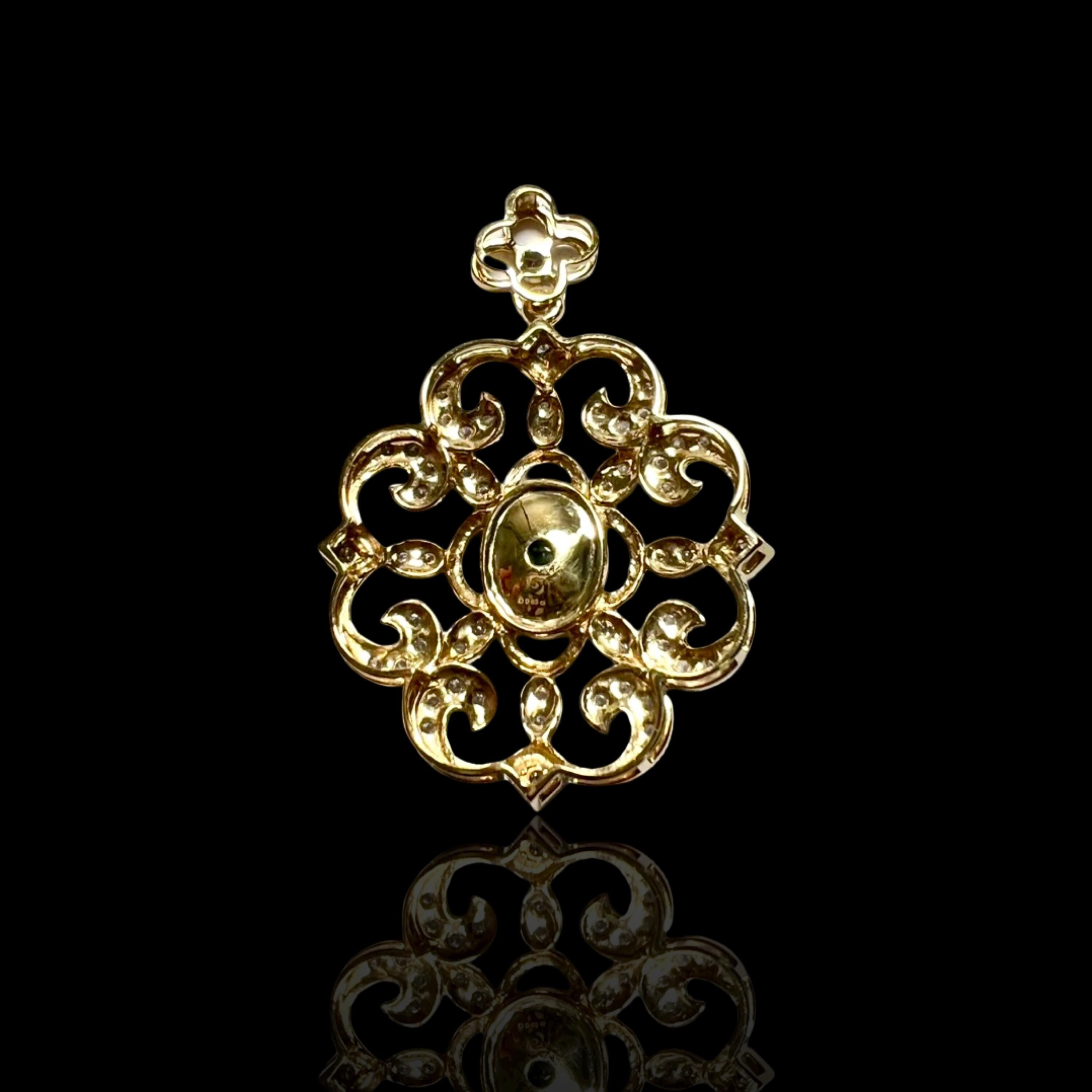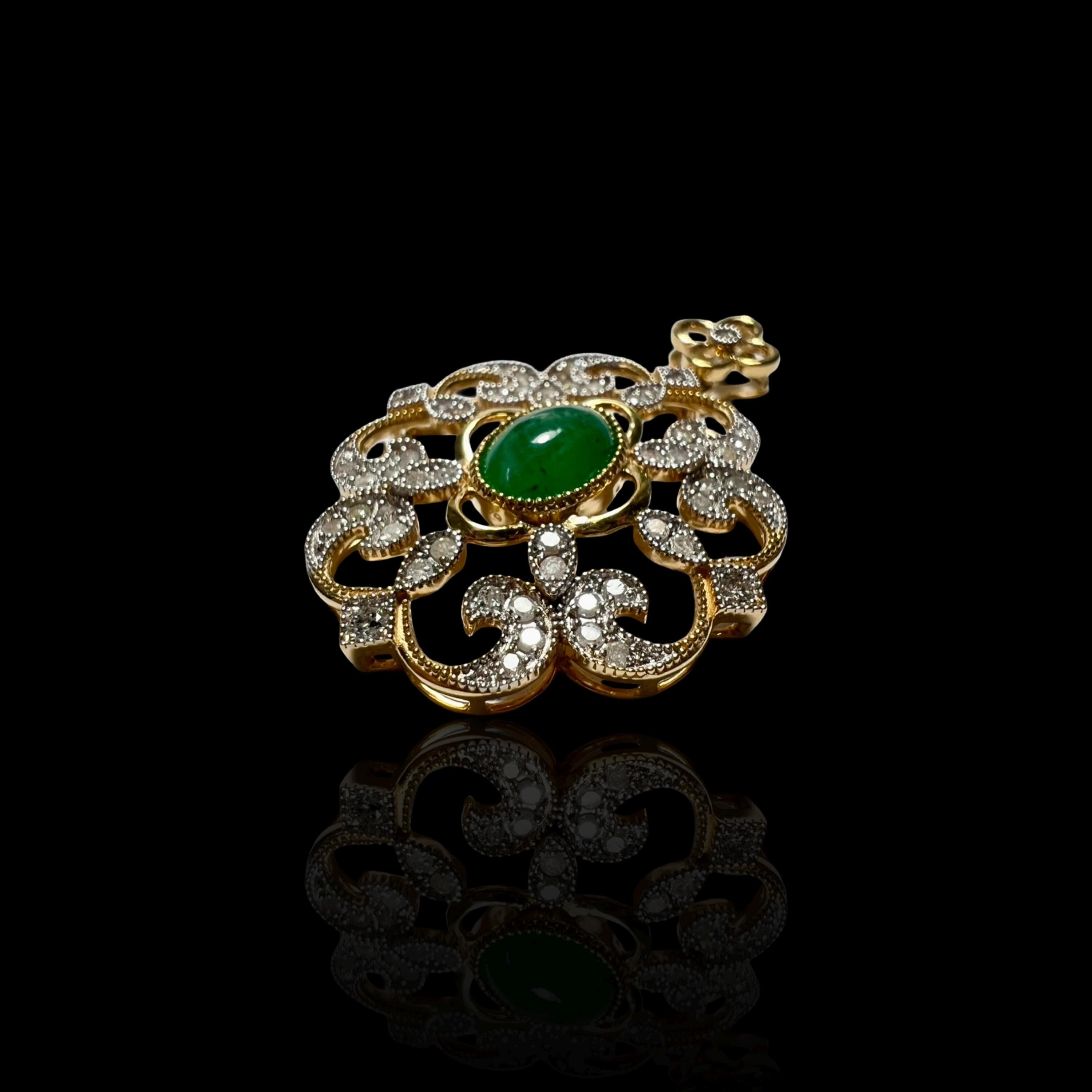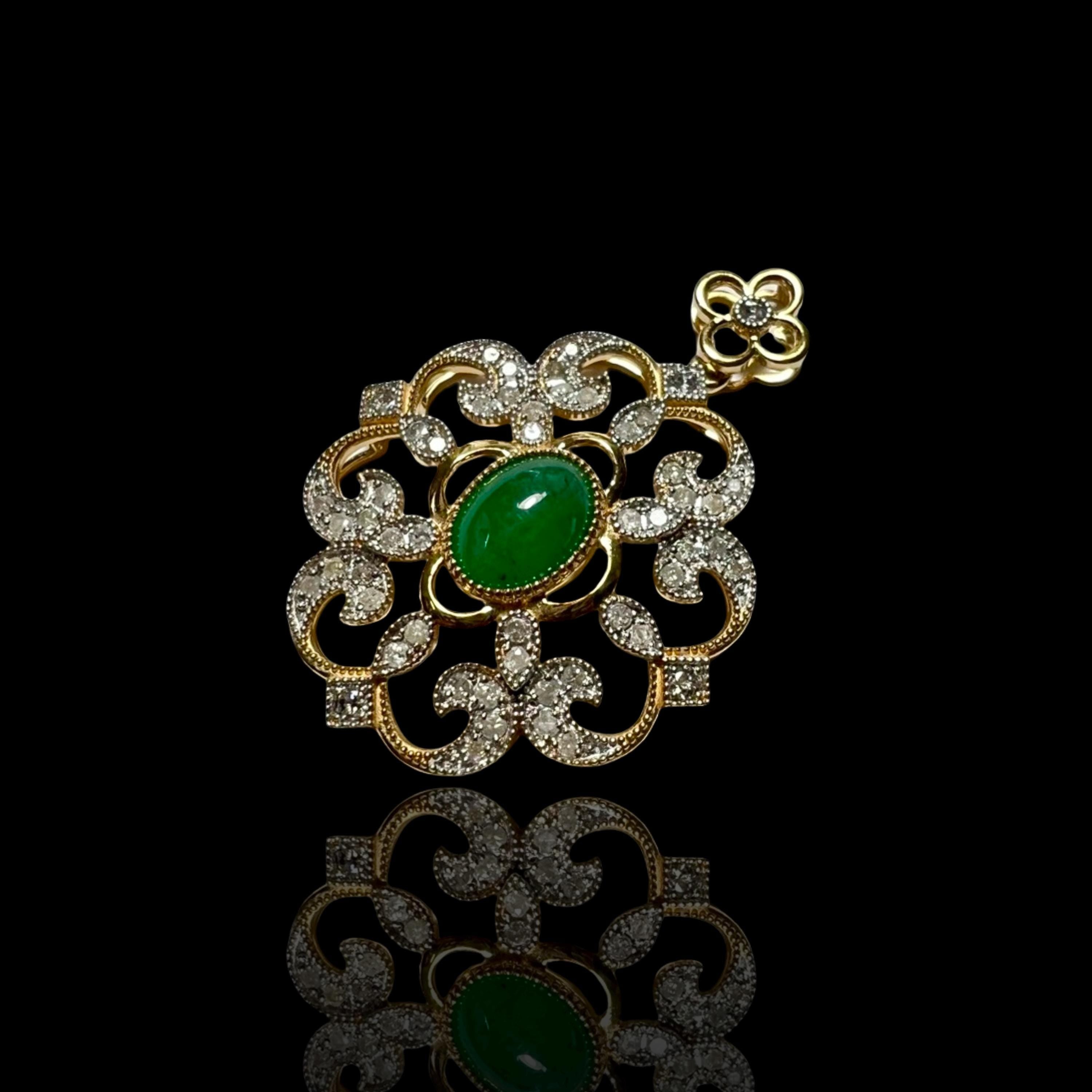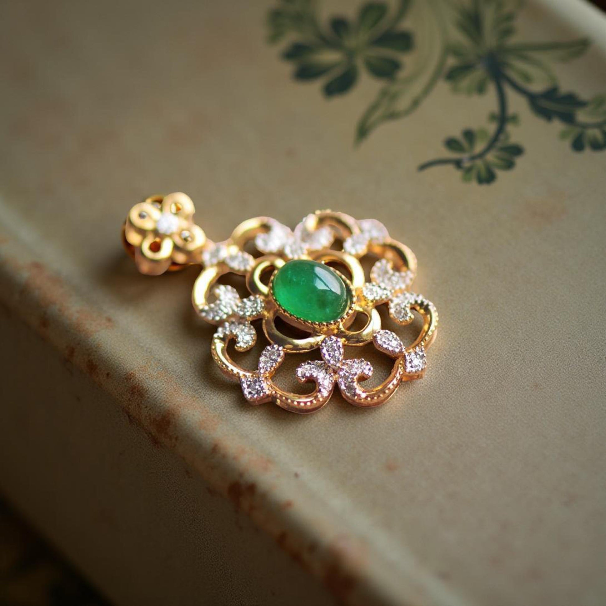 This one-of-a-kind pendant brings together the richness of 22K solid gold, the natural beauty of Muzo green emerald, and the delicate shimmer of natural diamonds, all hand-set in a filigree design. we name this pendant “Verdant Rocaille” – evoking Rococo-era scrollwork and the lush green center, just like an beautiful garden.
