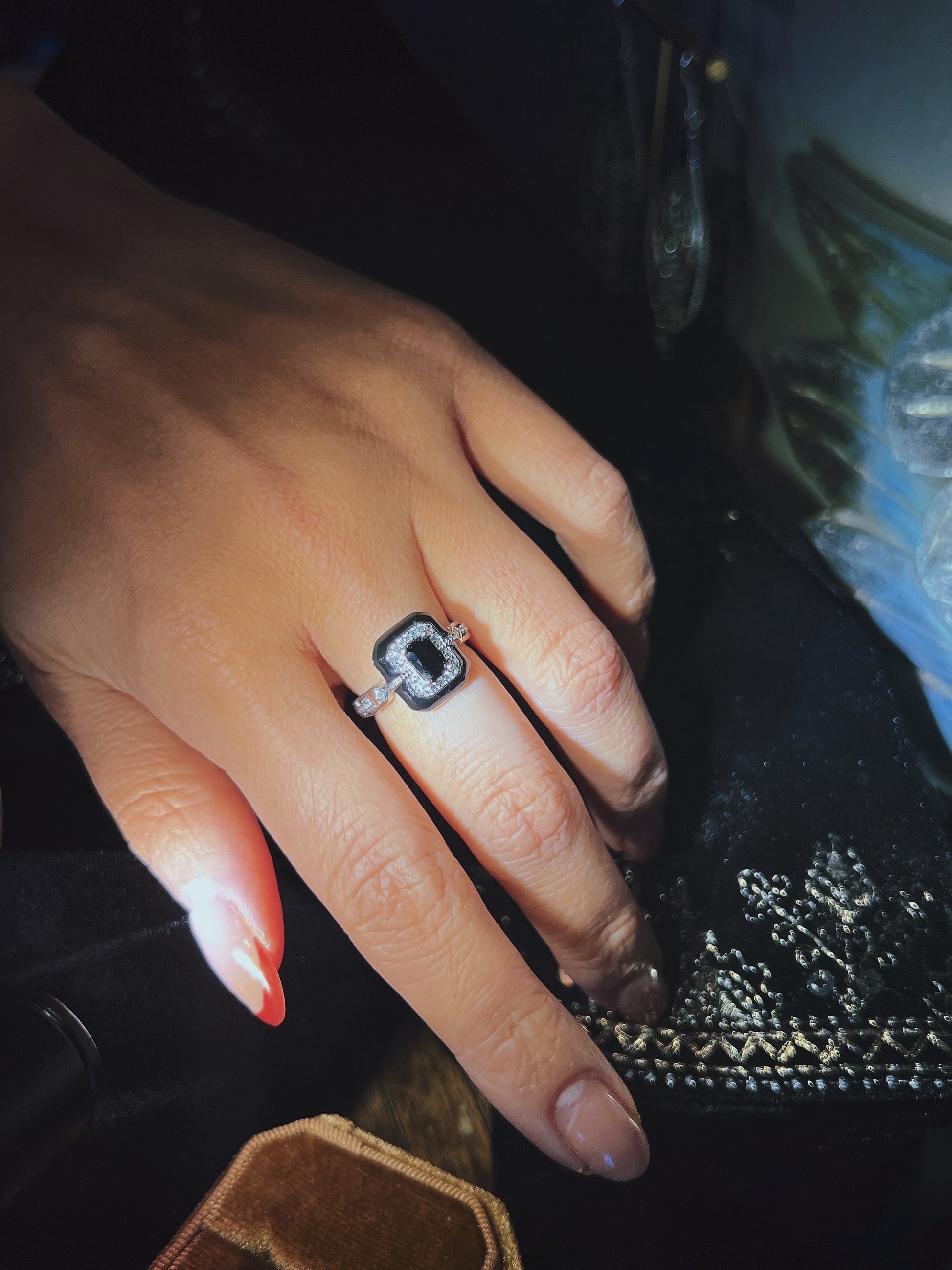 - Materials: 18k white gold vermeil, natural black spinel, white sapphires, black enamel