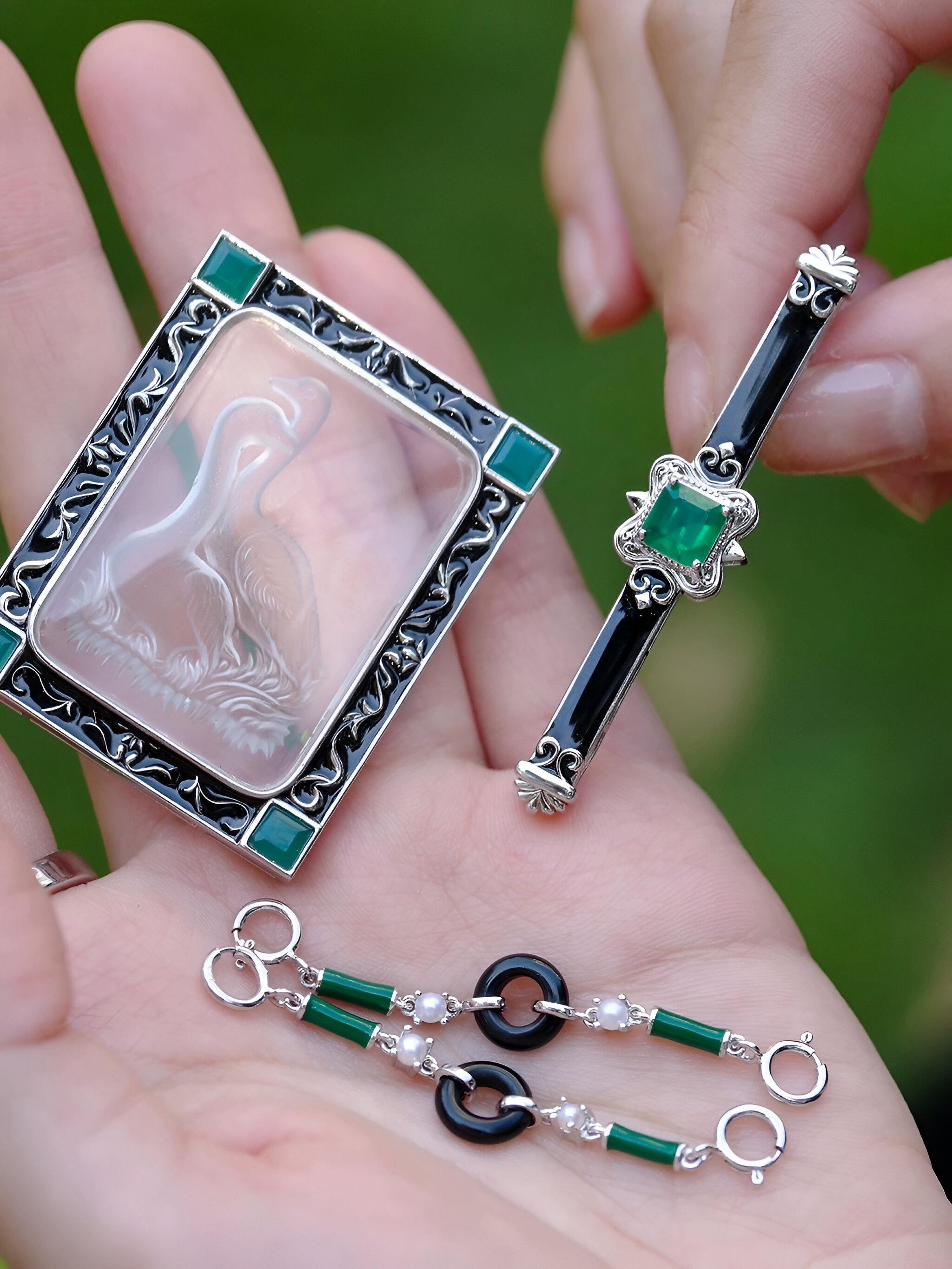 A rare find for the discerning collector. This exquisitely crafted Art Deco jewelry set is more than adornment—it’s wearable art. Designed to be worn as either a brooch or pendant, the piece features a masterfully carved intaglio glass panel depicting a serene crane, framed in rich enamel detailing and vintage glass inlays reminiscent of emerald and onyx.