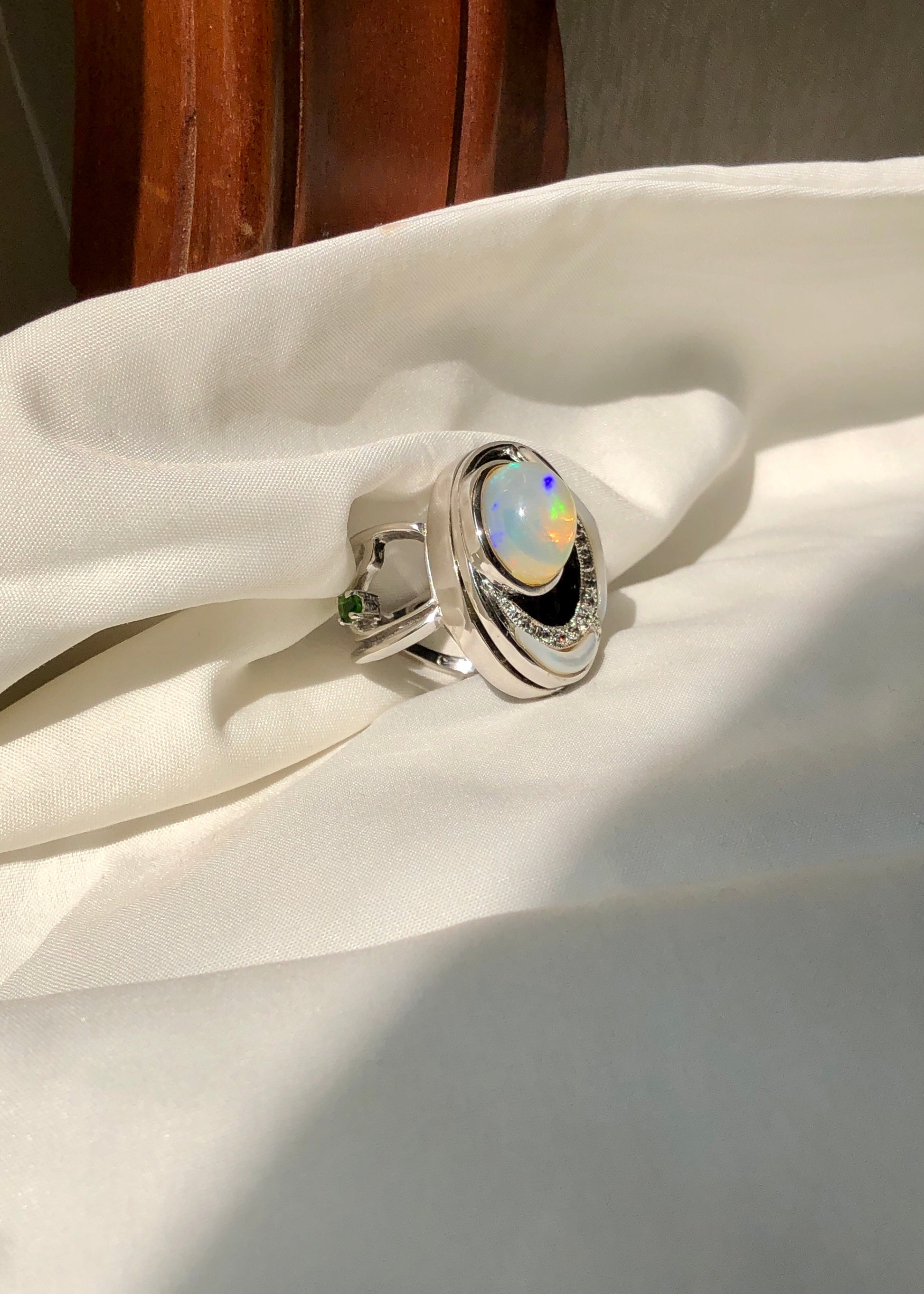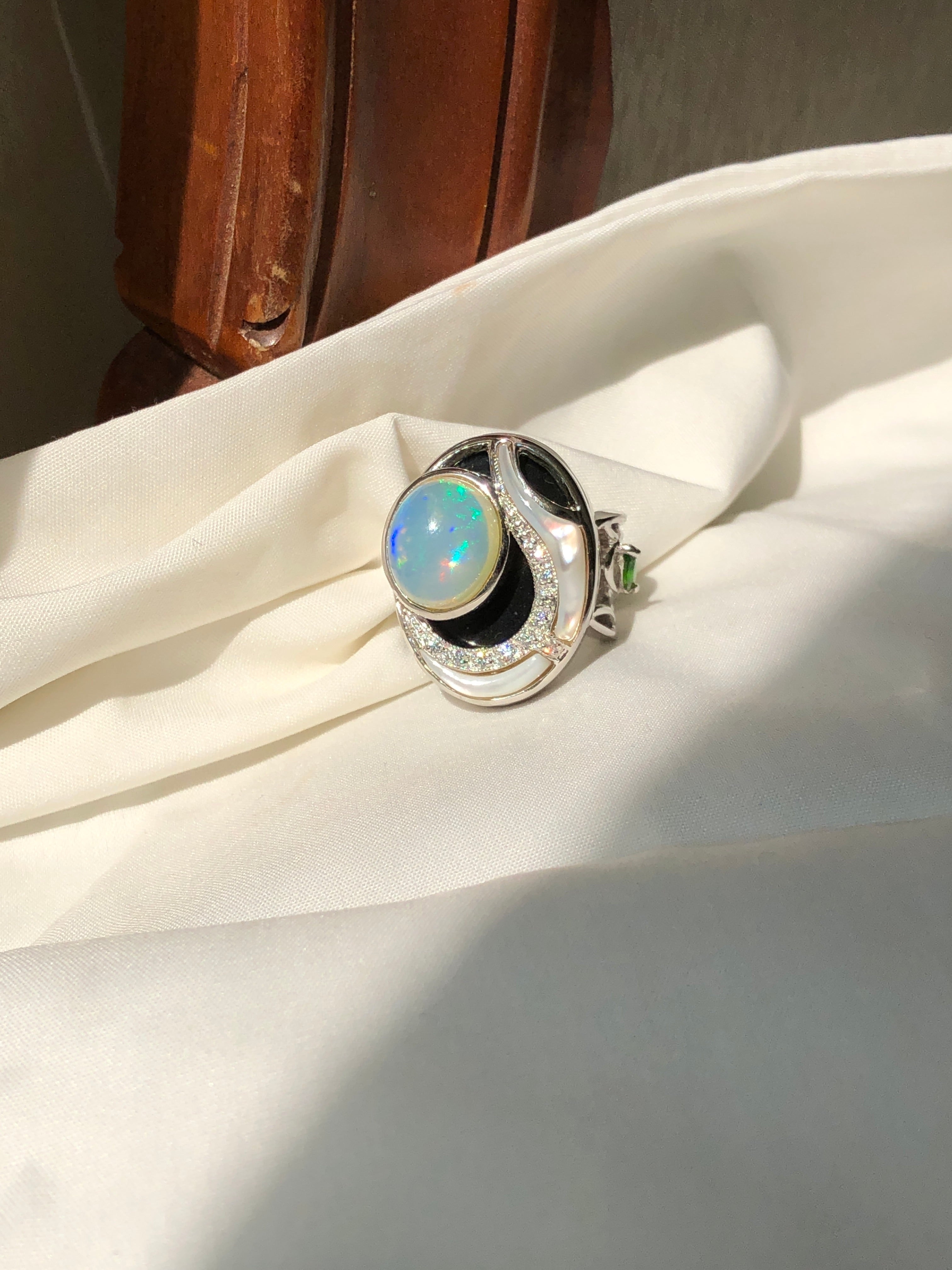 This stunning statement ring showcases a cabochon opal set beneath onyx, accented with Mother of Pearl carvings, pavé clear sapphires, and two chrome diopsides on the band. Its exquisite craftsmanship exudes timeless sophistication and luxury.