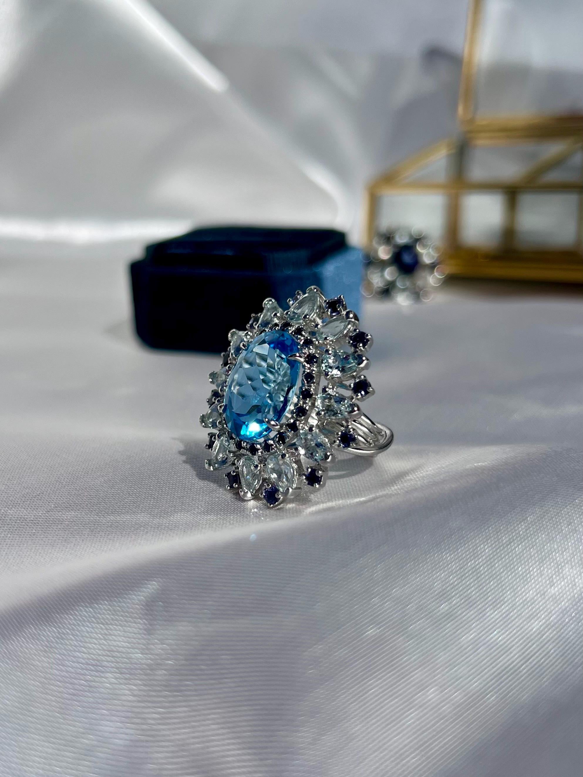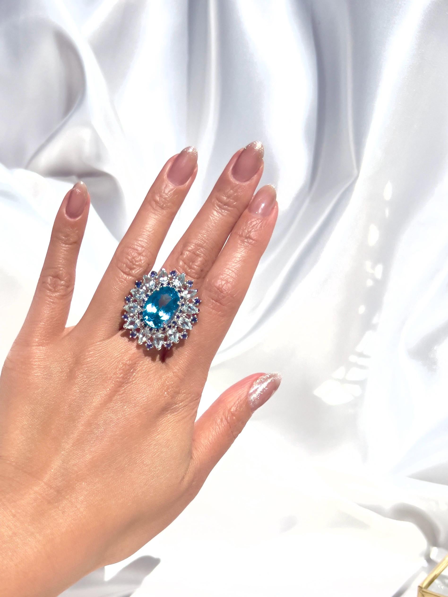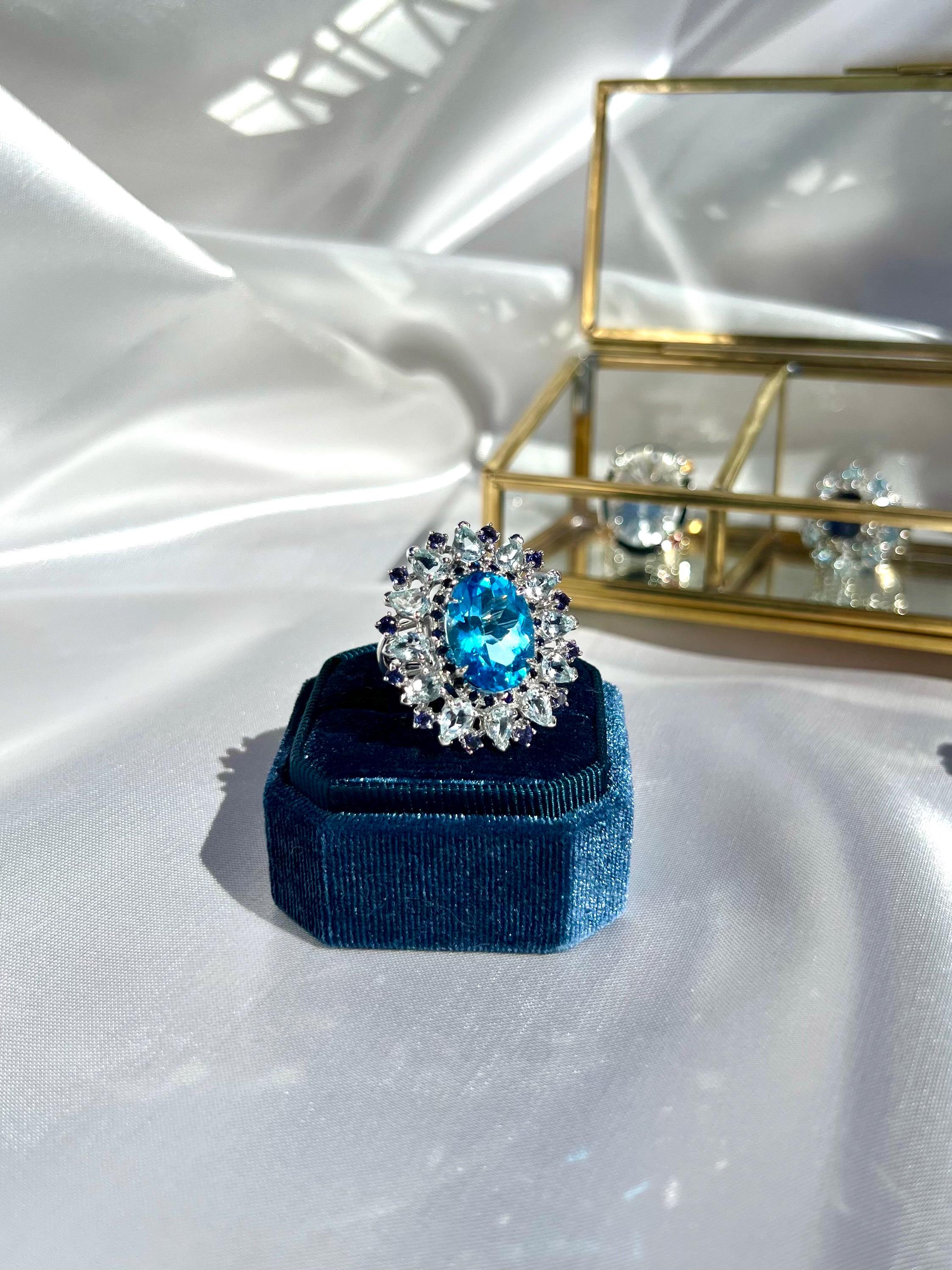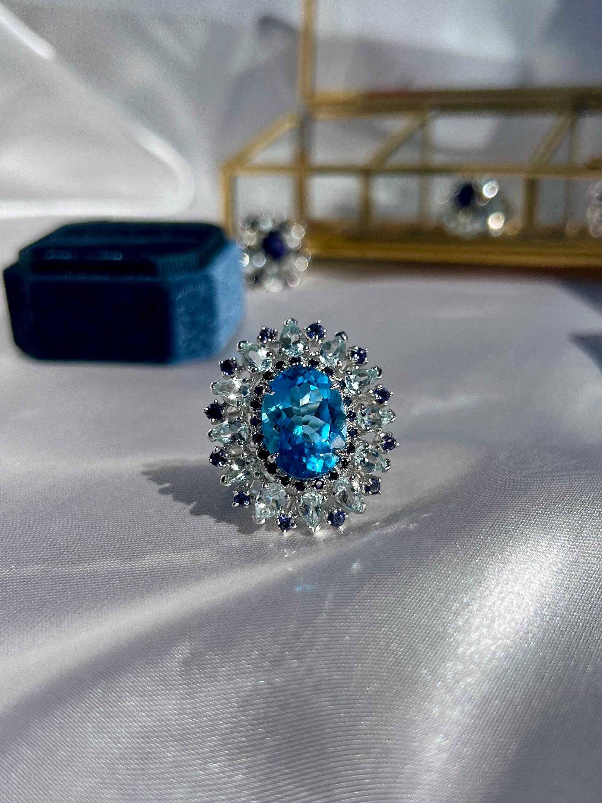 Dive into the depths of elegance with this enchanting one-of-a-kind Queen of the Ocean-inspired cocktail ring. The radiant centerpiece—a London Blue Topaz—shimmers like the heart of the sea, surrounded by a breathtaking halo of aquamarine gemstones and icy blue sapphires, evoking the serene beauty of ocean waves under the sunlit sky. This handmade 18K gold masterpiece captures the essence of regal sophistication and the mysterious allure of the sea, making it an unforgettable statement piece. Perfect for those who cherish the ocean’s tranquility and its untamed splendor, this ring celebrates the eternal connection between elegance and nature.