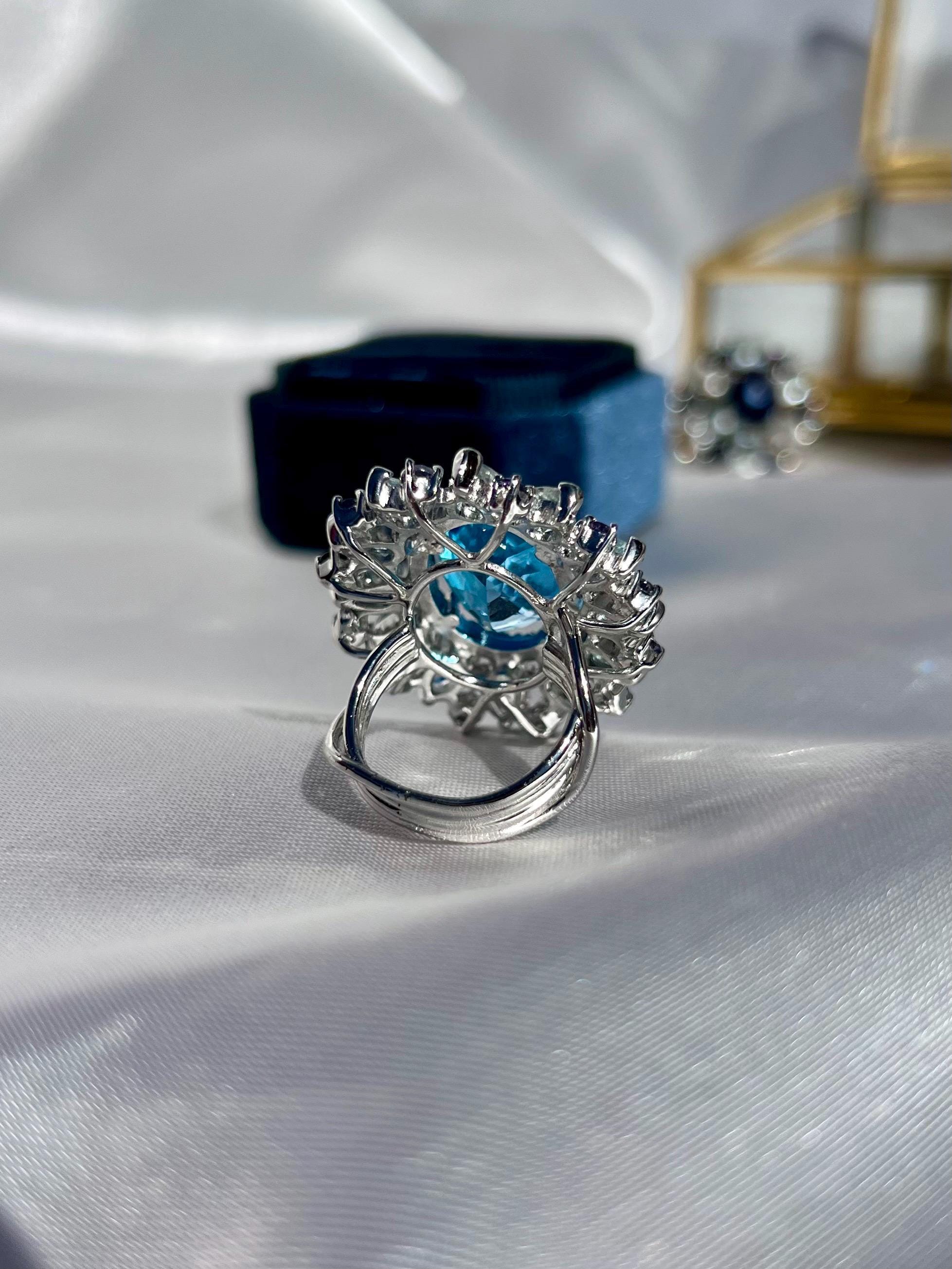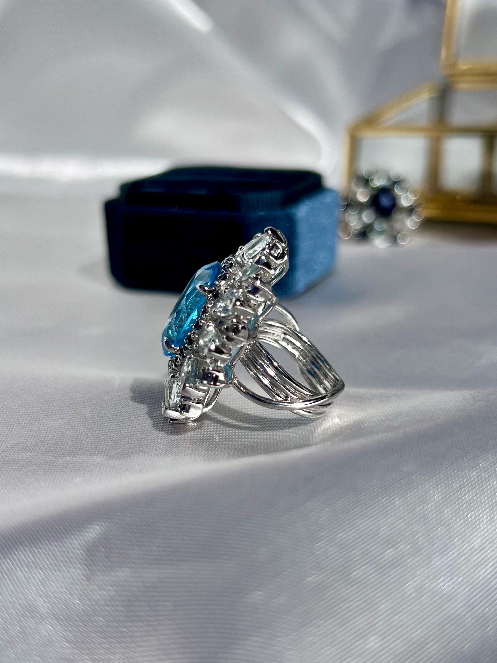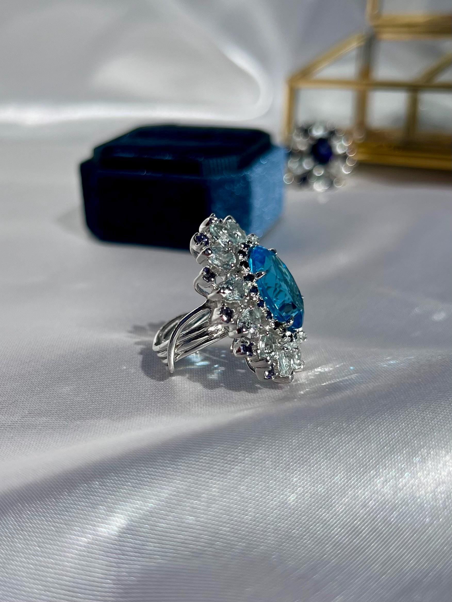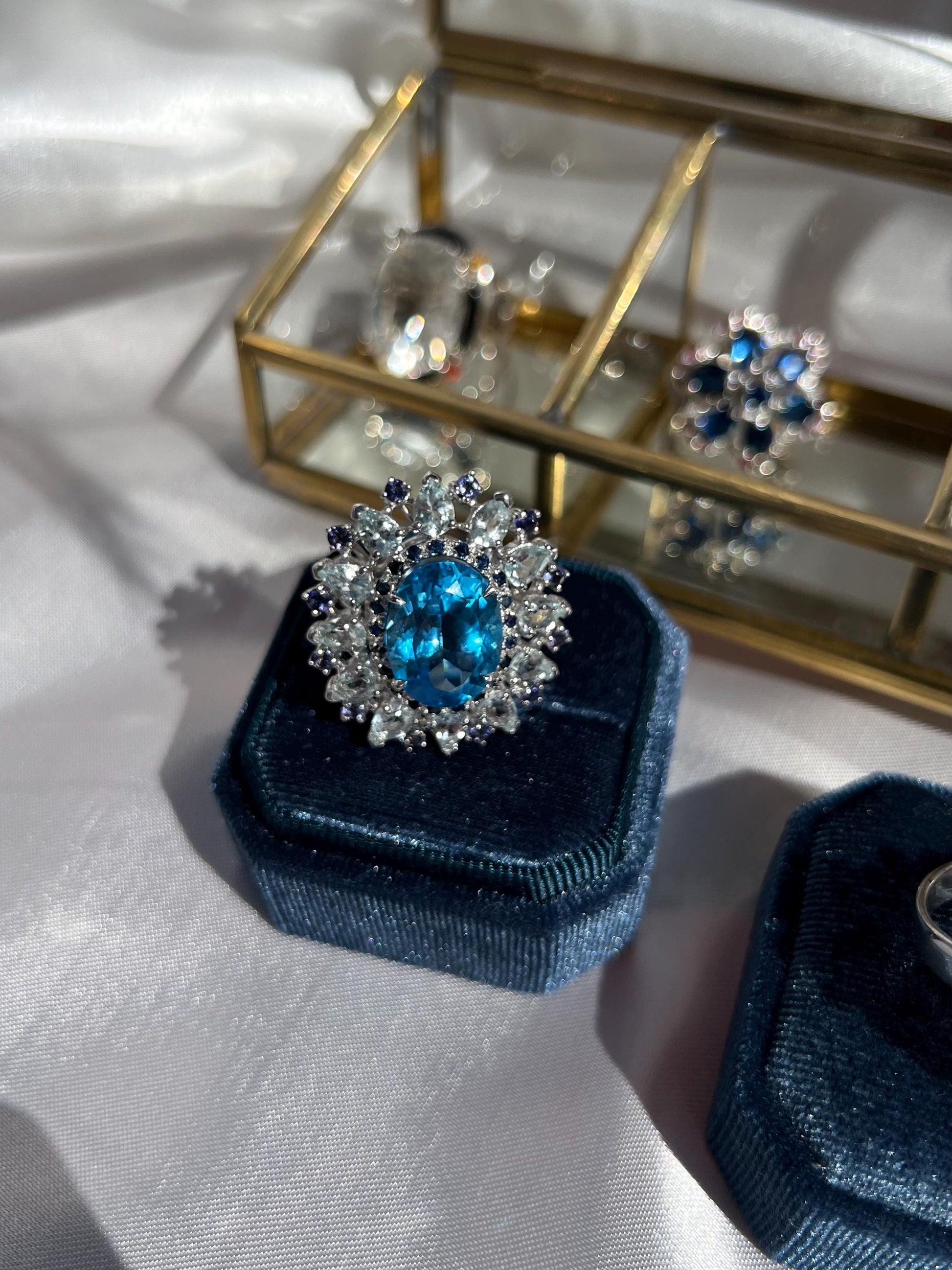 Dive into the depths of elegance with this enchanting one-of-a-kind Queen of the Ocean-inspired cocktail ring. The radiant centerpiece—a London Blue Topaz—shimmers like the heart of the sea, surrounded by a breathtaking halo of aquamarine gemstones and icy blue sapphires, evoking the serene beauty of ocean waves under the sunlit sky. This handmade 18K gold masterpiece captures the essence of regal sophistication and the mysterious allure of the sea, making it an unforgettable statement piece. Perfect for those who cherish the ocean’s tranquility and its untamed splendor, this ring celebrates the eternal connection between elegance and nature.