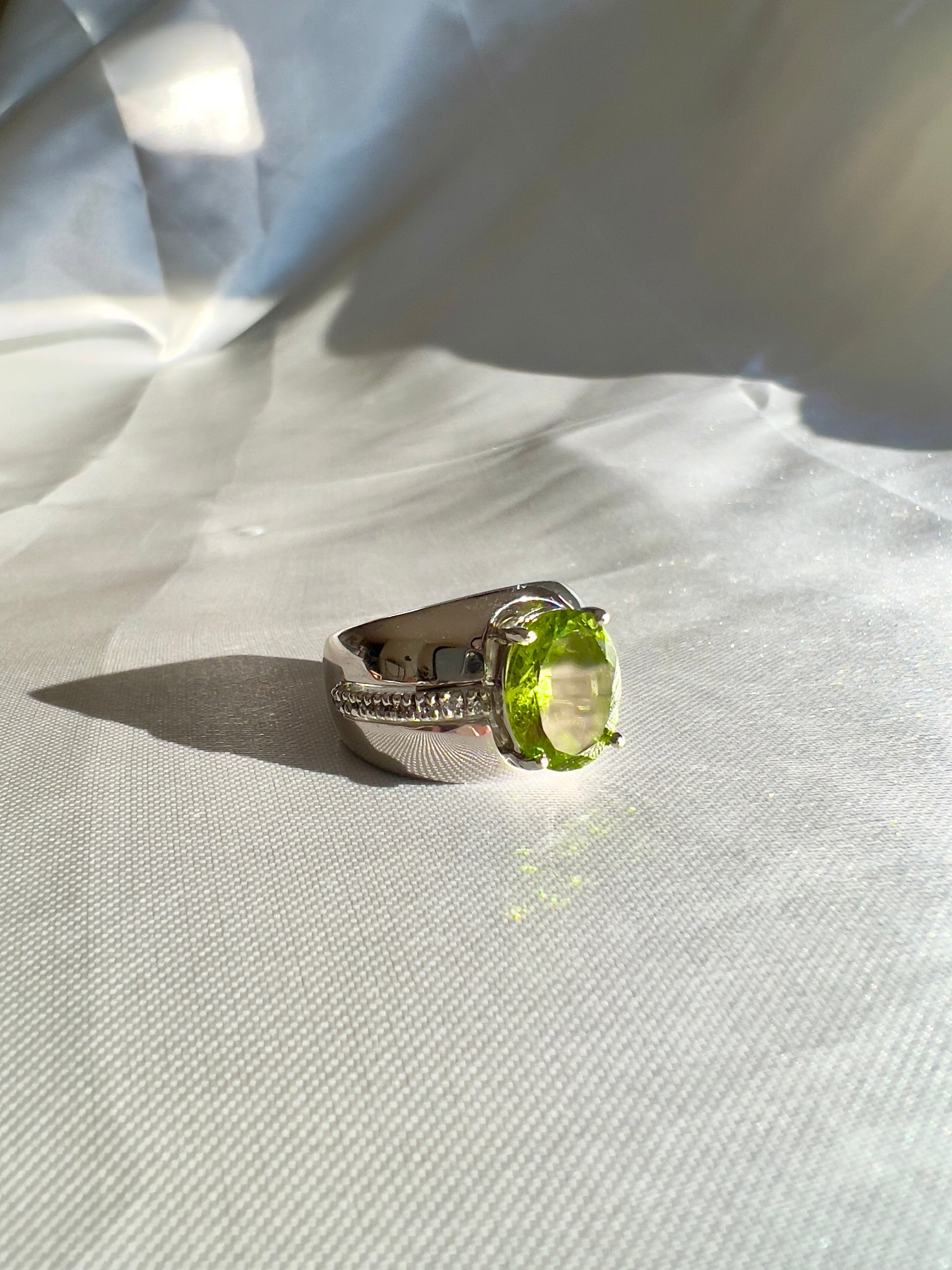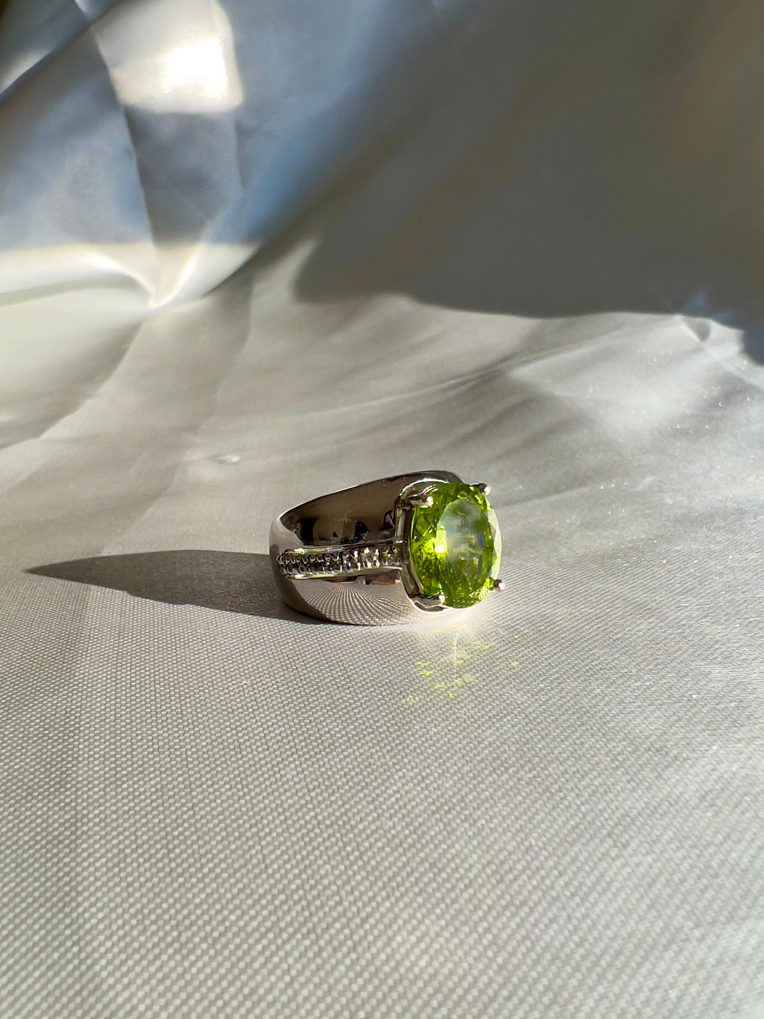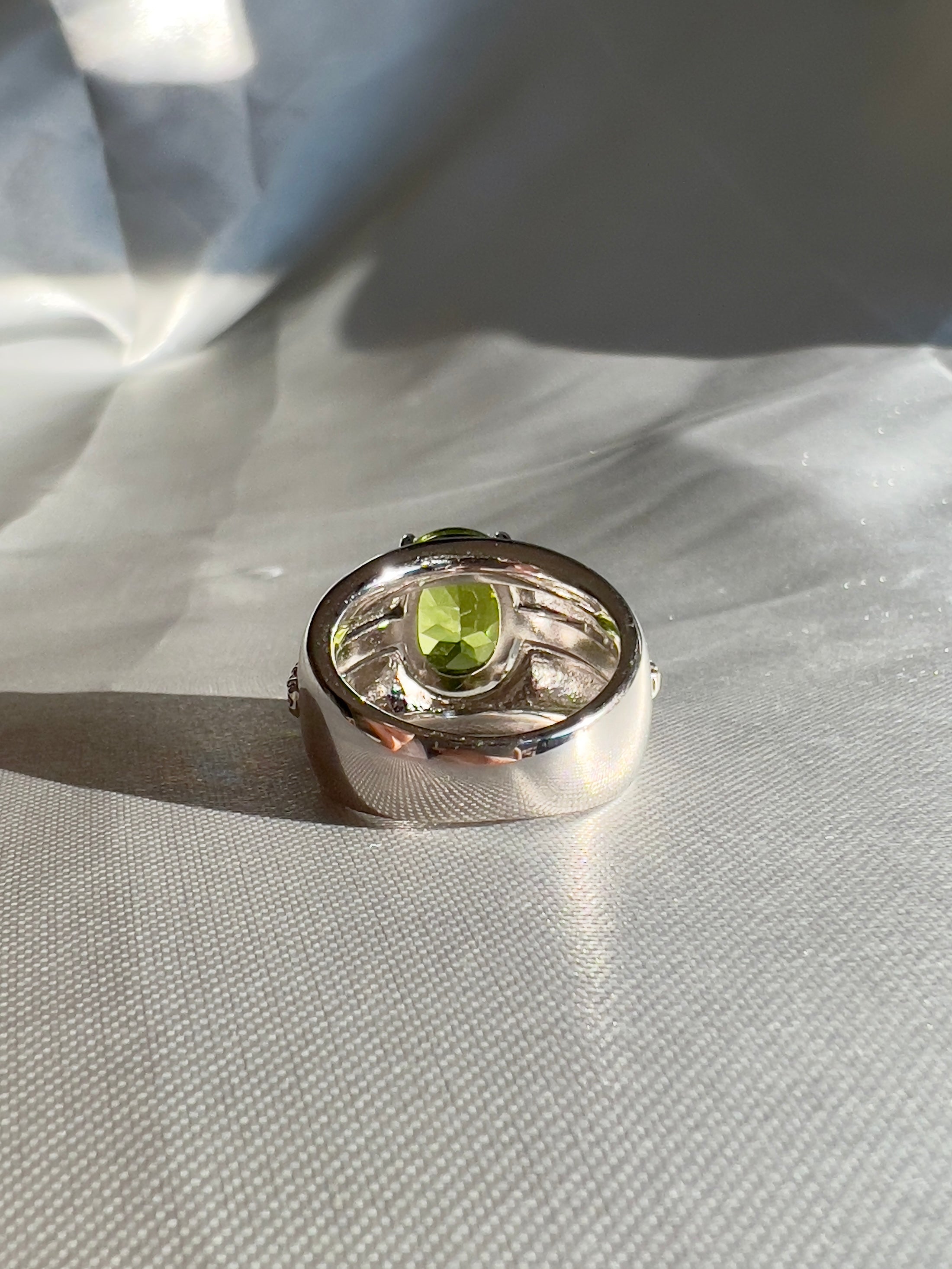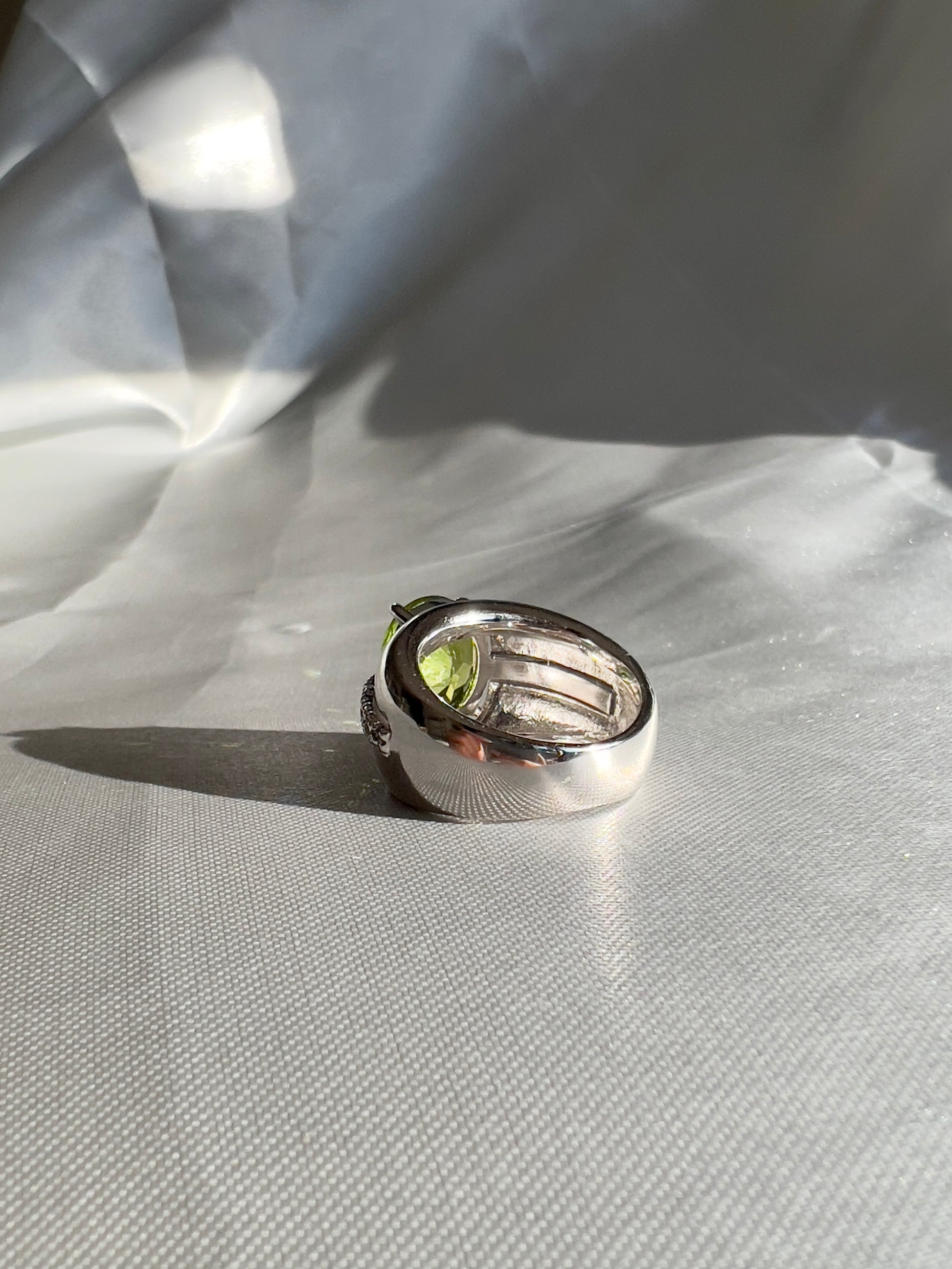 Edgy and sleek, this cocktail ring features a grade A, eye-clean, lime green oval-cut 6-carat peridot from Myanmar. Crafted with care by our family jeweler in Taipei, Taiwan, 20 years ago, this ring's lively sparkle and unique design make it a standout addition to your collection. It pairs effortlessly with both casual denim and party outfits, offering versatile elegance for any occasion.