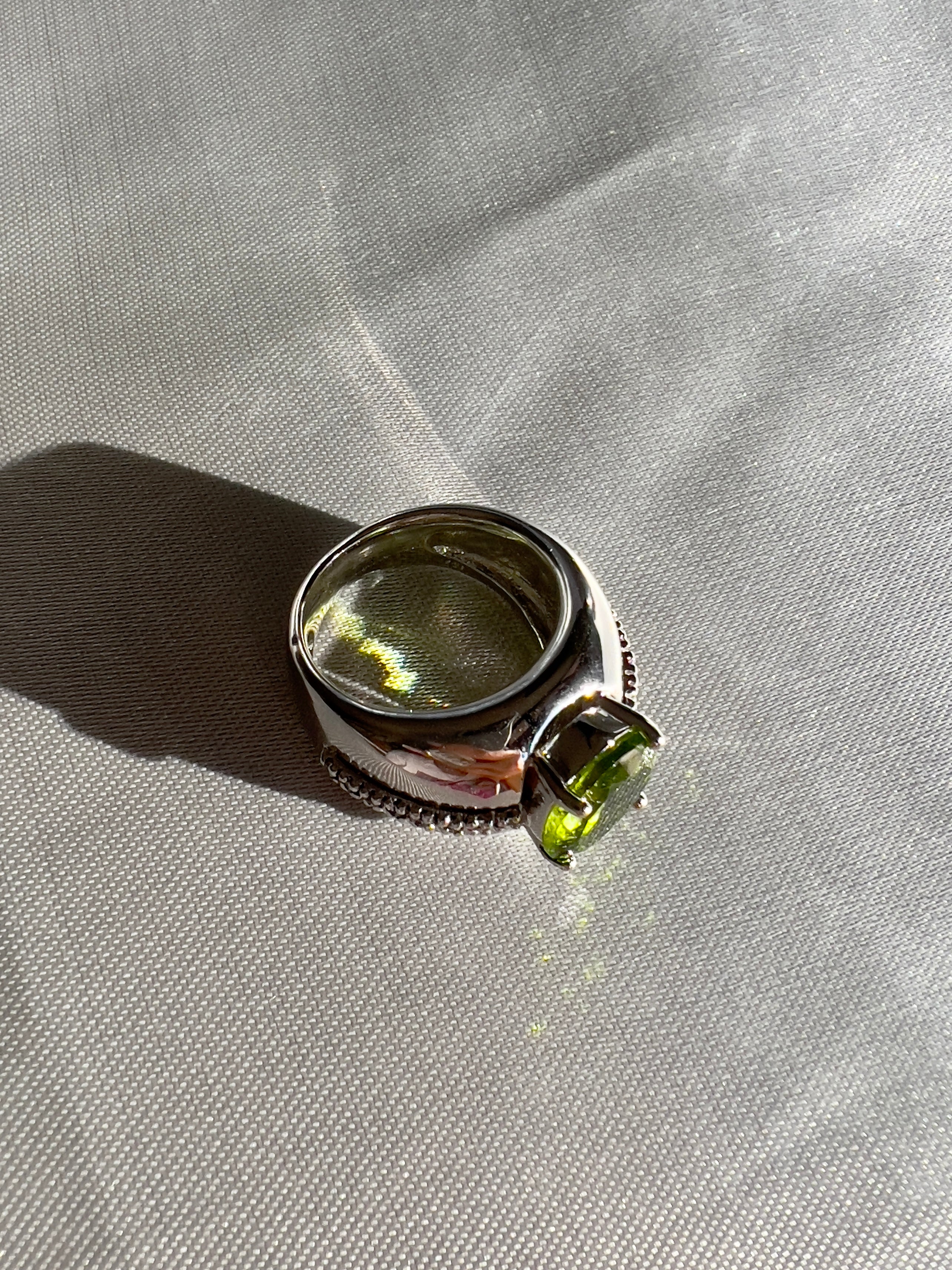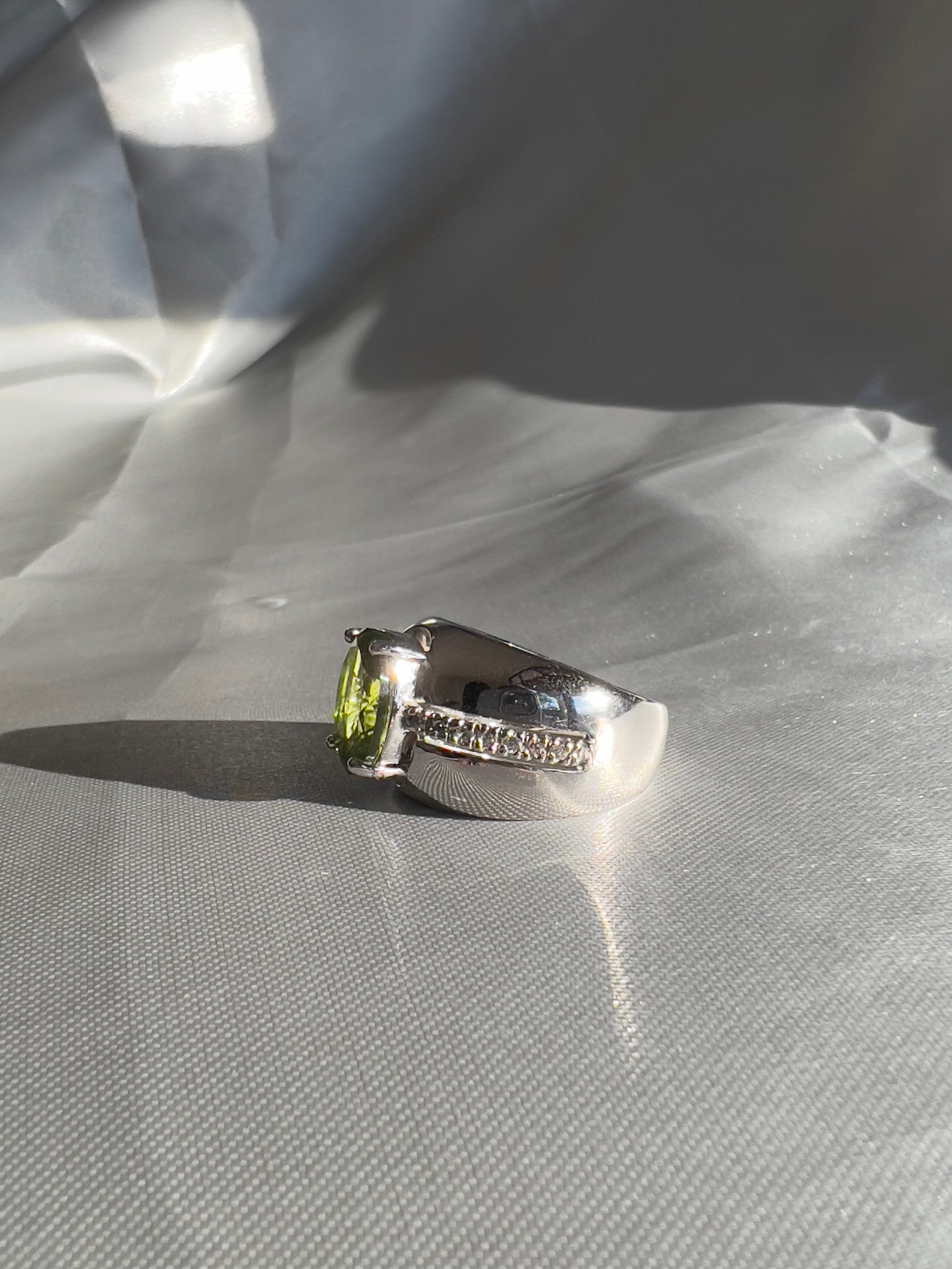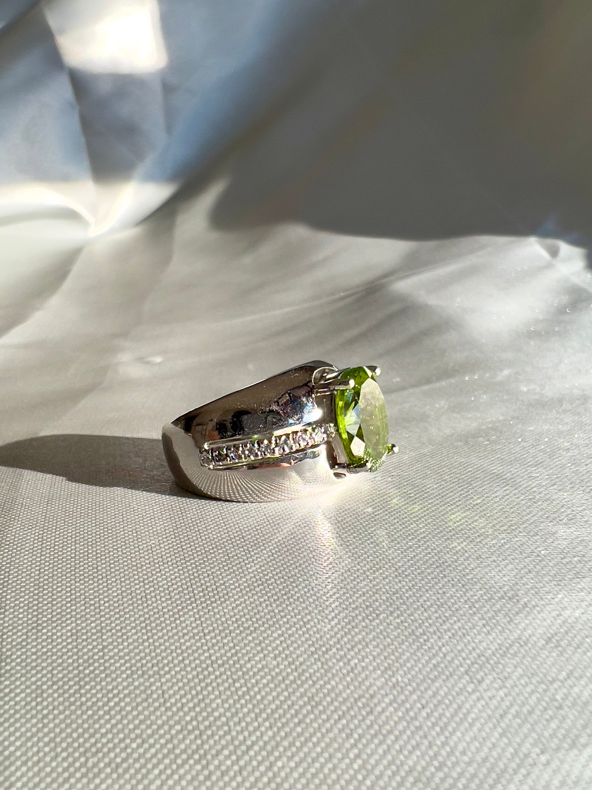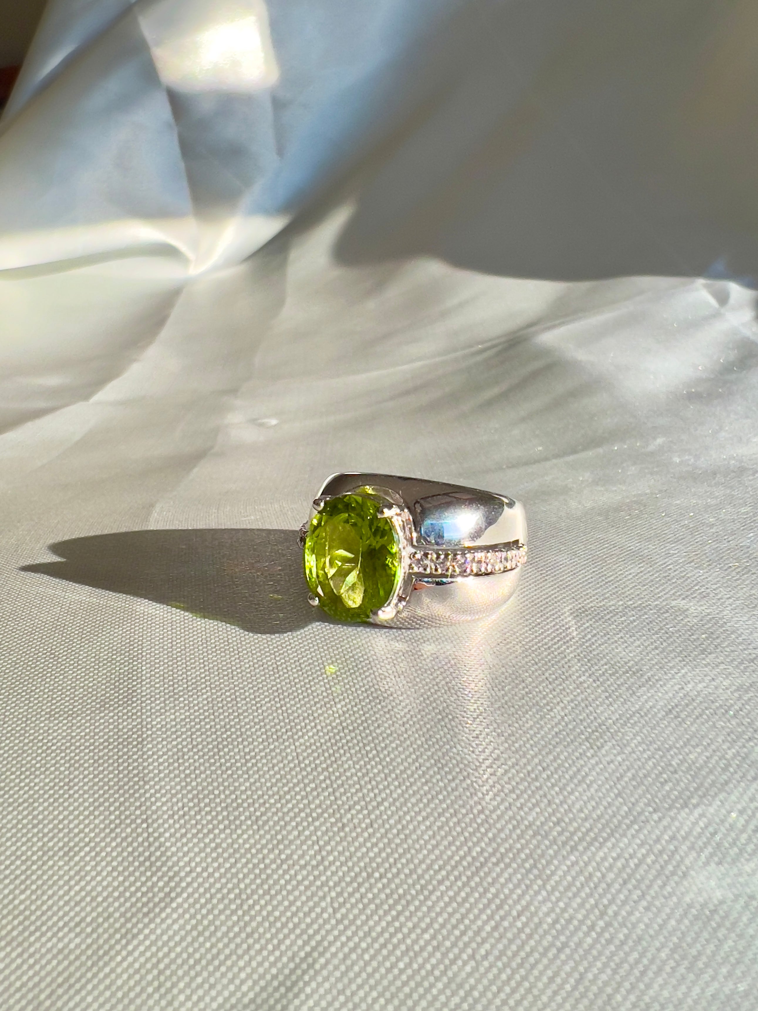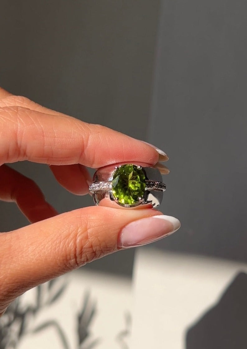 Edgy and sleek, this cocktail ring features a grade A, eye-clean, lime green oval-cut 6-carat peridot from Myanmar. Crafted with care by our family jeweler in Taipei, Taiwan, 20 years ago, this ring's lively sparkle and unique design make it a standout addition to your collection. It pairs effortlessly with both casual denim and party outfits, offering versatile elegance for any occasion.
