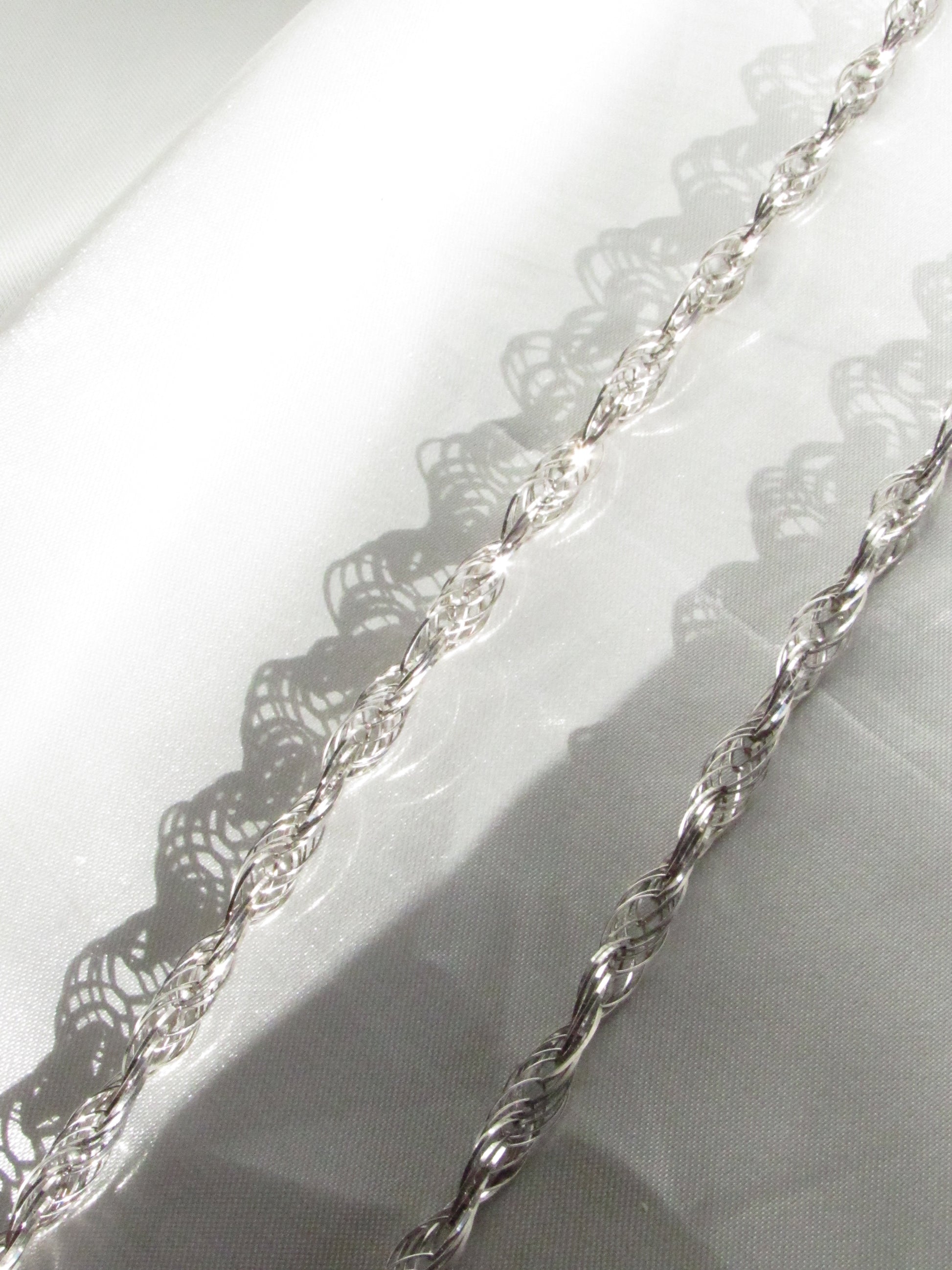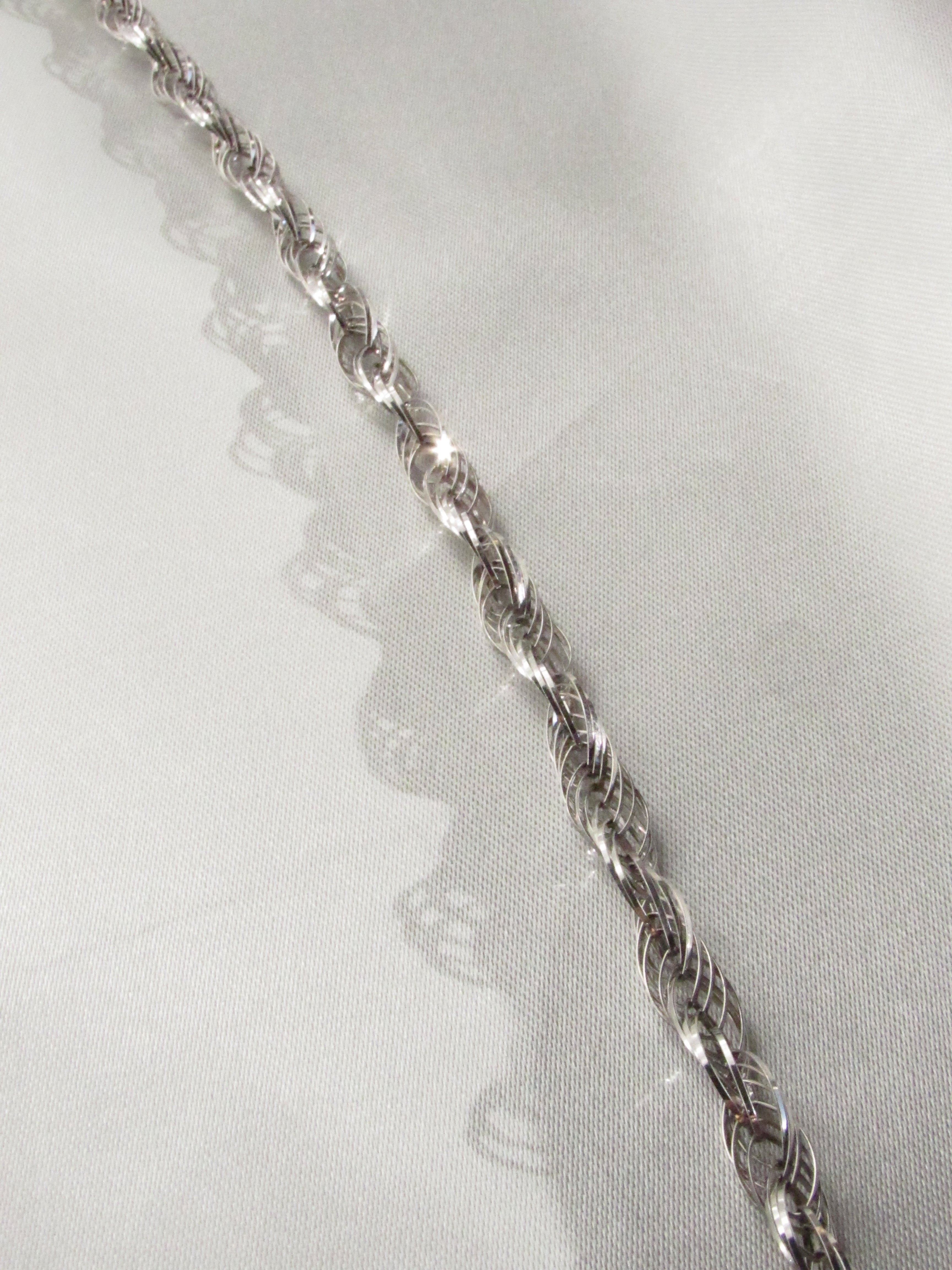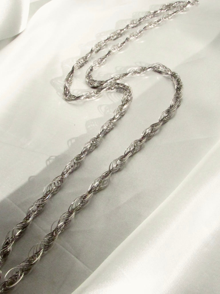 The chain necklace features a unique design that creates a silky and shiny effect. It is crafted from 14k white gold vermeil over sterling silver in a twisted chain style. Wear it alone for a classic look, separate the chain to create a choker style, or layer it with other chains for a personalized touch.