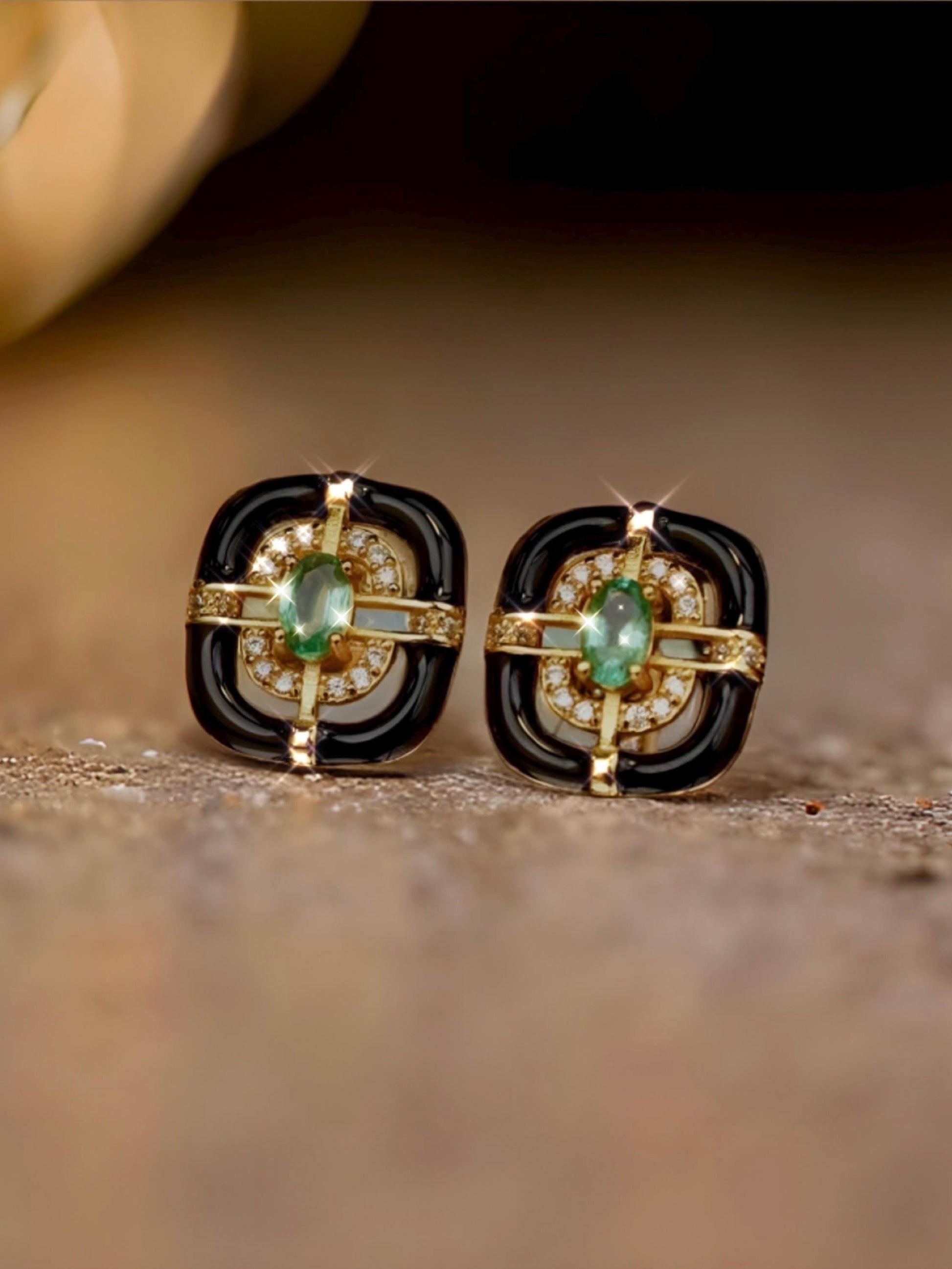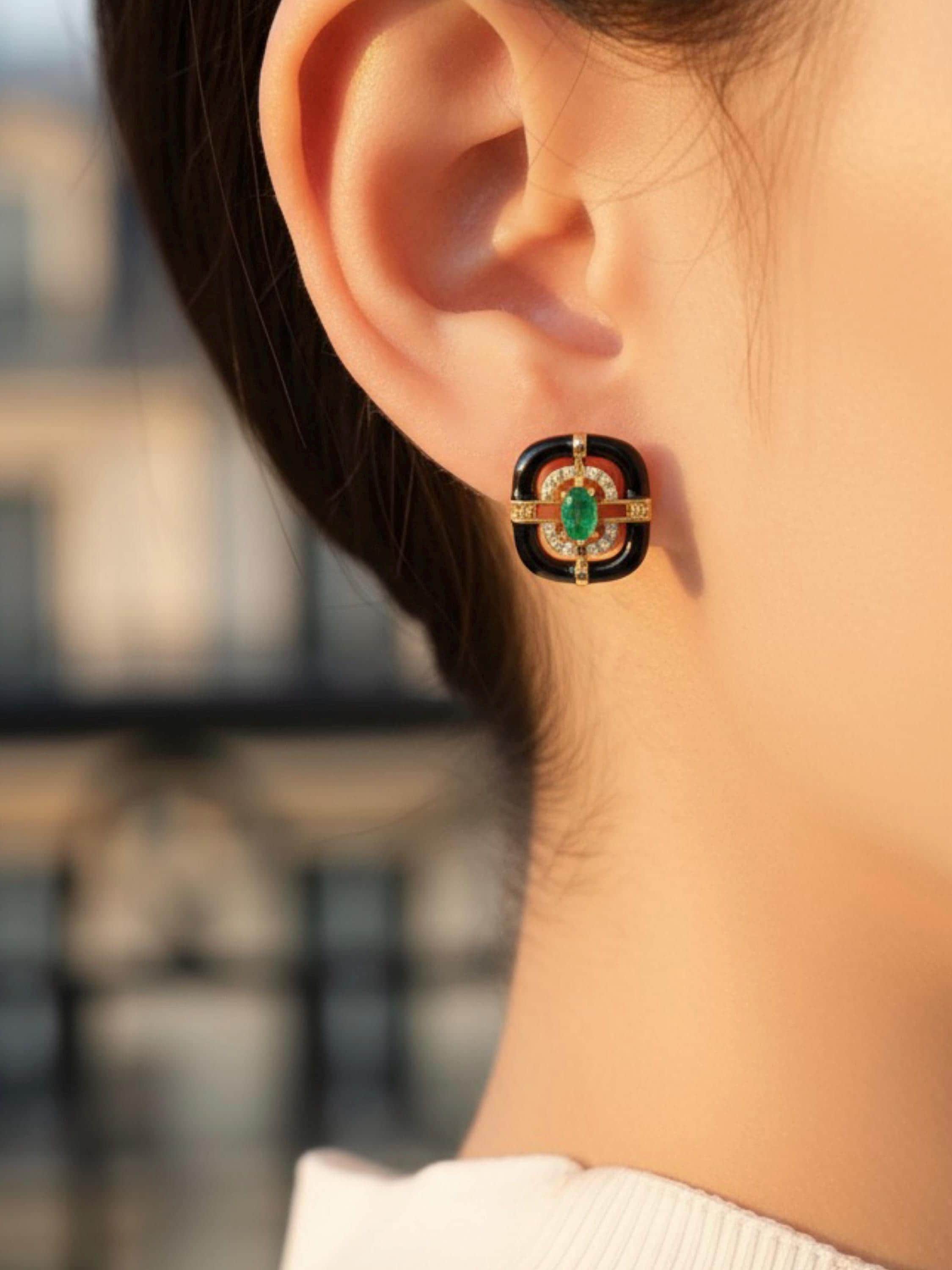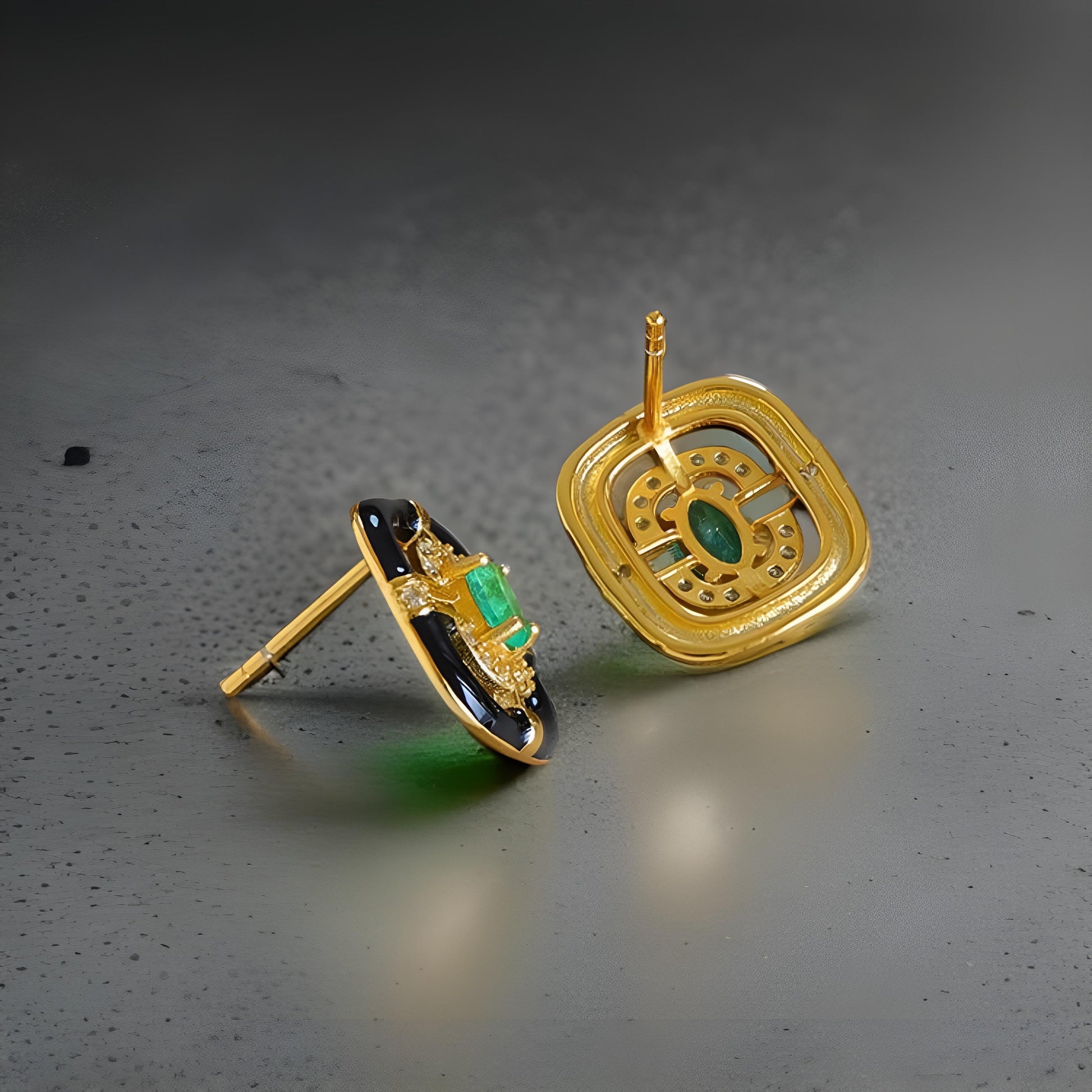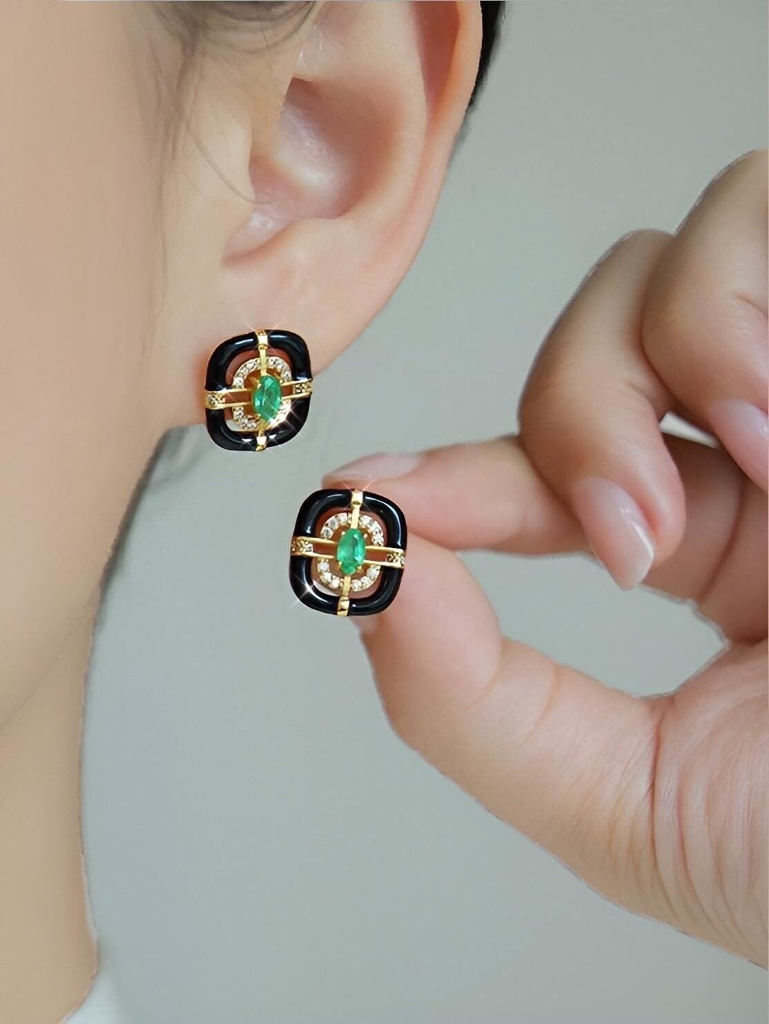 Emerald 18k Gold Vermeil Stud Earrings for Women,Art Deco Earrings, Natural Emerald Earrings, Colombian Gemstone, French Enamel Earrings
